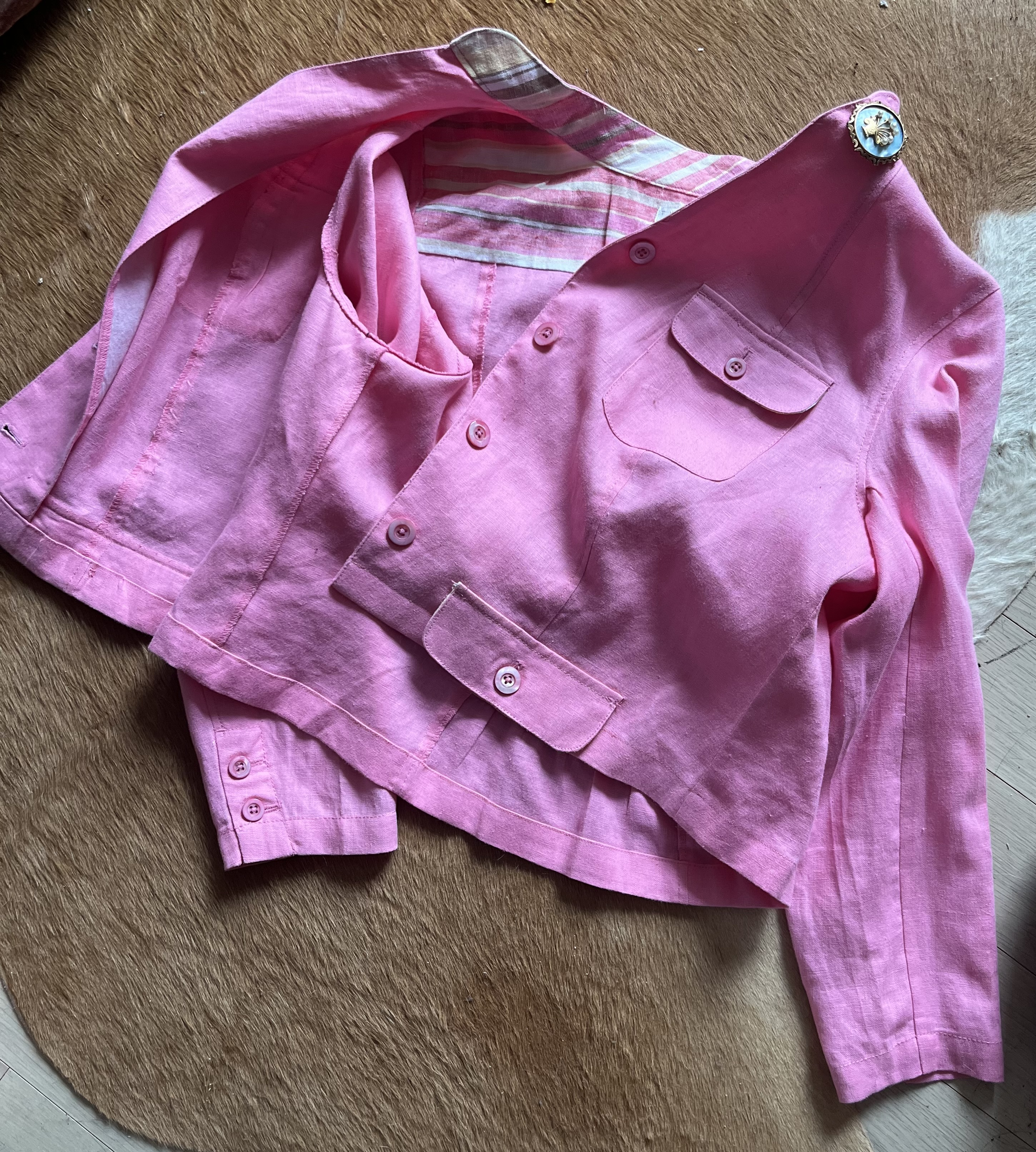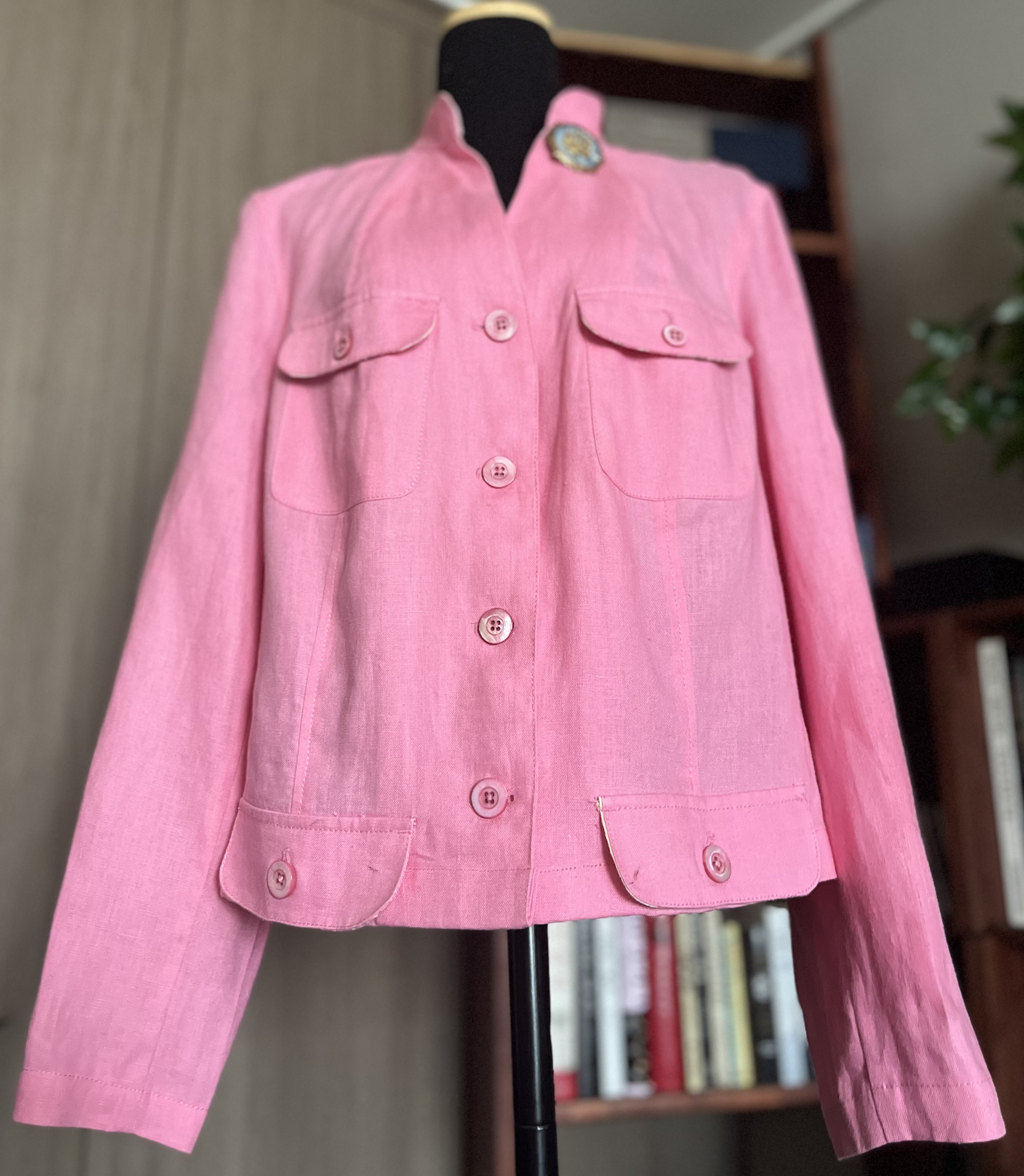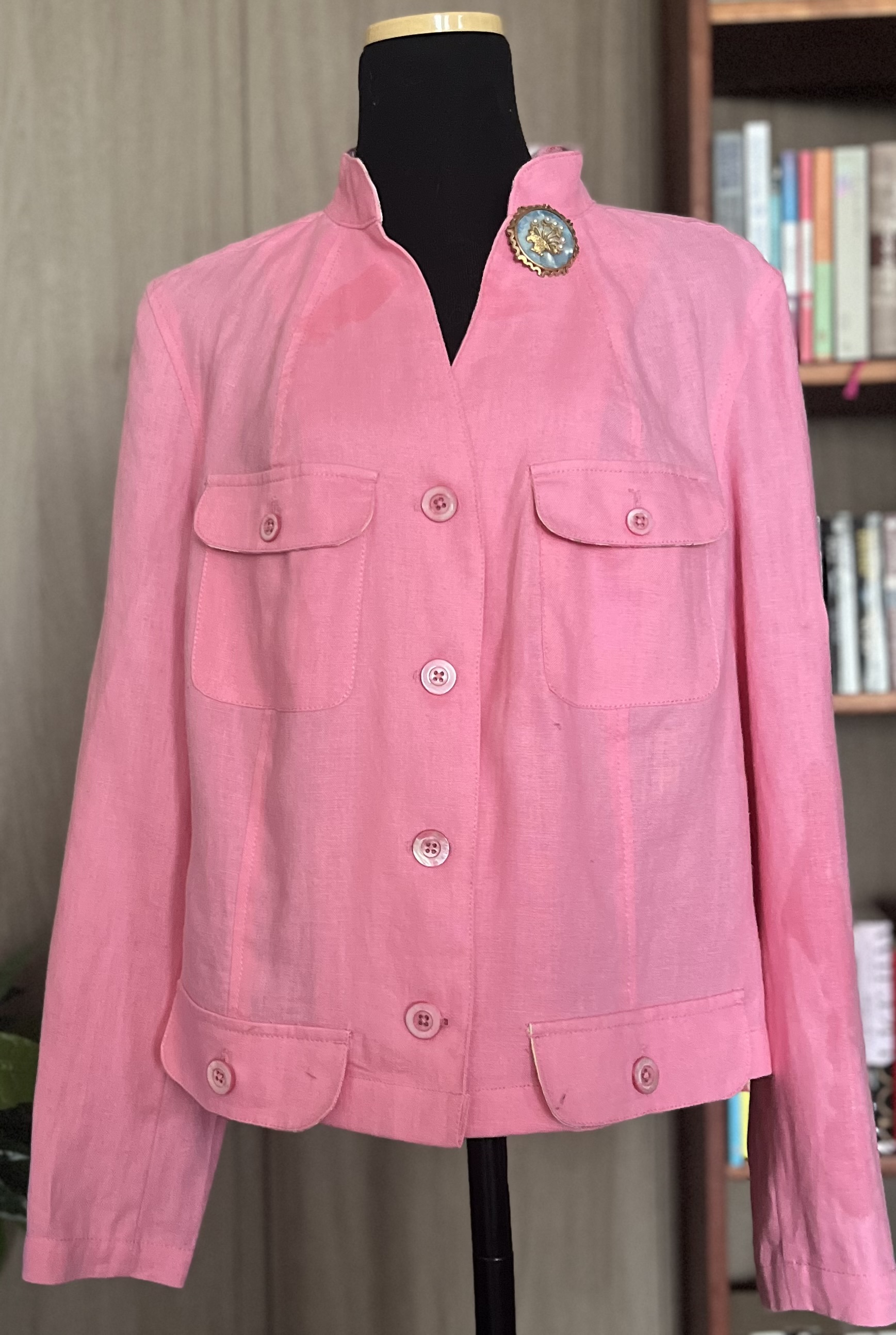 핑크린넨 재킷이예요 우선 목부분 누렇게보여지는데요 입어서 목때가 낀 것이 아니고 원 컬러가 그러합니다 white tone 의 팬츠와 매치하면 시원해 보일것 같아요 같이 반다나도 활용해 보세요 리조트 룩 으로 센스넘쳐 보일겁니다 ! 날씬 55 size. 이 보다 더 새것같이 보일수 없는 컨디션!