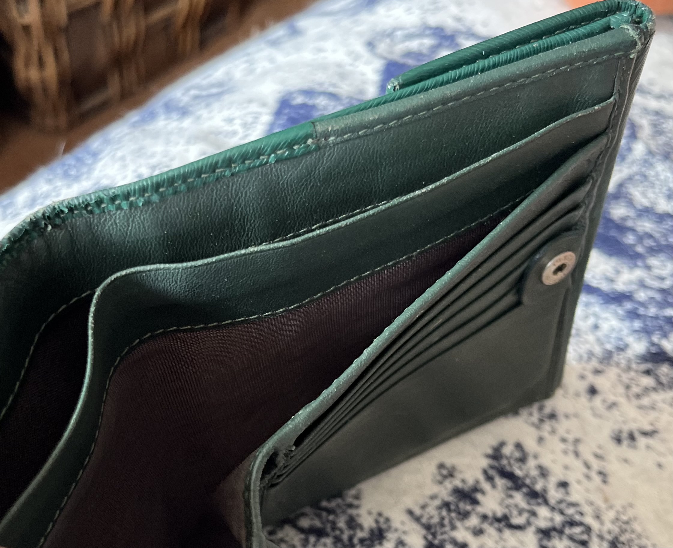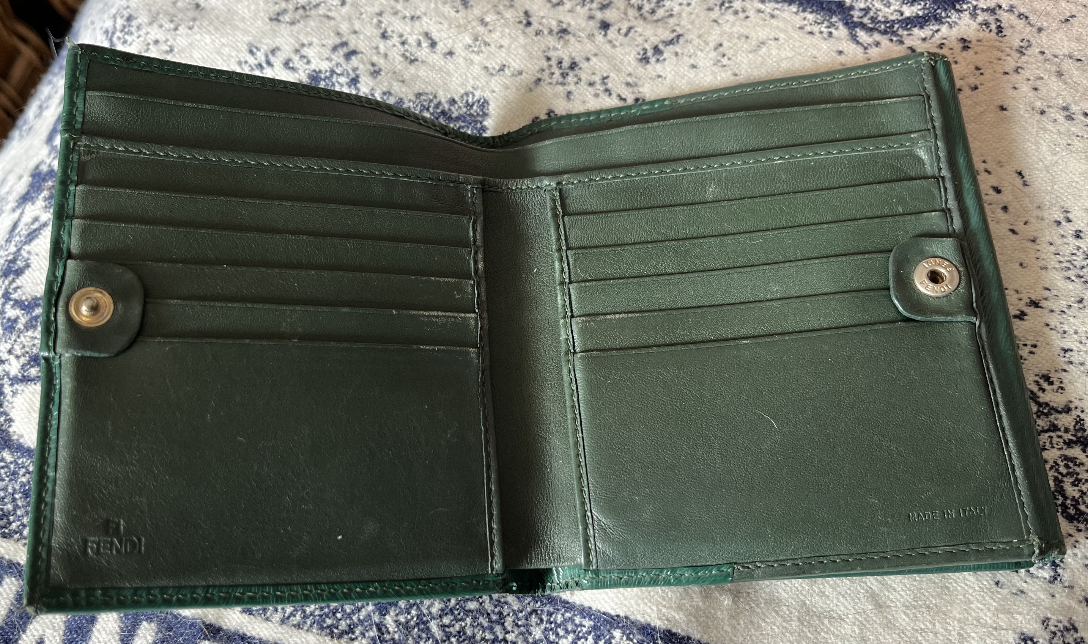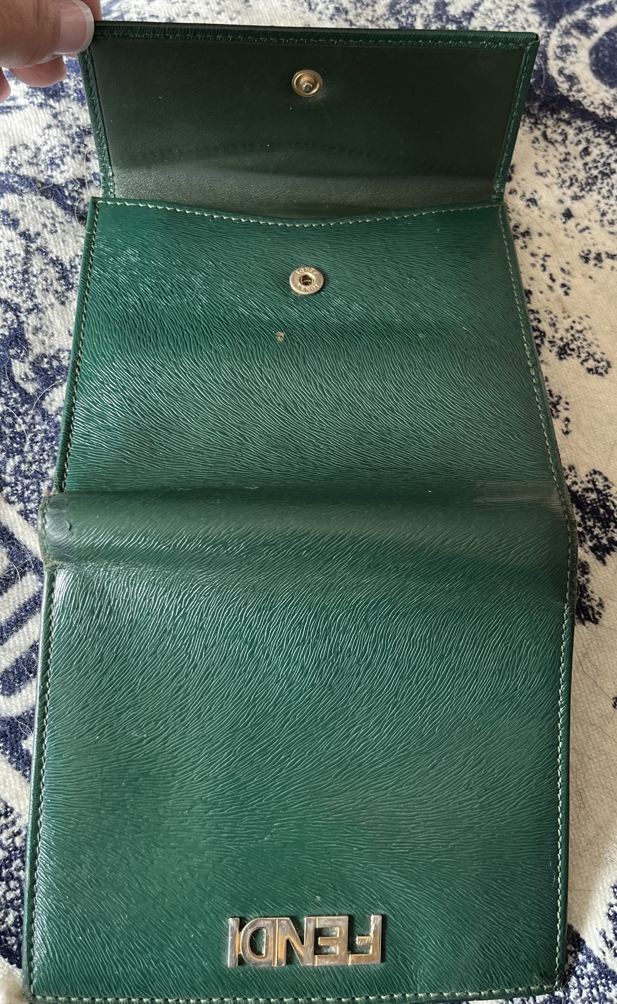 rare item 이죠 모든제품이 그러하듯이 ^^사용감 있습니다 녹색에 빠져있을때라 더 더욱 이뻐보였습니다 지인에게서 구매했어요 자신은 오래 사용했다며,,, 사진그대로에요 가죽의 스크래치나 홀 뭐 이런것 없습니다 수납할곳이 많아 반지갑이라도 유용하게 쓰일거라 사려됩니다 실색도 - 사진과 똑같음- 이쁘고 손때에의해 부들부들 매끄럽습니다 세로 11cm 가로 13cm 지갑을 펼쳤을때 22cm 그리 작지않은 사이즈라 그립감도 좋아요 지갑 안쪽으로 펜디로고 찍혀있습니다