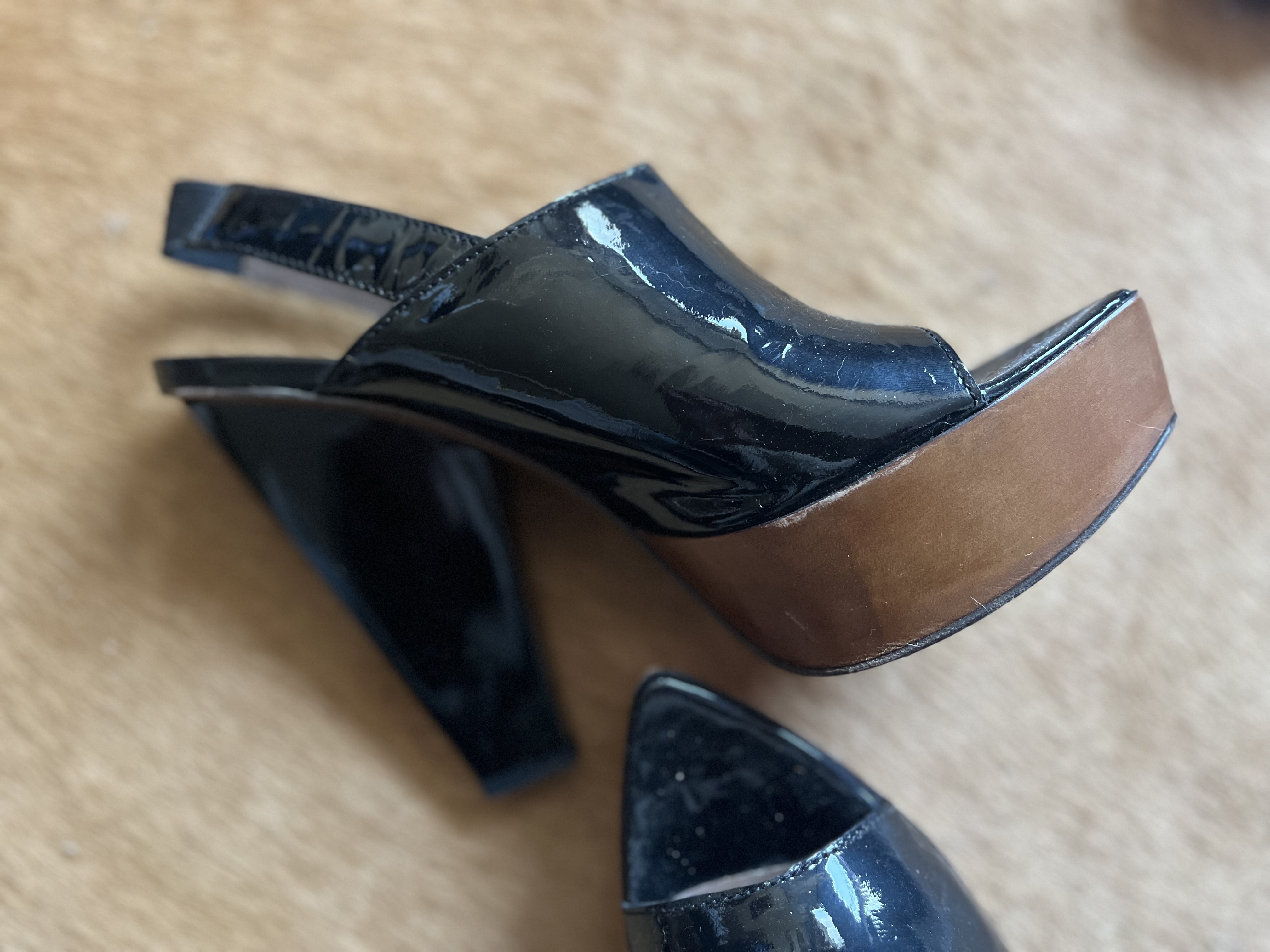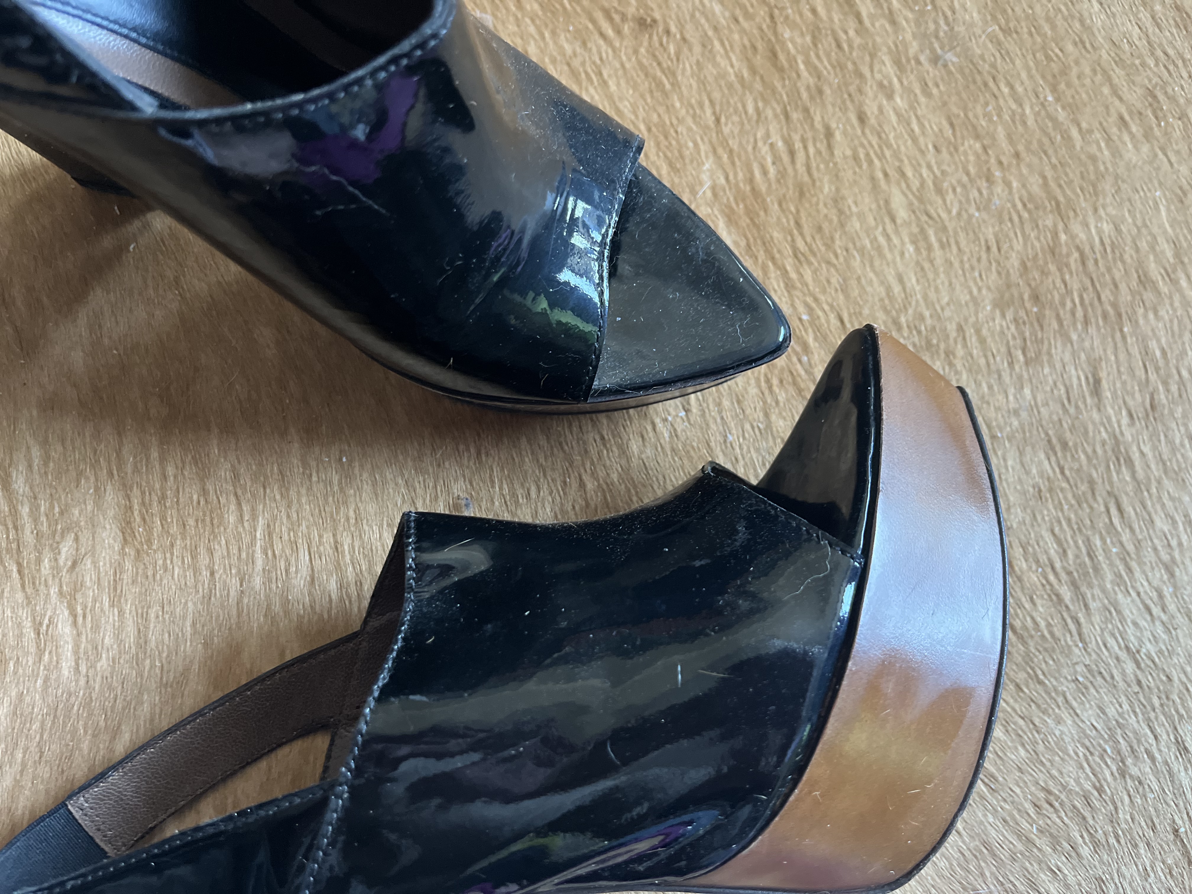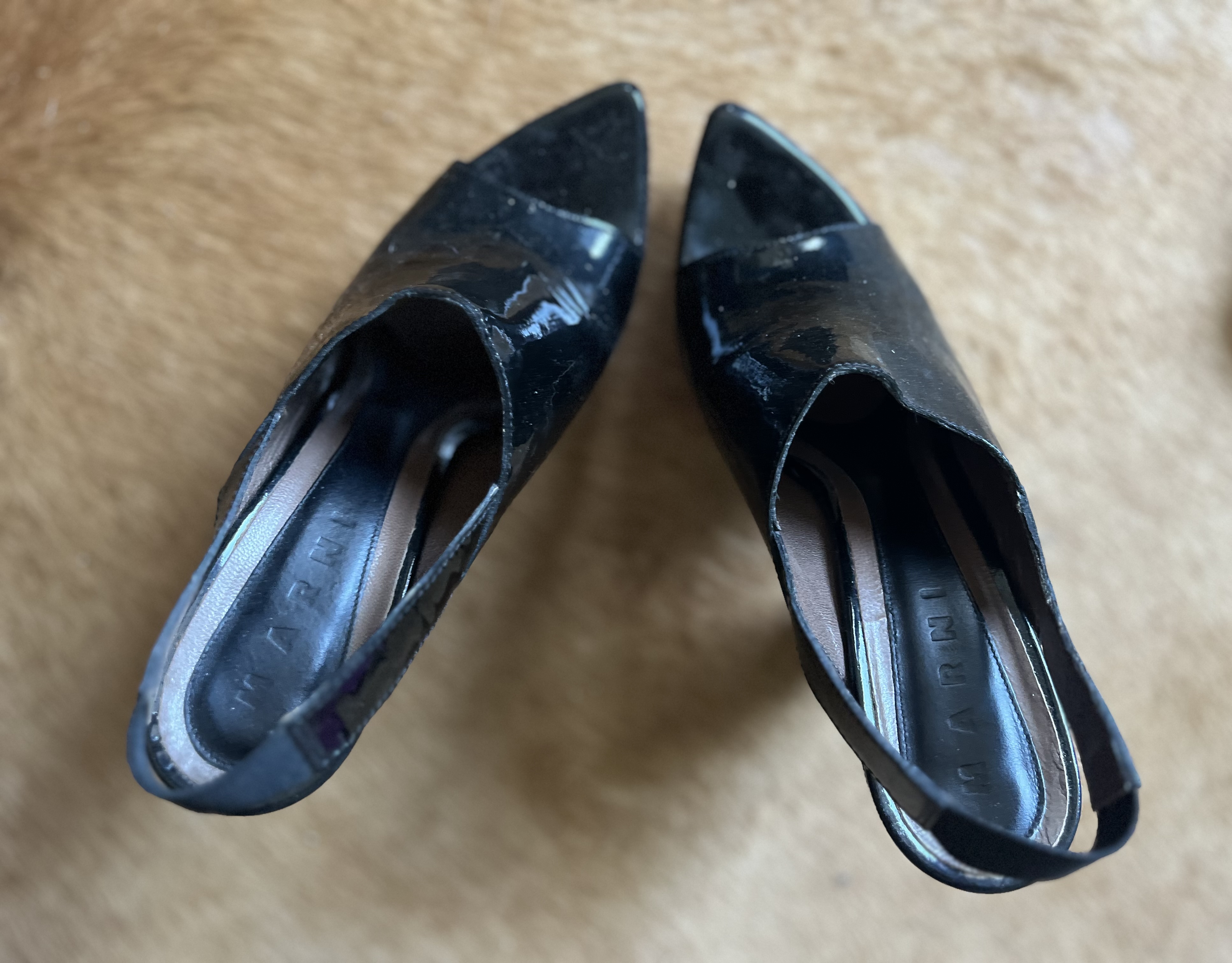 거 참 왜이리 후줄근하게 보이는지 맘에 안듭니다 제가 사진을 잘 못찍어서 표현상태가 그러기도 하겠지만요 이 마르니 플랫폼슈즈도 코 부터 쫘악 잘 빠진슈즈예요 바닥에만 사용흔적보이고 다른곳은 컨디션 좋습니다 슈즈뒷축을 밴디지로 만들었기에 까질염려는 하지않으셔도 될것 같습니다 37 size. 실물이 훨씬 깨끗하고 신으면 더 이쁠거예요