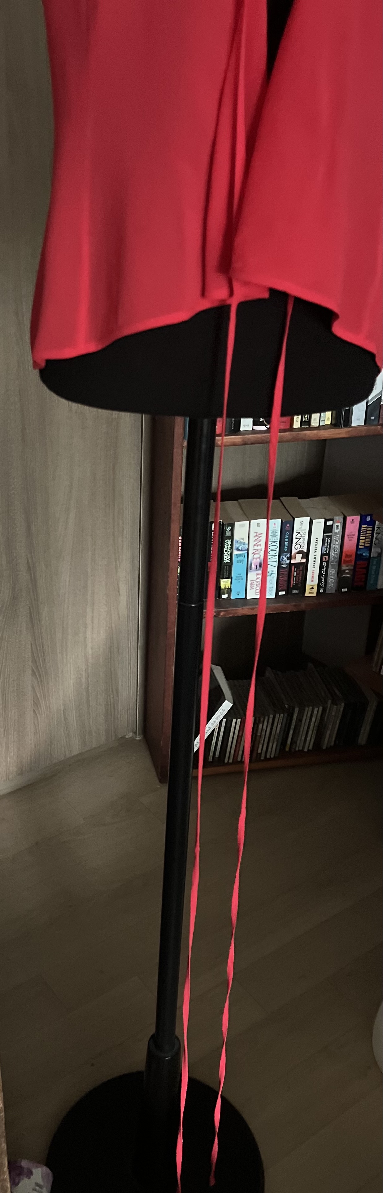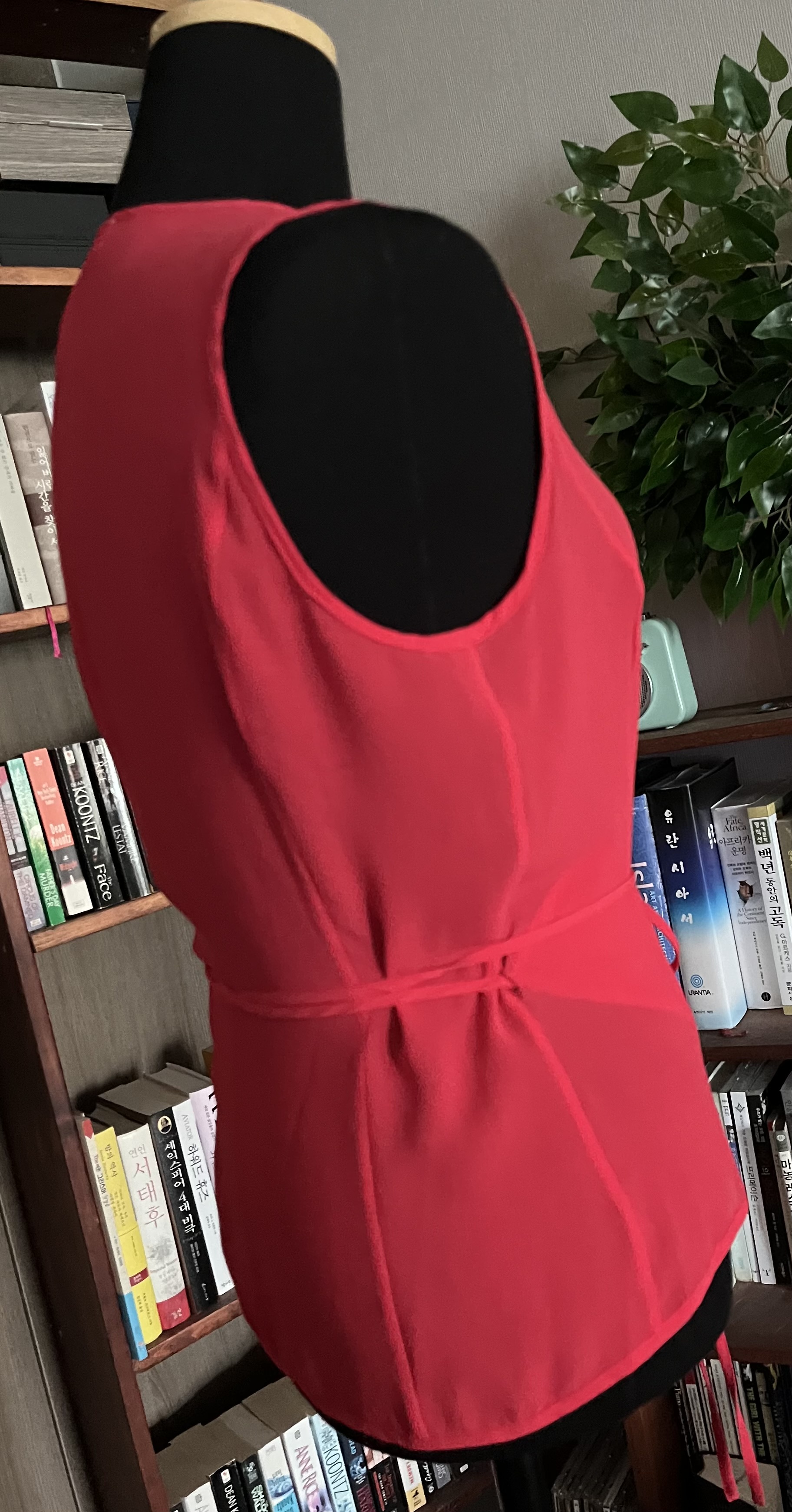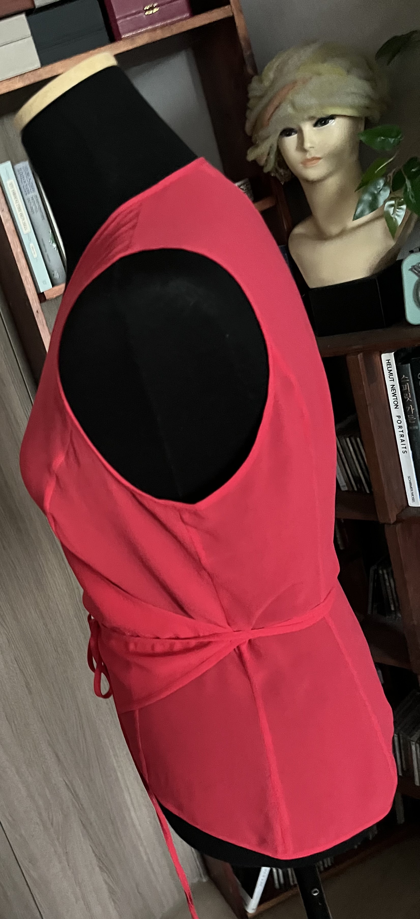 살짝 비칠거예요 셀린제품이예요 보다시피 빨강색이고 허리를 끈으로 둘러서 묶어입는 wrap shirt 입니다 고와요 사진 찍기전 옷을 언뜻 보았는데 허리춤에 천이 헤졌나 하고 끈깜짝했어요 이쁜옷이라 아까웠고요 근데 hole 이 아니구 끈을 두를수있게 만든 hole이어서 한숨 놨어요 전 옷을 잘 살펴보는 꼼꼼한 성격이 못되서 랩 셔츠 인지도 몰랐거든요 컨디션 훌륭해요 새것마냥 ! 40 사이즈니 좀 낙낙합니다