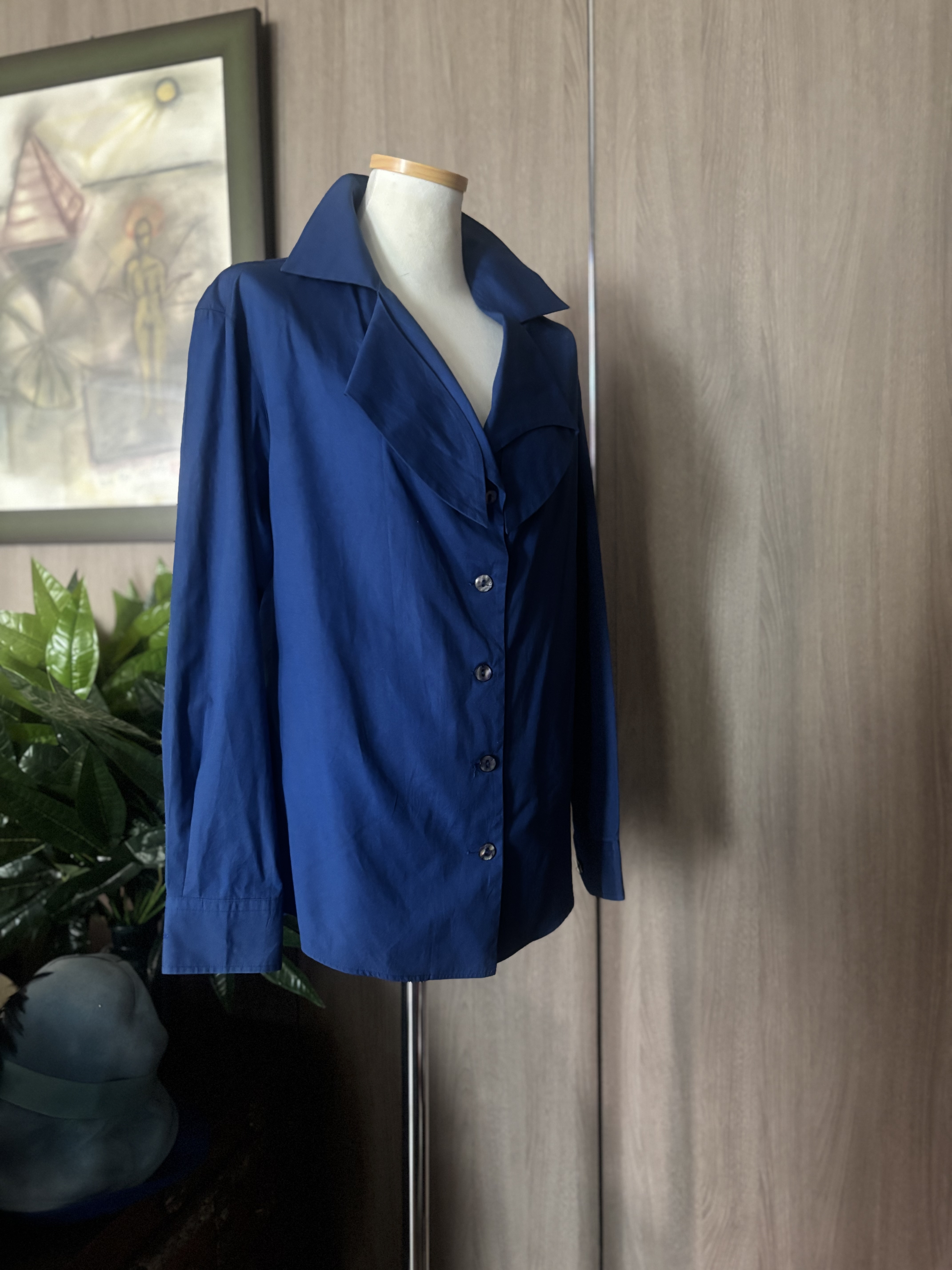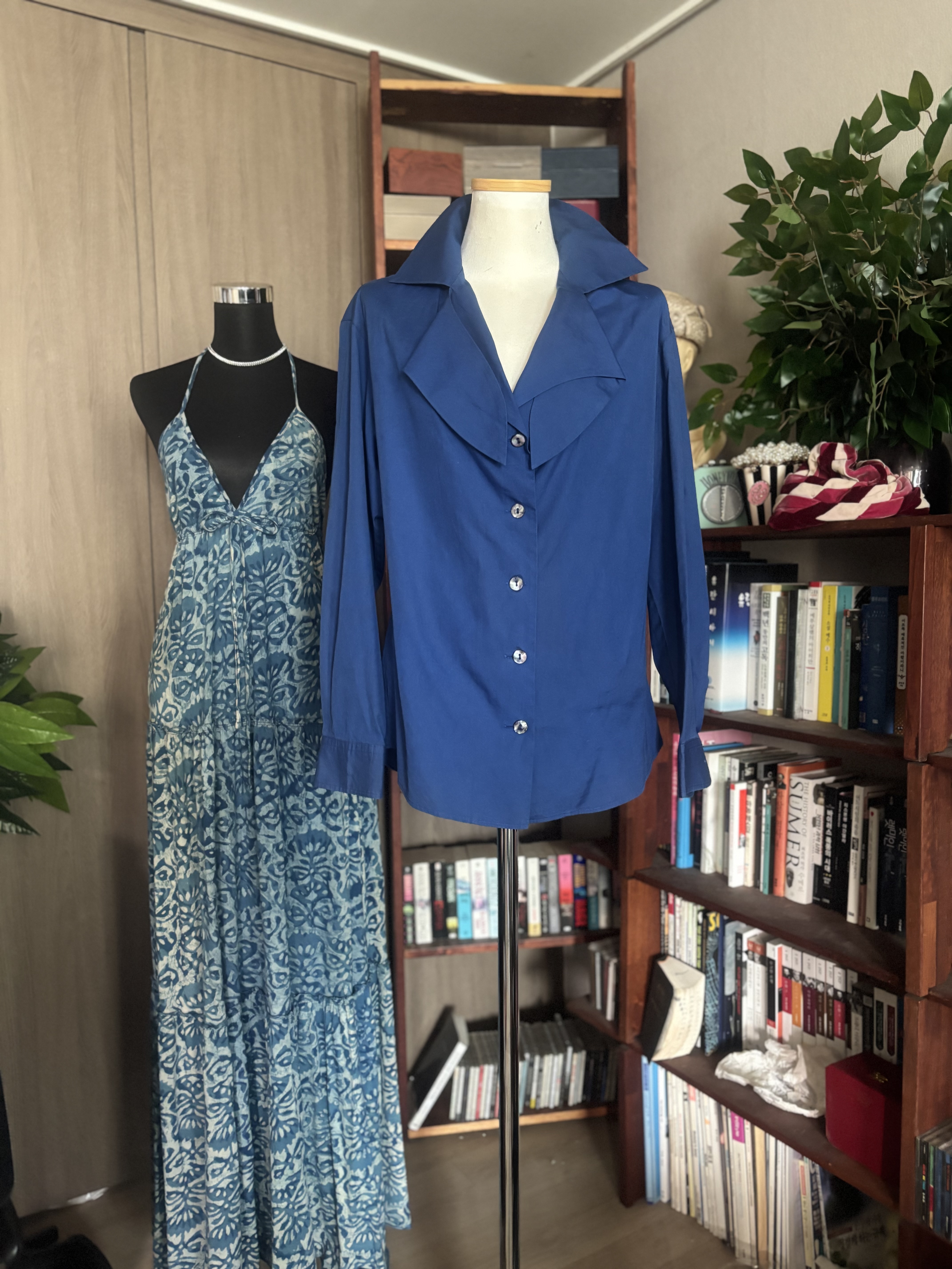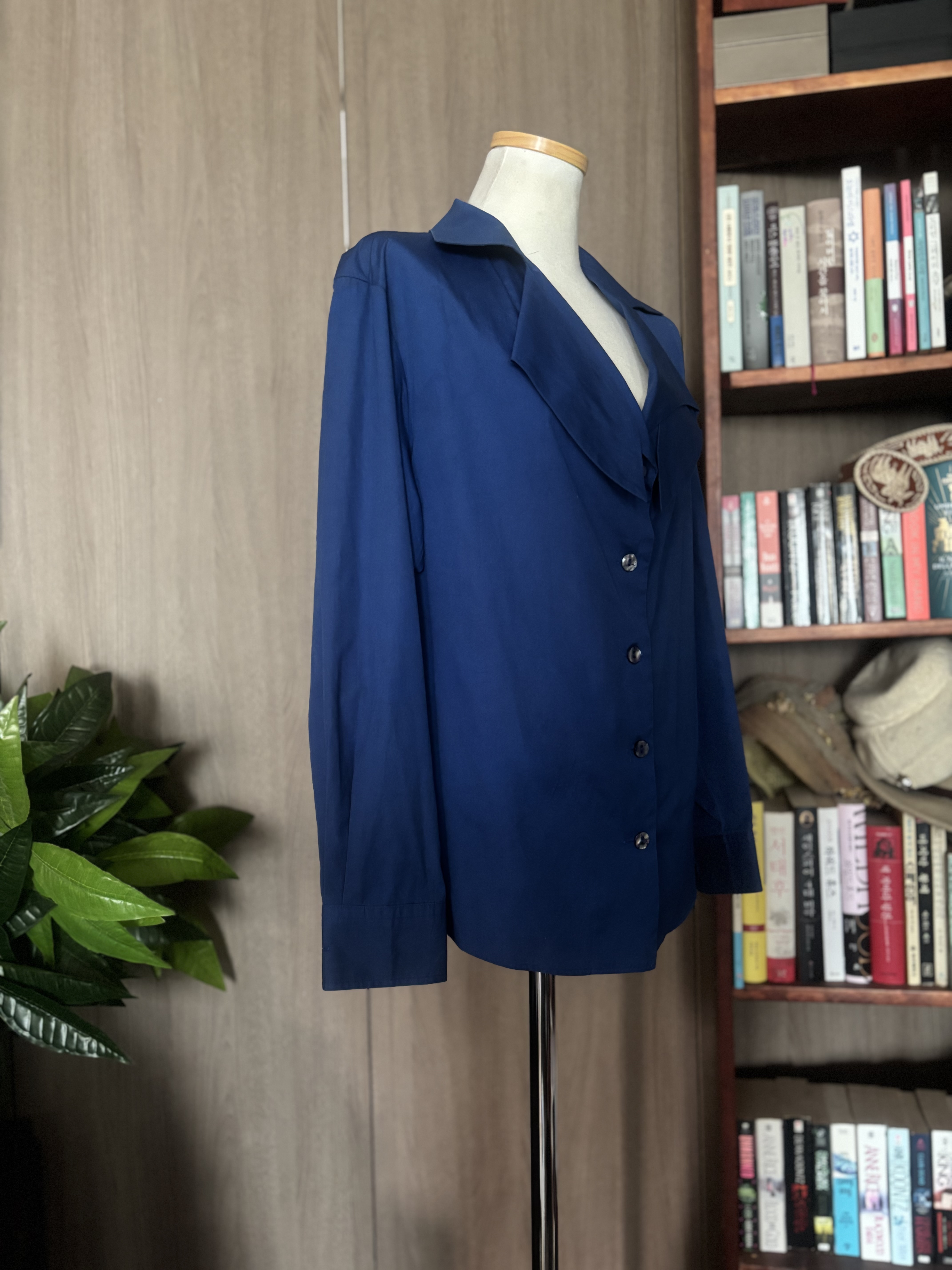 참 디자이너들 머리 깨질거예요 새로운 디잔을 창작하느라구요 창작욕도 대단하겠죠 타 브랜드와 다르게 멋지게 지져줘야 하기에 ,,,디자이너라는 직업도 고도의 기술을 요하는 고된직업중 하나이죠 이 겐조 블라우스도 그래요 뭔가 꼭 엣지를 줘야하고 이건뭐지 하는 궁금증을 불러 일으켜야 돈 법니다 카라가 뭔 모양인지는 모르겠지만 아무튼 이쁘구야 비대칭,소매 3개 , 거꾸로 입는옷 어떻게 입어야하는지도 모르는 옷들이 한때 트렌드였어요 비비엔 웨스트우드 할머니가 정말 자유창작을 펼치면서 별걸 다 볼수있는 디자인을 쎄 빠지게 하셨어요 지금은 고인이 되셨고 더 이상 디자인이 떠오르지 않을때 돌아가신것 같아요 짧고 굵게 말예요 그럼 뭐해요 돈 왕창 벌어놓고 써 보지도 못하고 가셨는데 말예요 처음 접하는 제품이니 특이하다하면서 많이 구매들 했을거예요 아 그러나 지금은 형이상학적 옷들은 사라지고 - 아아 저도 비대칭이라면 이젠 그만하라고 하고싶을정도 지긋지긋해요 근데 그 시대에 내가 살아있었는데 모른척 할수 없쟎아요? 쇼핑 마니 했습니다 이젠 old money look 으로 돌아왔죠 유행은 변하고 돌고도는 물레방아 인생. 시즌마다 어떤룩이 나올지 궁금하지도 않아요 니네들이 알아서 하세요 나도 힘들어 죽갔는데 나이 먹는일은 뭐냐 정의를 내리면 전 ”불편함 “이라 내리고 싶군요 또또 딴 얘기하고 앉아있는데 있는데 ~ 컨디션 완벽에 가까운 상태이며 다른색을 믹스하지않은 정말 순수한 파랑색 입니다 착용해야 이쁜옷입니다 가반 49cm, 64cm의 총길이 스페어버튼 1개 일본서 제작했음 파리에서 일을하고있는 일본인 겐조이니 프랑스에서 만드나 일본에서 만드나 죠