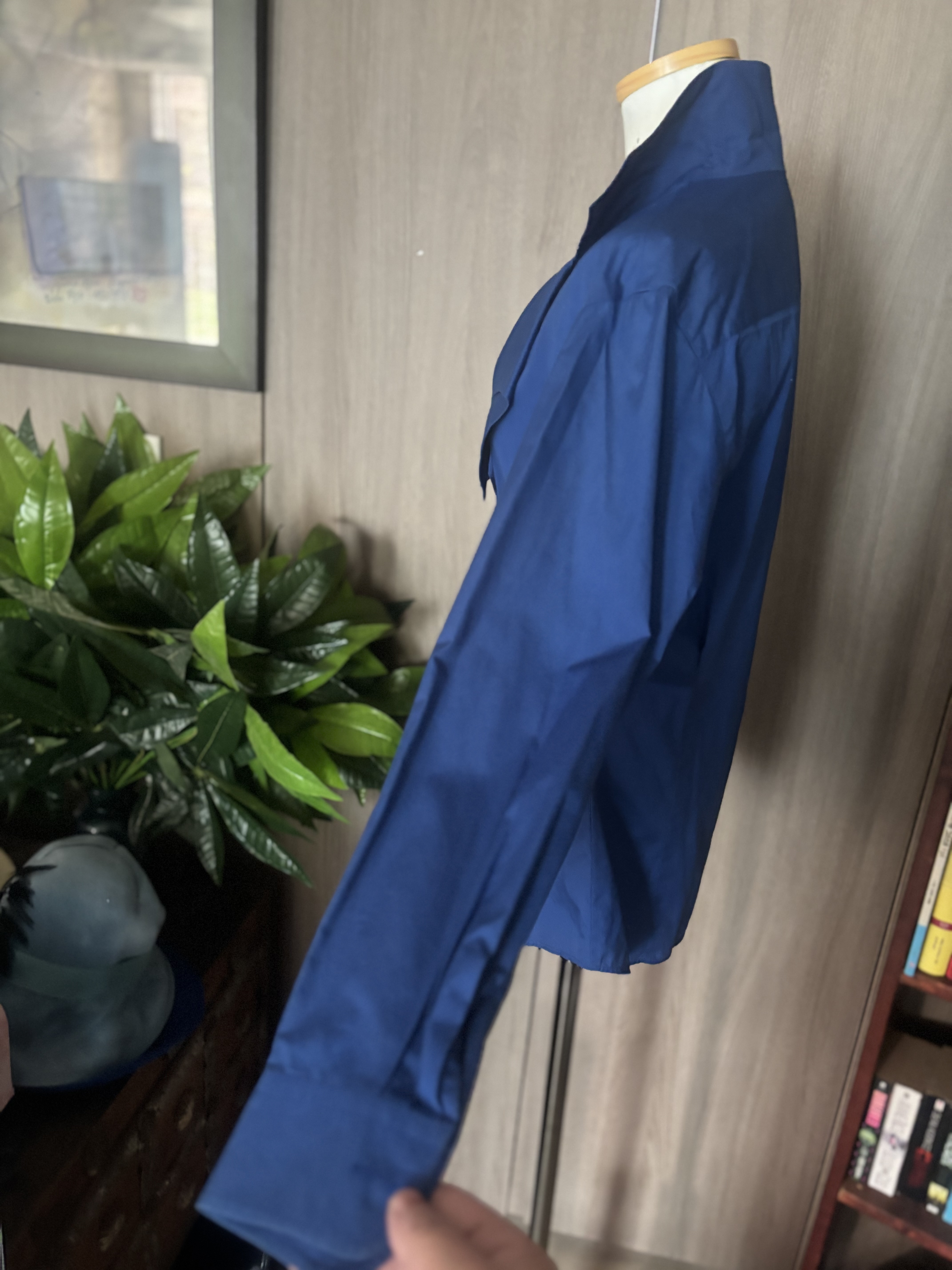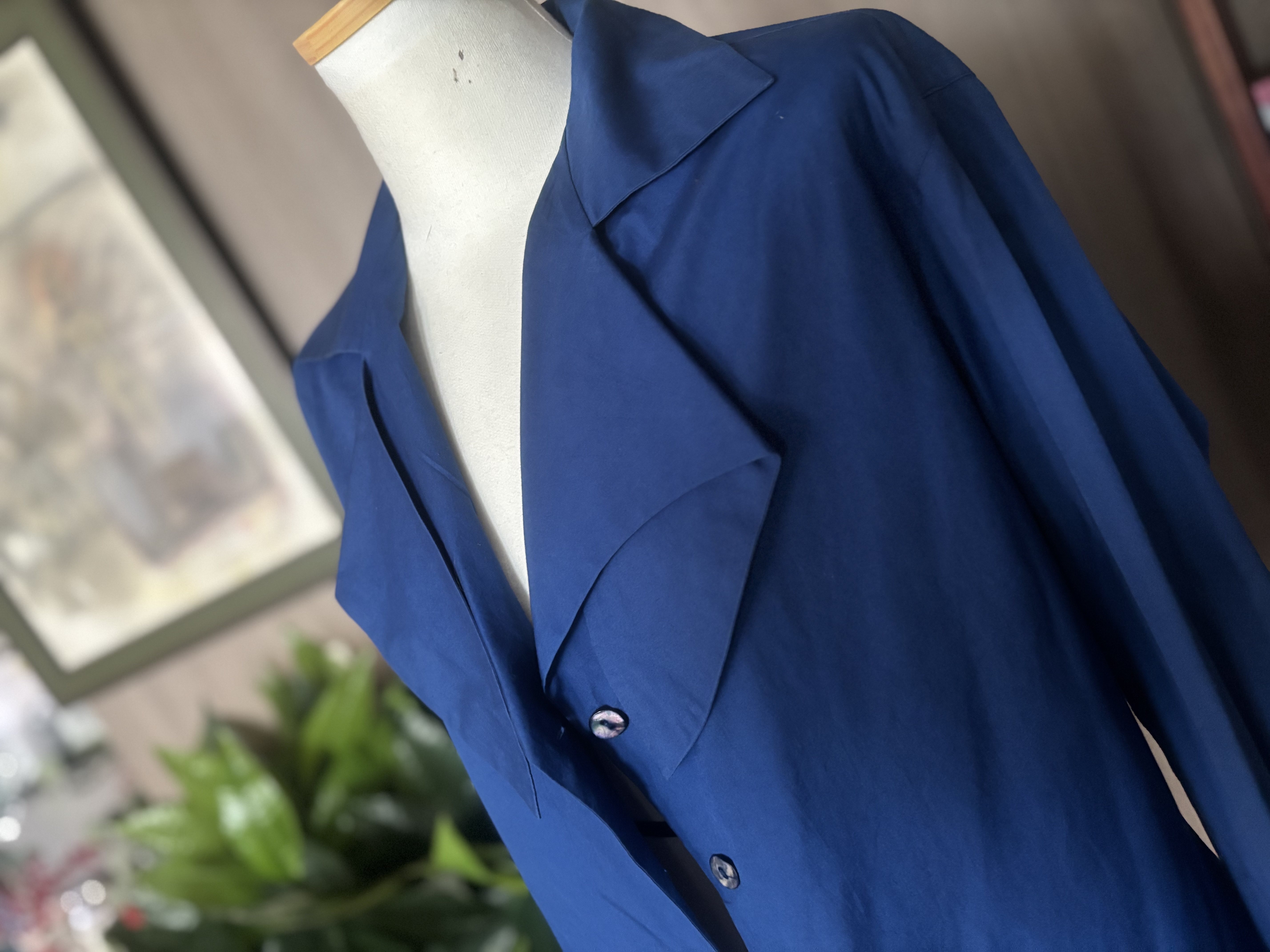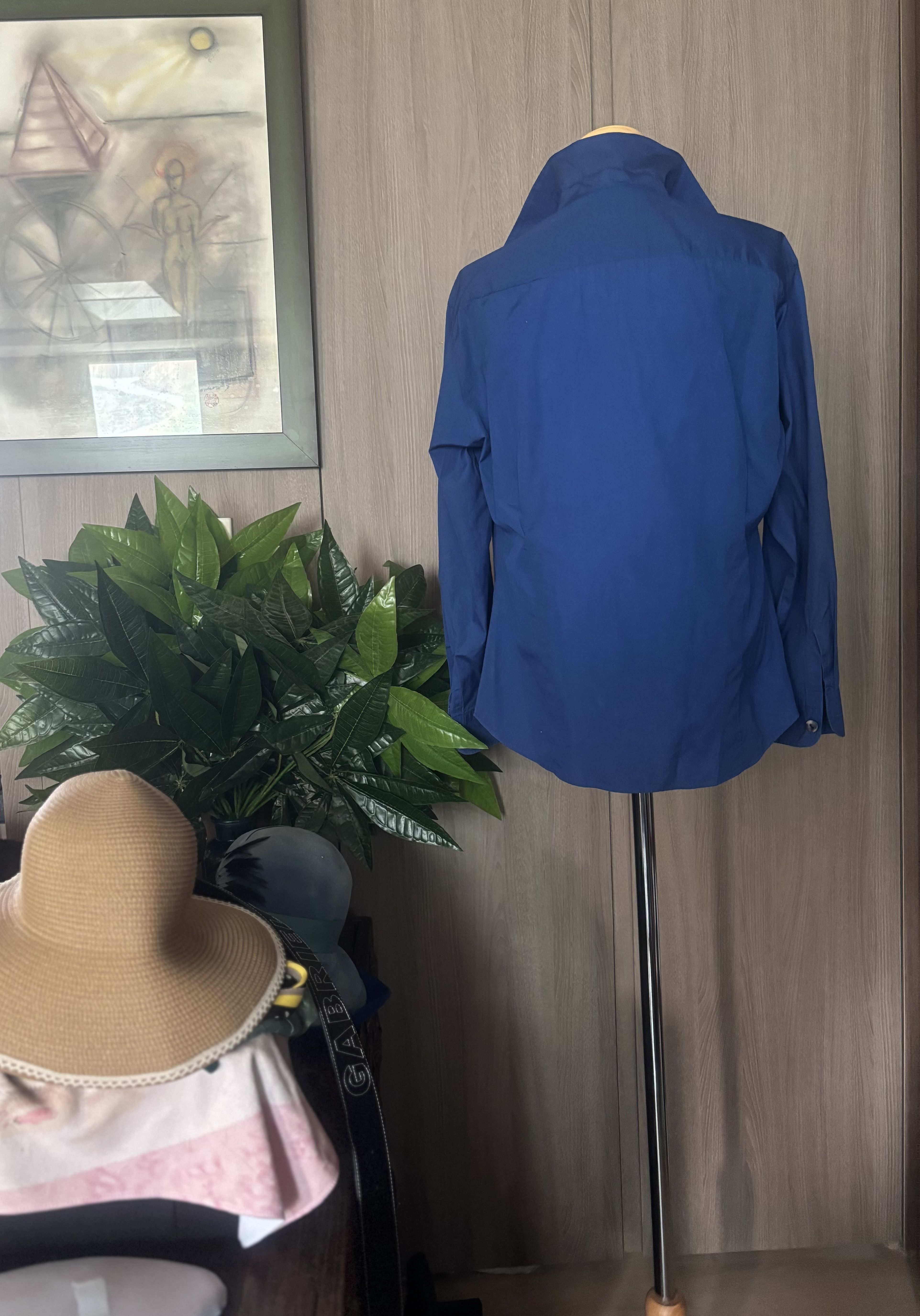 참 디자이너들 머리 깨질거예요 새로운 디잔을 창작하느라구요 창작욕도 대단하겠죠 타 브랜드와 다르게 멋지게 지져줘야 하기에 ,,,디자이너라는 직업도 고도의 기술을 요하는 고된직업중 하나이죠 이 겐조 블라우스도 그래요 뭔가 꼭 엣지를 줘야하고 이건뭐지 하는 궁금증을 불러 일으켜야 돈 법니다 카라가 뭔 모양인지는 모르겠지만 아무튼 이쁘구야 비대칭,소매 3개 , 거꾸로 입는옷 어떻게 입어야하는지도 모르는 옷들이 한때 트렌드였어요 비비엔 웨스트우드 할머니가 정말 자유창작을 펼치면서 별걸 다 볼수있는 디자인을 쎄 빠지게 하셨어요 지금은 고인이 되셨고 더 이상 디자인이 떠오르지 않을때 돌아가신것 같아요 짧고 굵게 말예요 그럼 뭐해요 돈 왕창 벌어놓고 써 보지도 못하고 가셨는데 말예요 처음 접하는 제품이니 특이하다하면서 많이 구매들 했을거예요 아 그러나 지금은 형이상학적 옷들은 사라지고 - 아아 저도 비대칭이라면 이젠 그만하라고 하고싶을정도 지긋지긋해요 근데 그 시대에 내가 살아있었는데 모른척 할수 없쟎아요? 쇼핑 마니 했습니다 이젠 old money look 으로 돌아왔죠 유행은 변하고 돌고도는 물레방아 인생. 시즌마다 어떤룩이 나올지 궁금하지도 않아요 니네들이 알아서 하세요 나도 힘들어 죽갔는데 나이 먹는일은 뭐냐 정의를 내리면 전 ”불편함 “이라 내리고 싶군요 또또 딴 얘기하고 앉아있는데 있는데 ~ 컨디션 완벽에 가까운 상태이며 다른색을 믹스하지않은 정말 순수한 파랑색 입니다 착용해야 이쁜옷입니다 가반 49cm, 64cm의 총길이 스페어버튼 1개 일본서 제작했음 파리에서 일을하고있는 일본인 겐조이니 프랑스에서 만드나 일본에서 만드나 죠