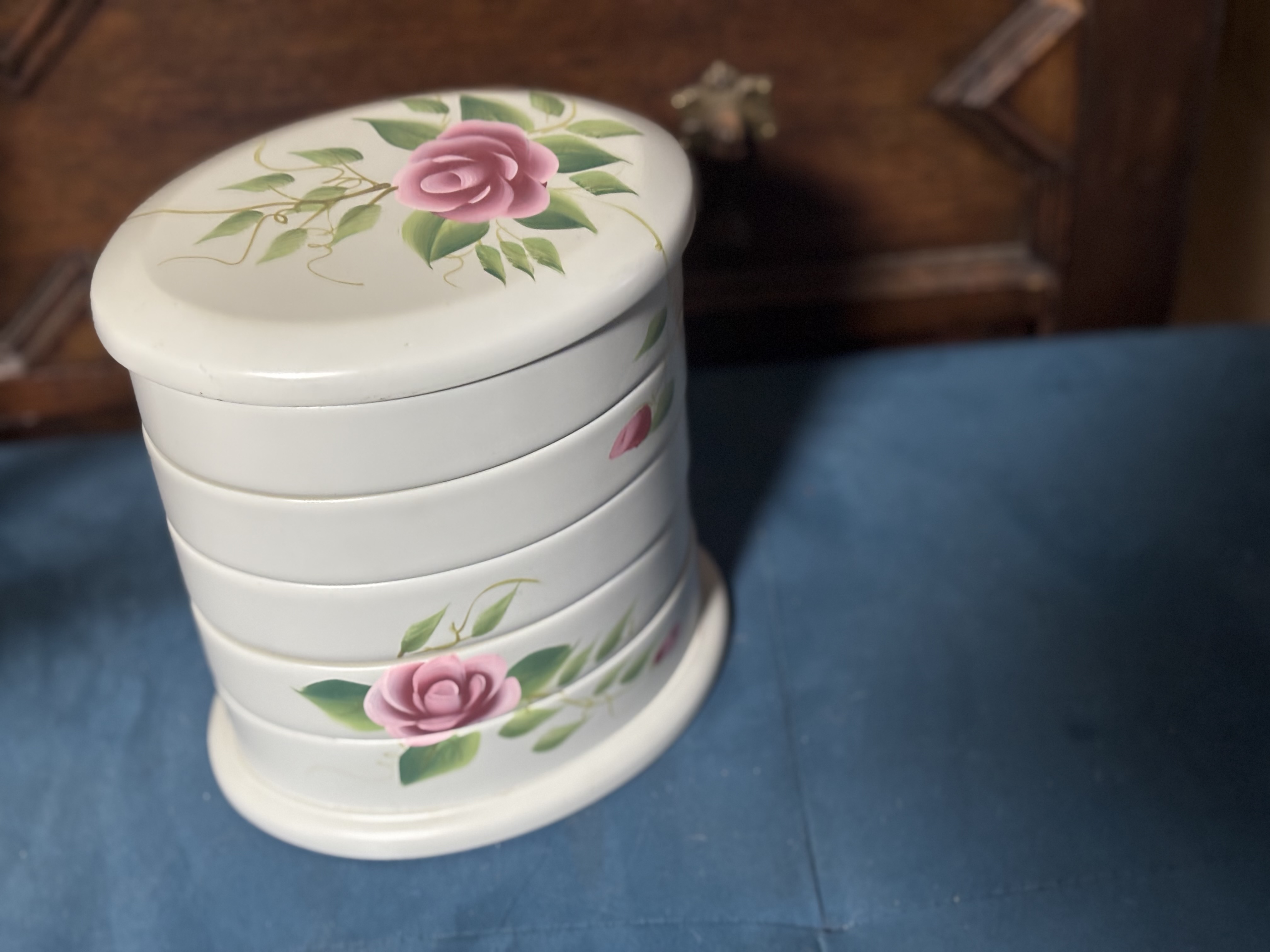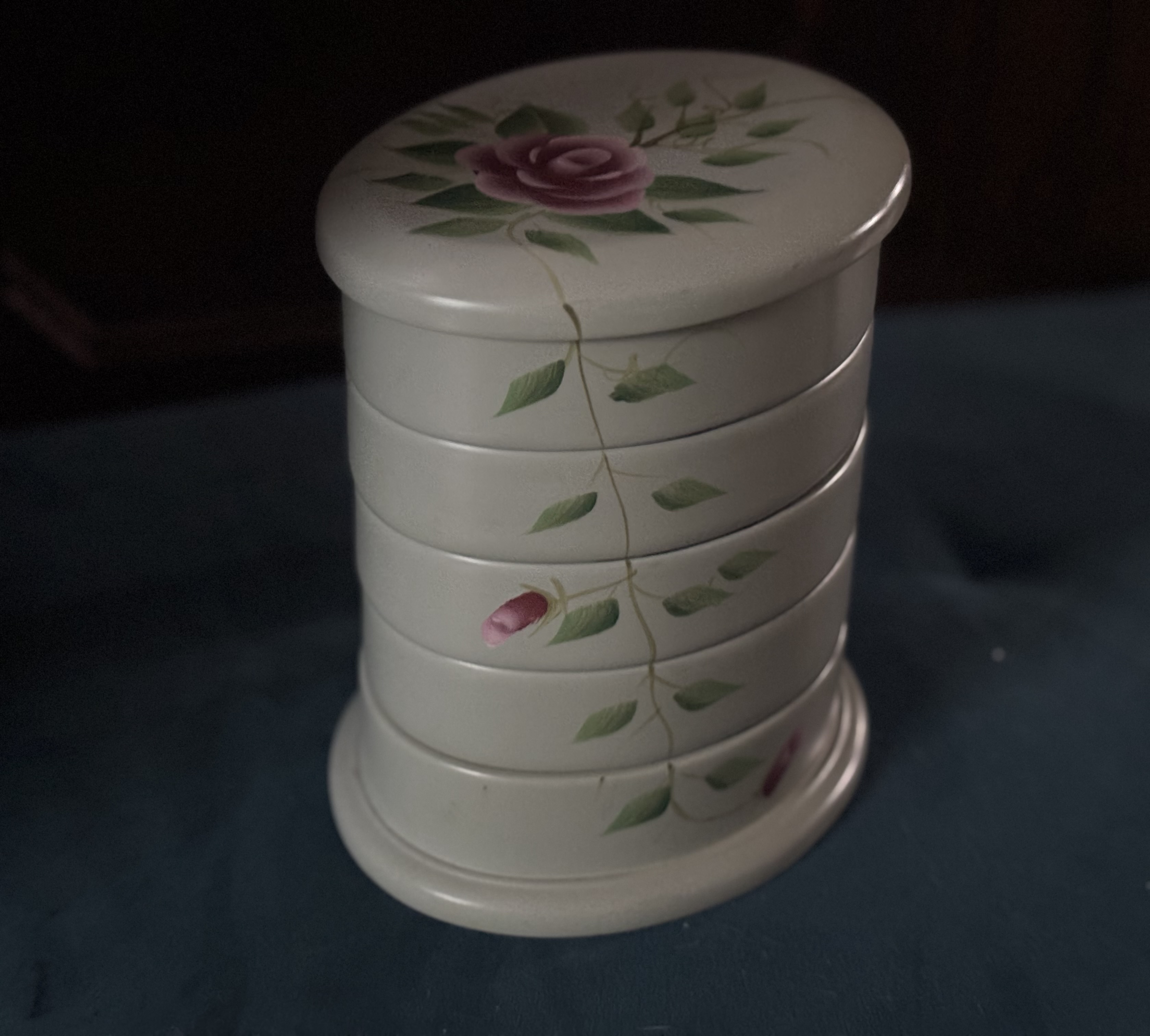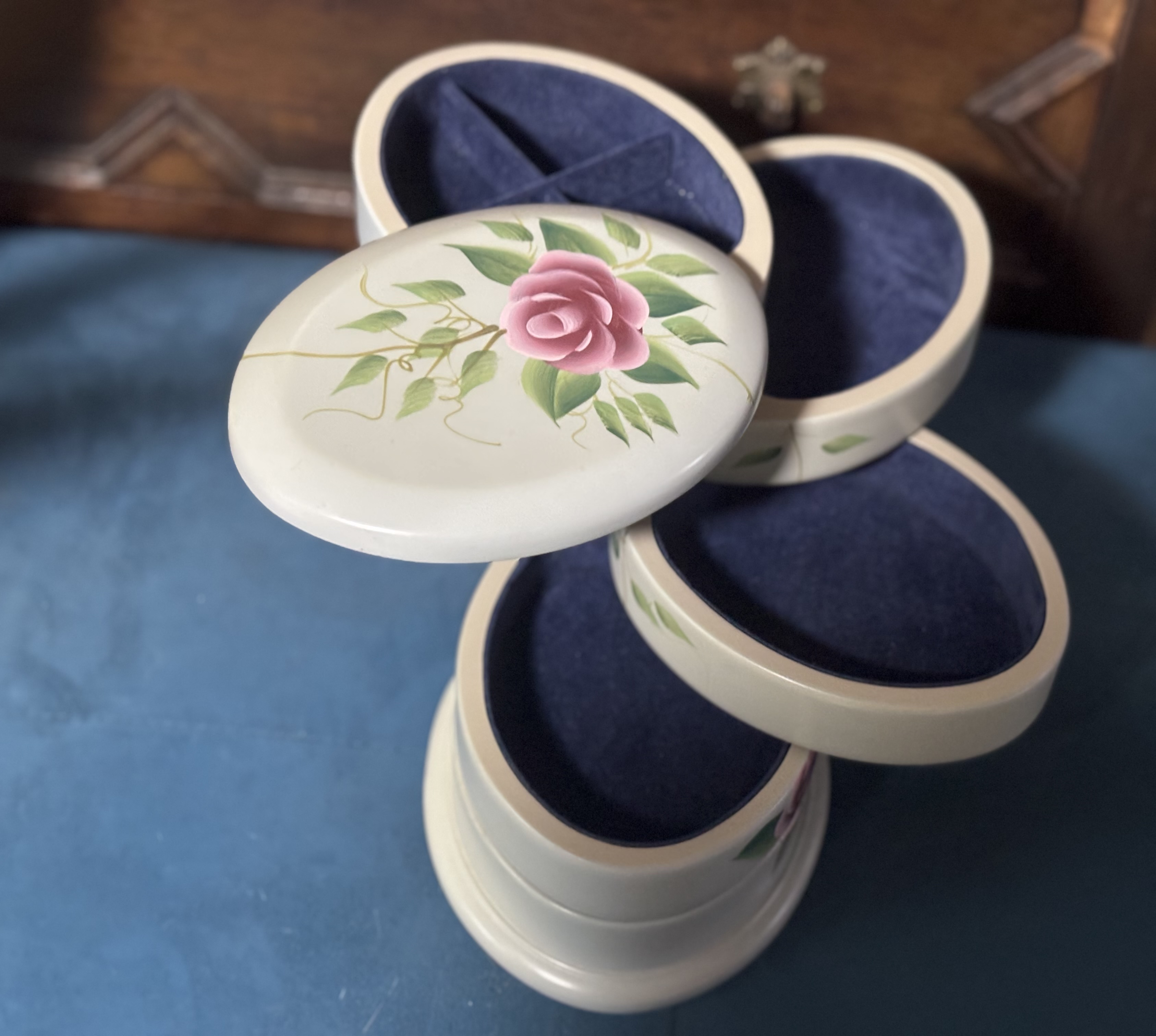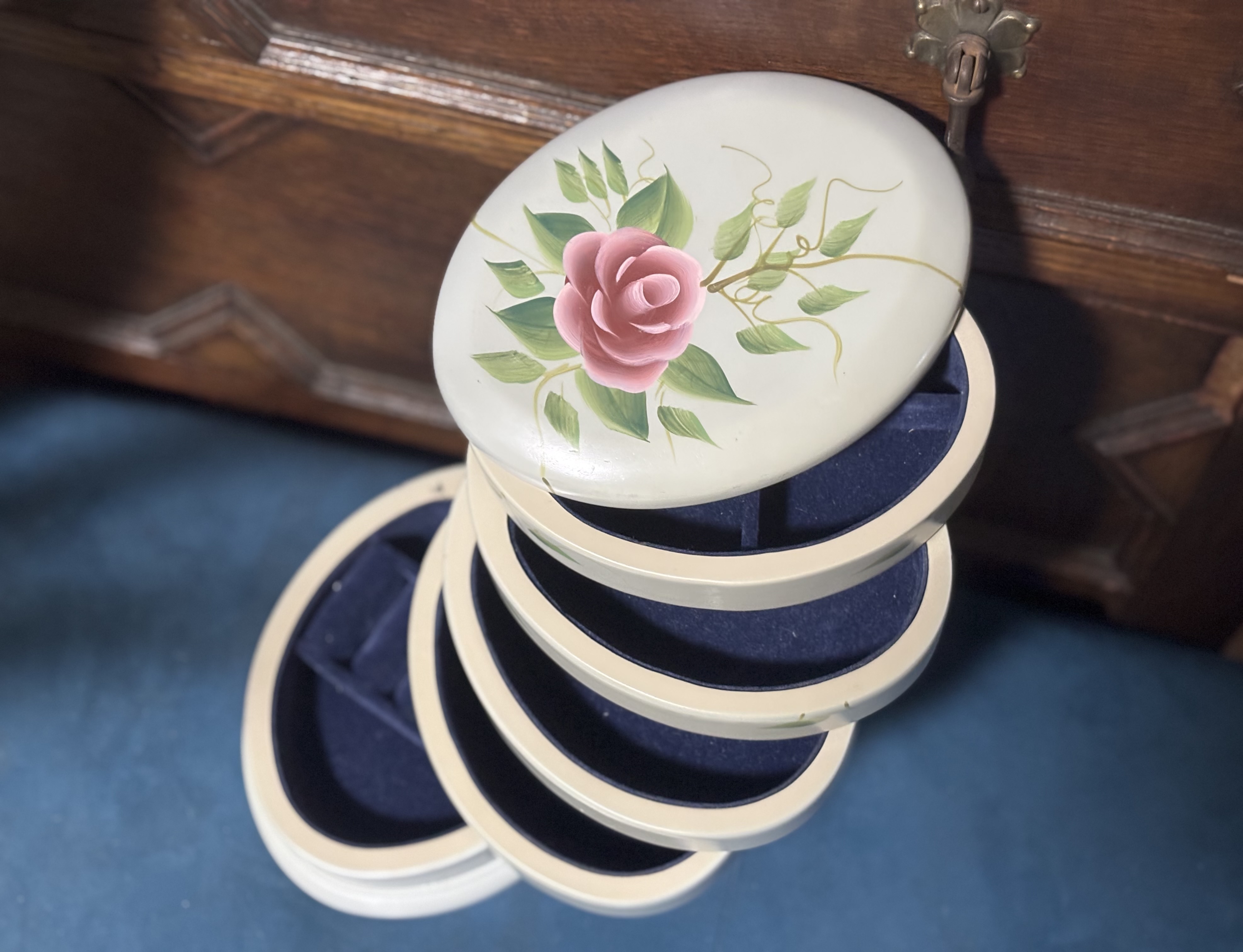 오벌타입의 쥬얼리 케이스통 ? 이예요 5개의 서랍을 열면 반지 귀걸이, 목걸이 따로 보관할수 있어서 편리해요 예쁘지 않으세요 여는방법도 타 박스통과 틀리고 다 열면 동그란 계단같아서 모냥 좋았어요 다들 맘에 안든다 하면 다 제꺼죠 ㅎㅎ예전에 저는 귀챦아서 큰 박스에 다 털어넣었는데 잘 찾기도 힘들고 목걸이 줄은 여기저기 얽혀있어서 나누어서 넣어야 겠드라구요 그래서 나눠두기를 시도했더니 쥬얼리 케이스 컬렉션이 되어버렸어요 이쁜것만 보믄 사대는 이 관성은 타고난거같아요. 이젠 유니끄한 쥬얼리 케이스나 링킷을 보면 모으고 싶어져서 싸악 다 바꿨습니다 당연 빈티지로요 3 년만에요 통 세로 18cm, 통 둘레 45cm