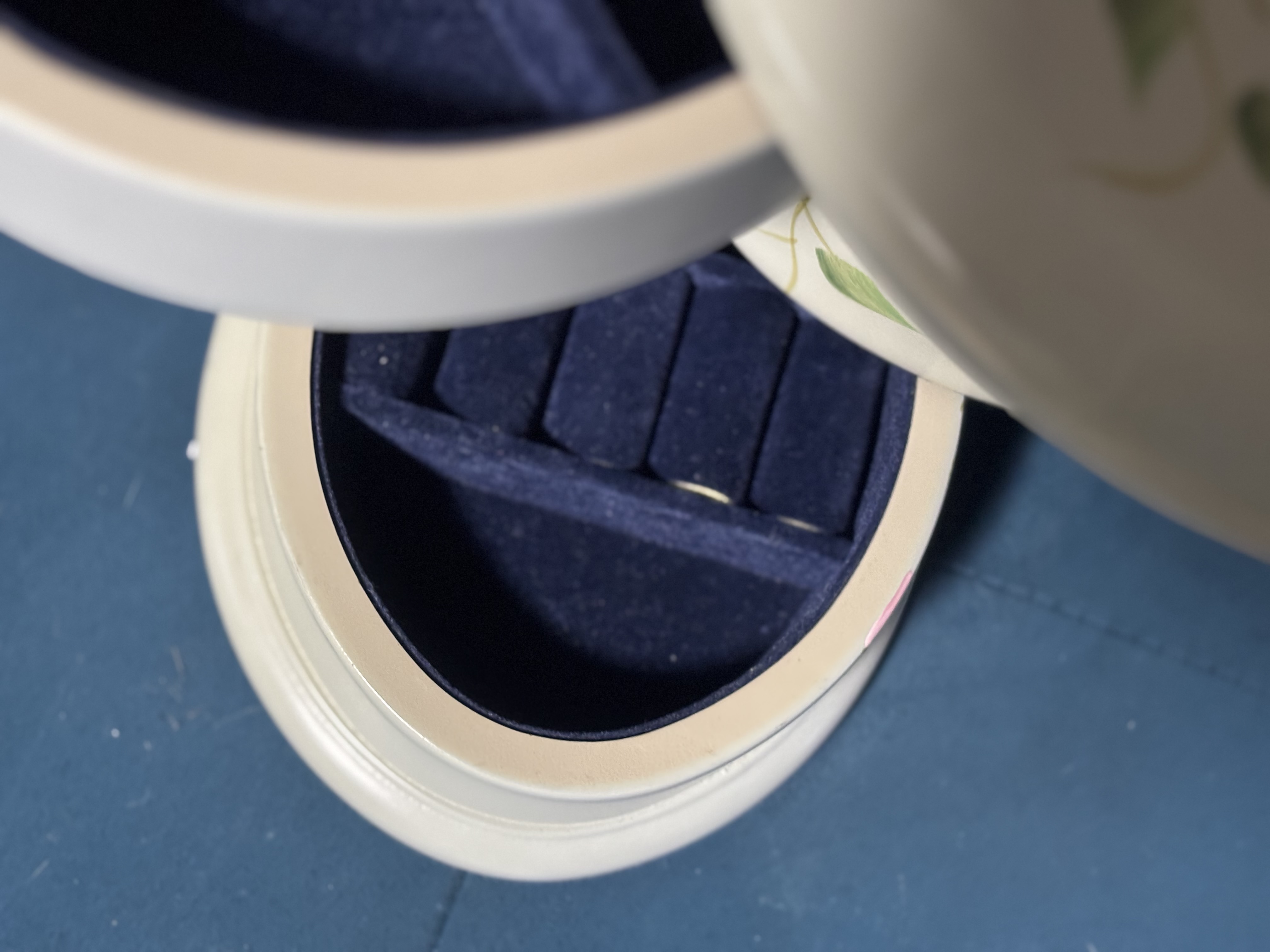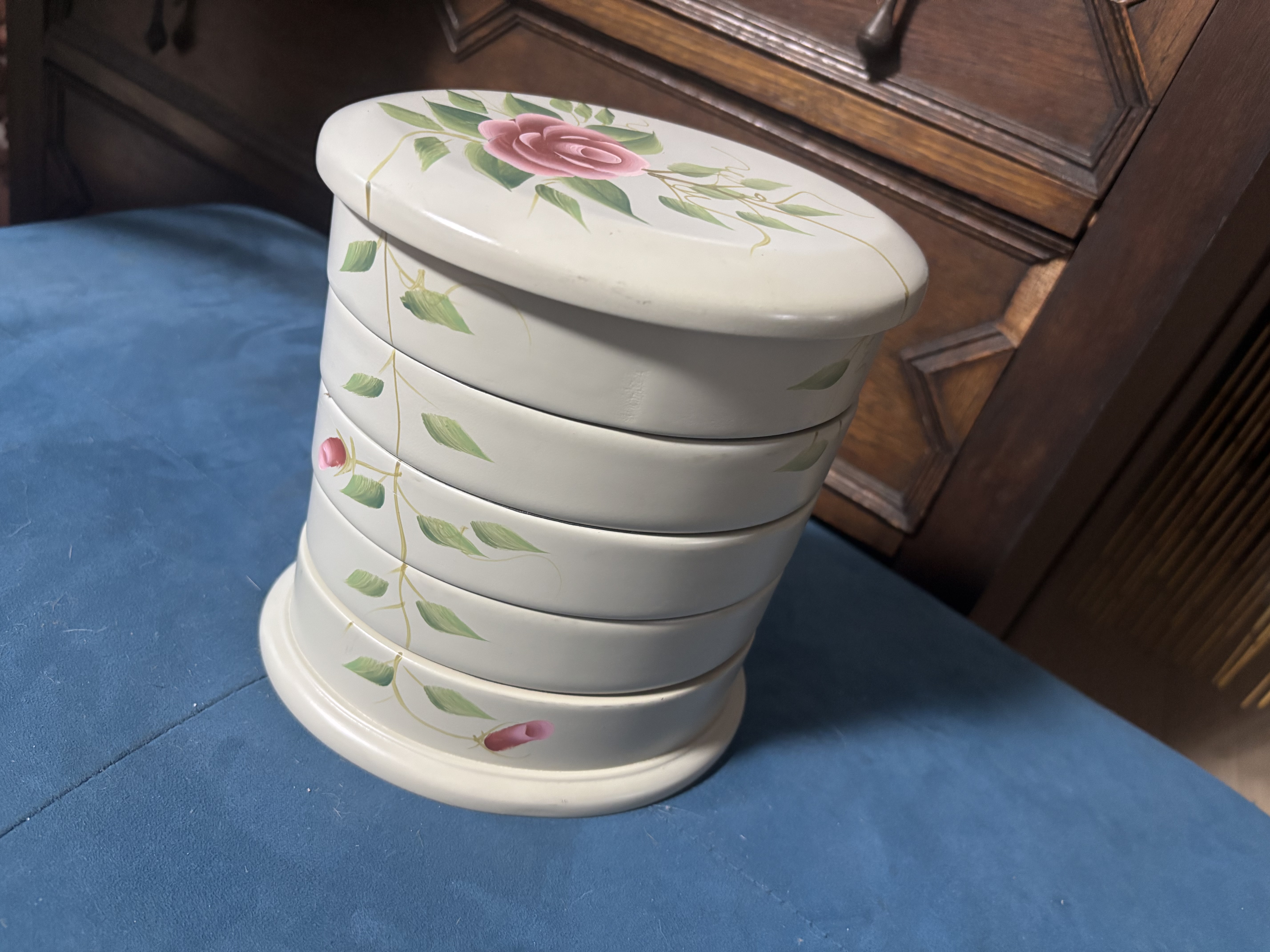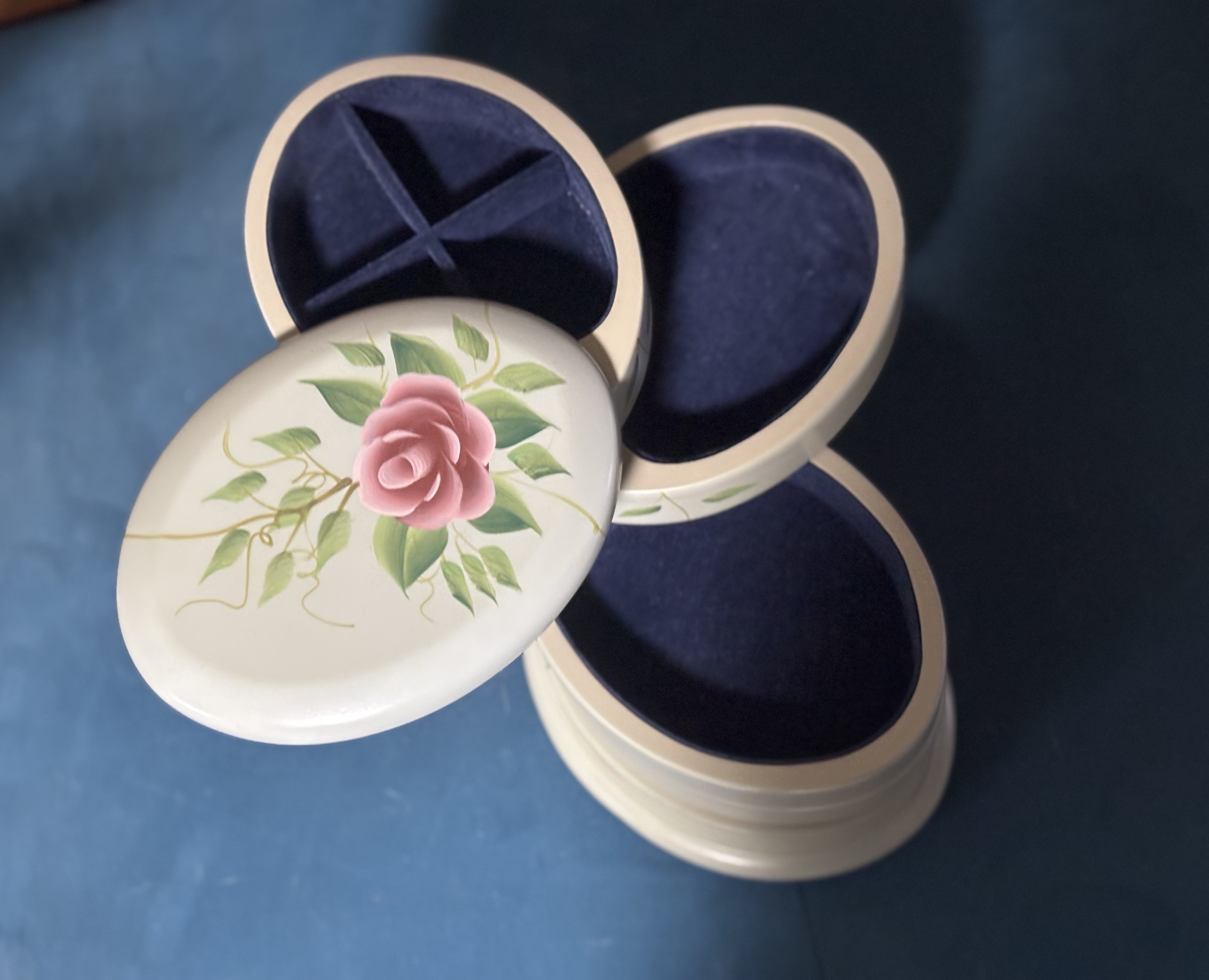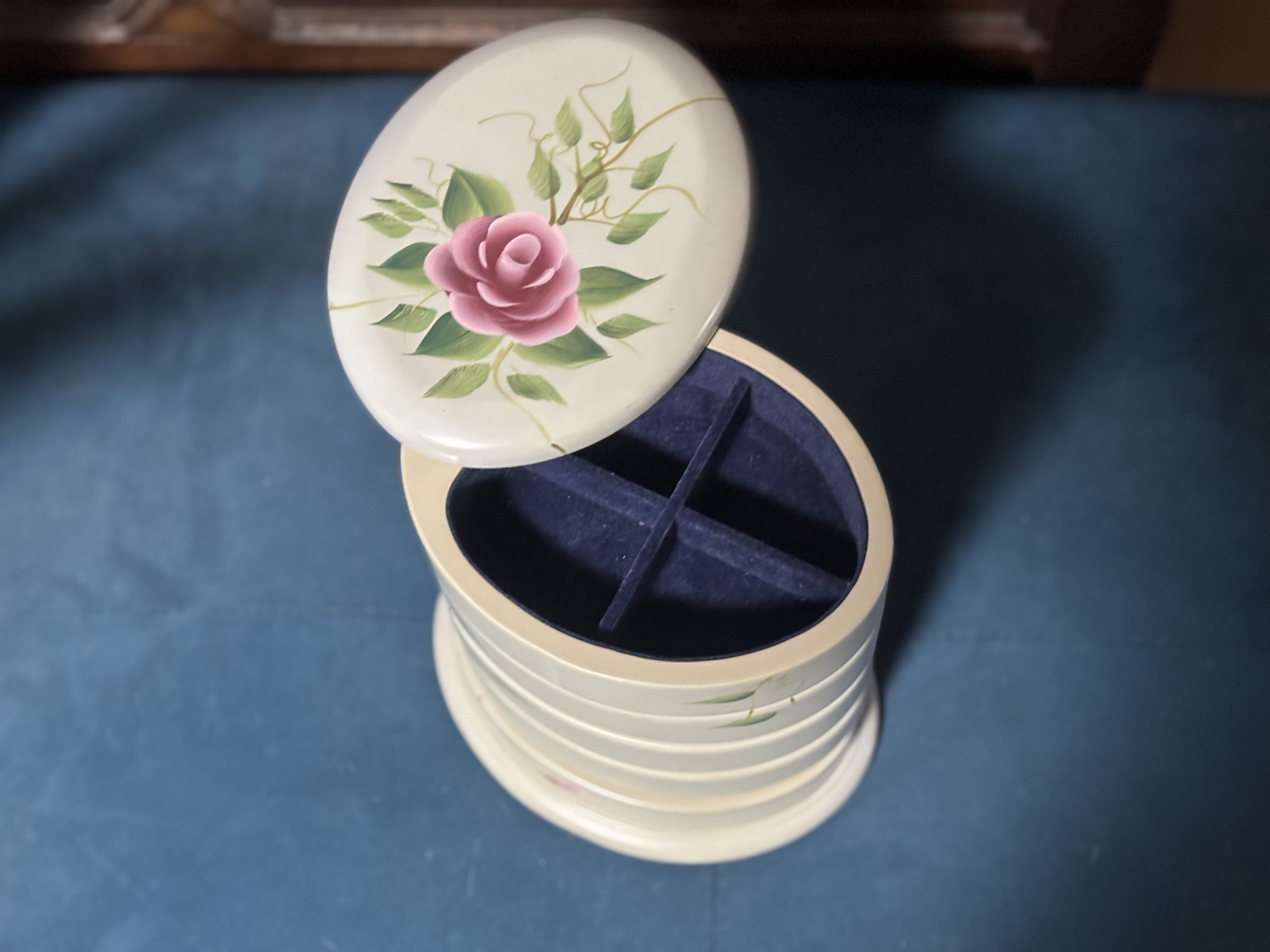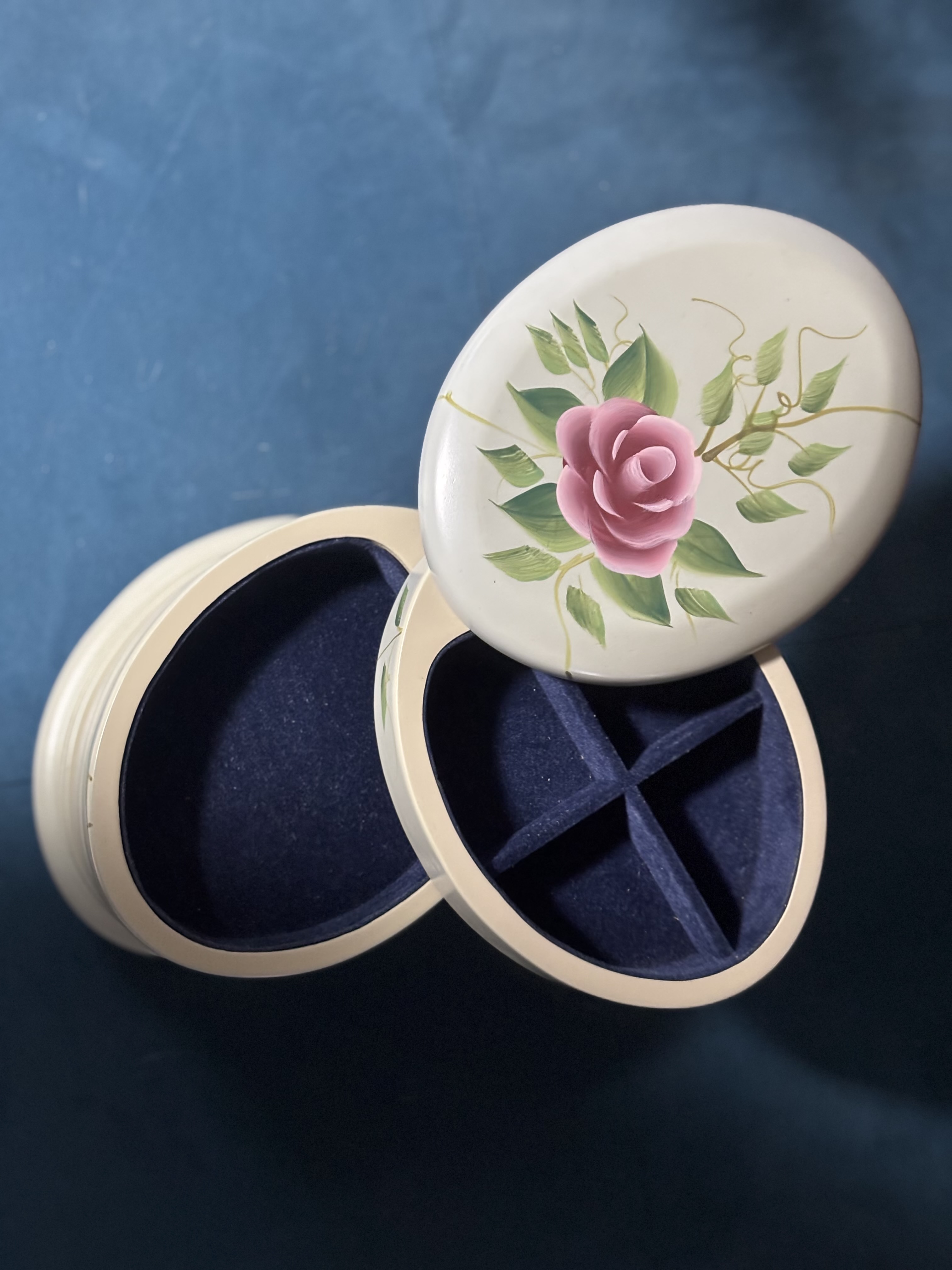 오벌타입의 쥬얼리 케이스통 ? 이예요 5개의 서랍을 열면 반지 귀걸이, 목걸이 따로 보관할수 있어서 편리해요 예쁘지 않으세요 여는방법도 타 박스통과 틀리고 다 열면 동그란 계단같아서 모냥 좋았어요 다들 맘에 안든다 하면 다 제꺼죠 ㅎㅎ예전에 저는 귀챦아서 큰 박스에 다 털어넣었는데 잘 찾기도 힘들고 목걸이 줄은 여기저기 얽혀있어서 나누어서 넣어야 겠드라구요 그래서 나눠두기를 시도했더니 쥬얼리 케이스 컬렉션이 되어버렸어요 이쁜것만 보믄 사대는 이 관성은 타고난거같아요. 이젠 유니끄한 쥬얼리 케이스나 링킷을 보면 모으고 싶어져서 싸악 다 바꿨습니다 당연 빈티지로요 3 년만에요 통 세로 18cm, 통 둘레 45cm
