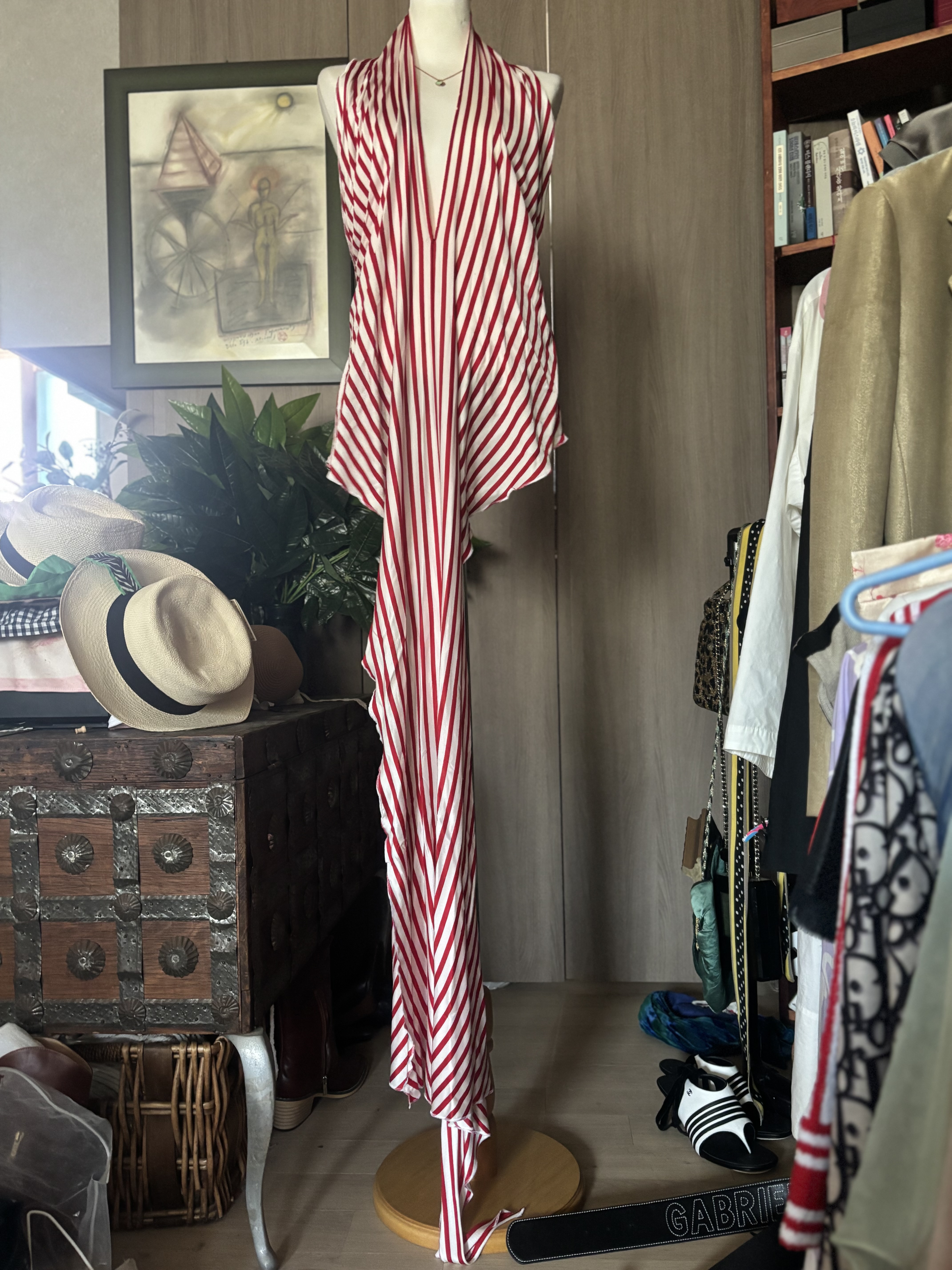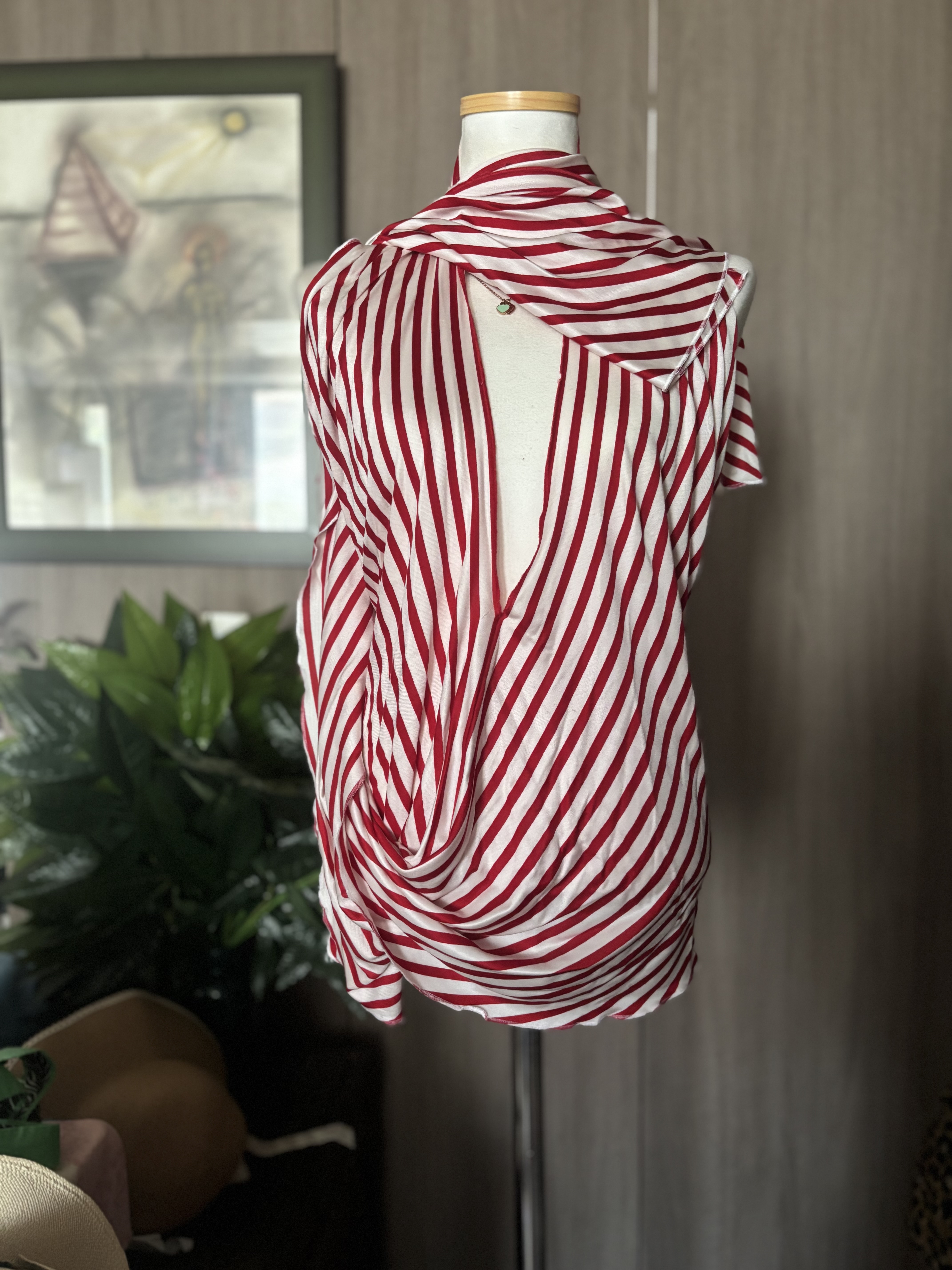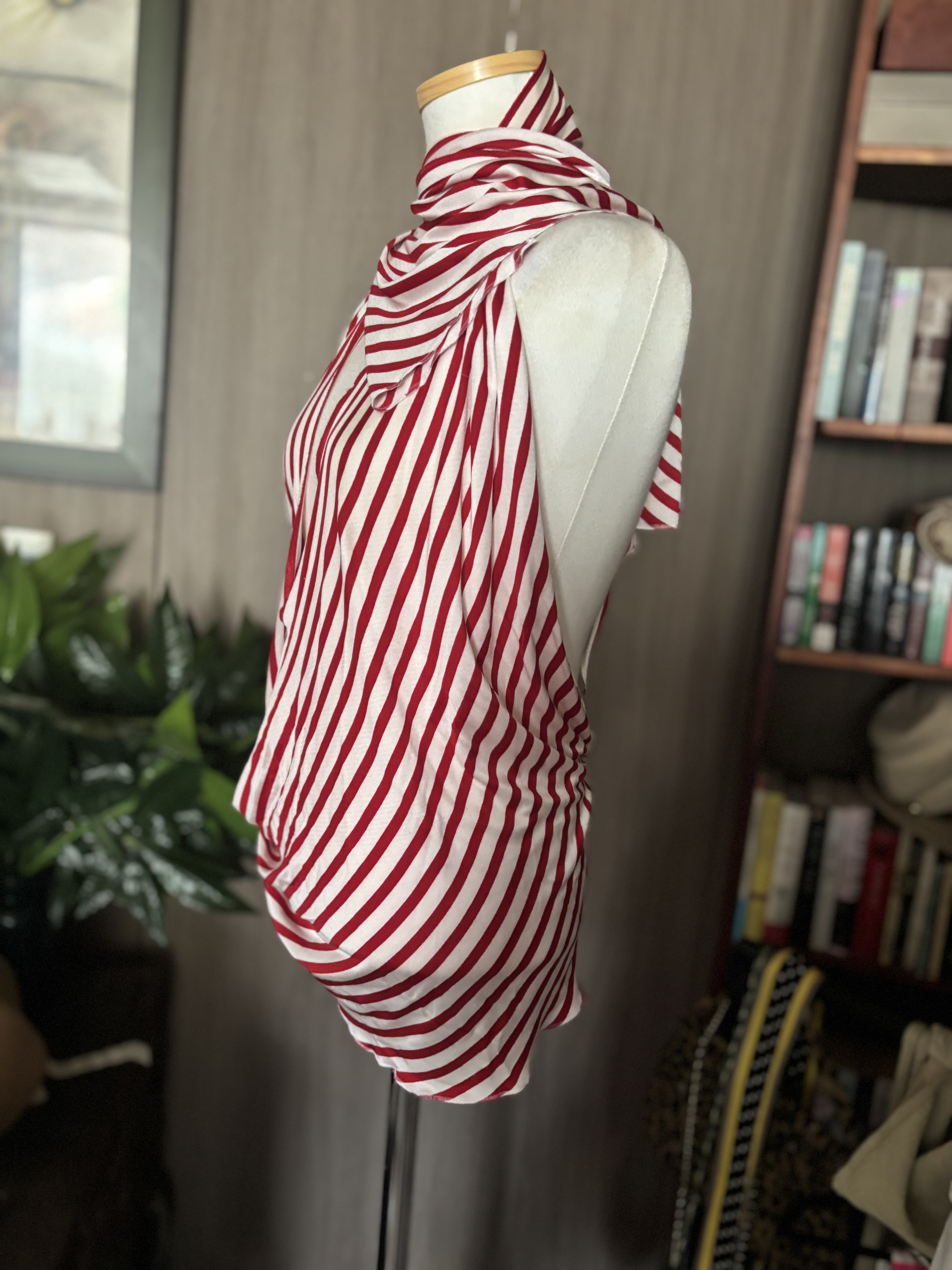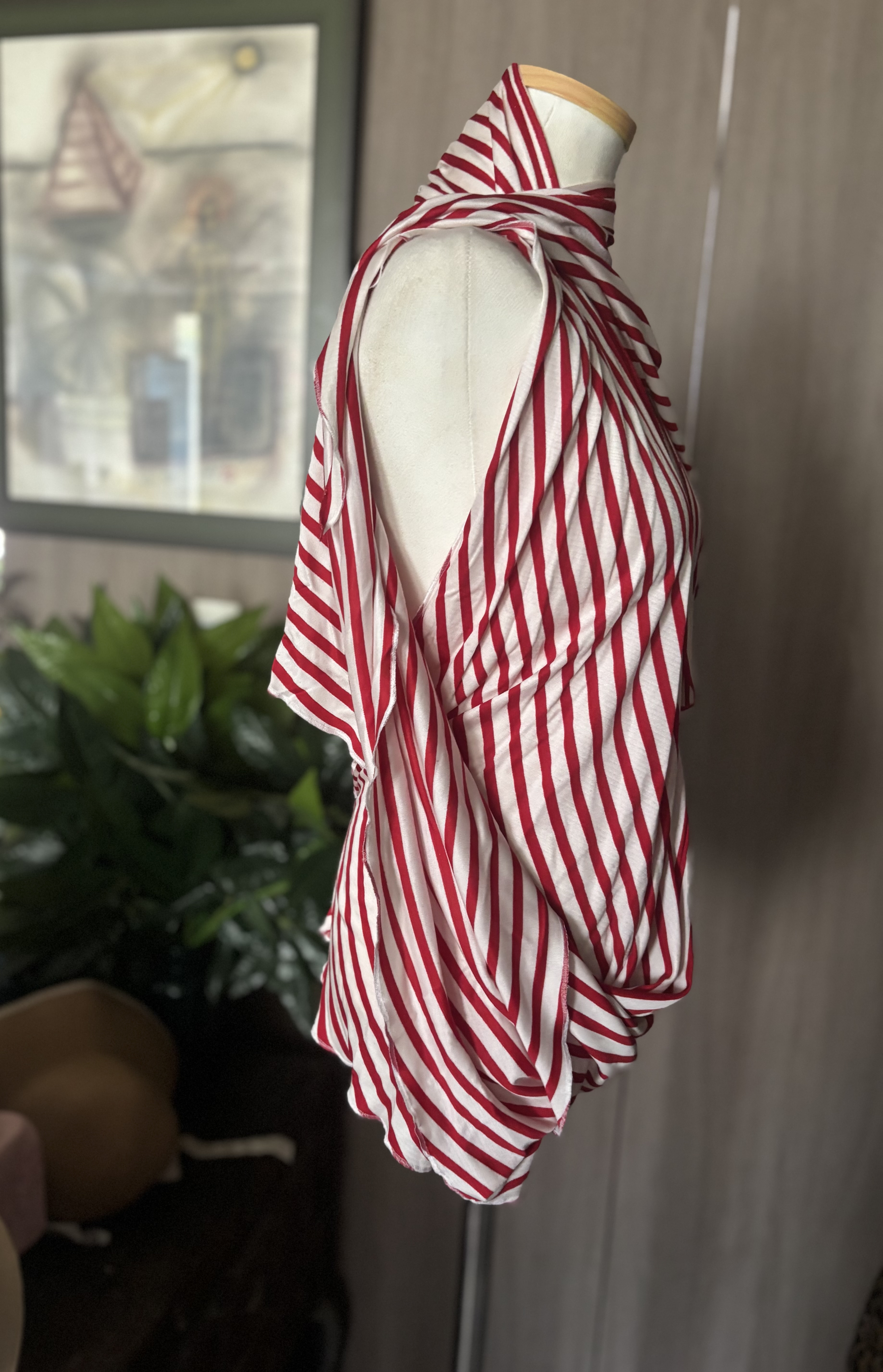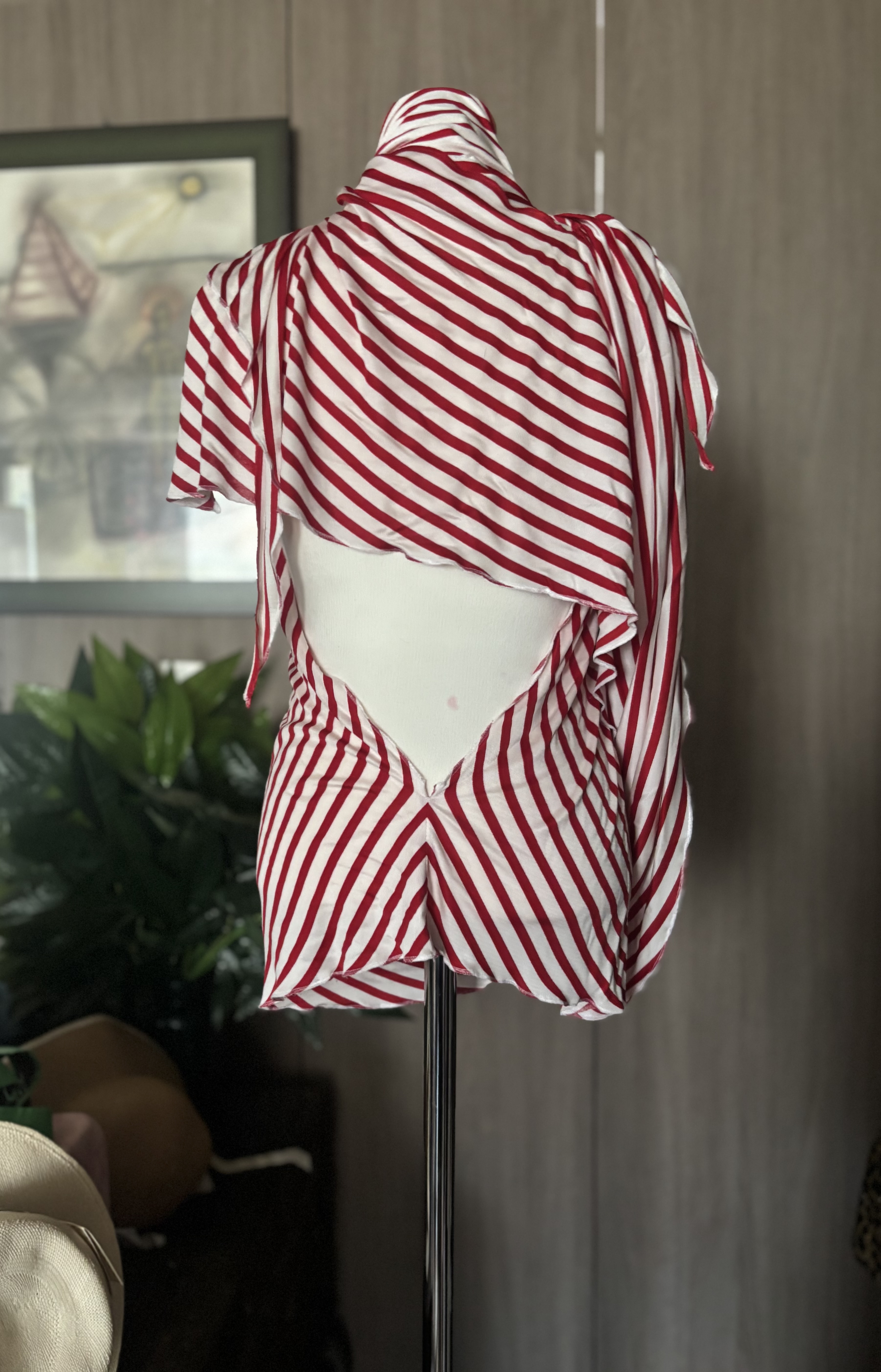 칫수고 나발이고 잴 필요도 없는 아방가르드 하고 그로테스틱한 탑. 사진속의 스타일링 해 놓은 것은 제 맘대로 해 놓은거예요 옷이 스카프 처럼 긴 부분이 있죠 그 끝 부분은 목에 묶게 되어있고 저는 목에 걸어서 스탈일링 할수있게 되어있는 모양의 2 way 인데 저는 후자로 설정했어요 꼭 어떤 형태를 따르지 않고 자신의 맘 대로 둘둘 둘러서 만들수 있는 옷이라 편안하다면 편하고 불편하면 불편할수있는 장단점이 있는데 먼저 자신과 잘 어룰리는지 아닌지를 캐치하시고 선택해야 합니다 어렵다면 바로 pass 소화가능하다면 fixity 천의 재질은 모르겠지만 맨드러운 매끈함