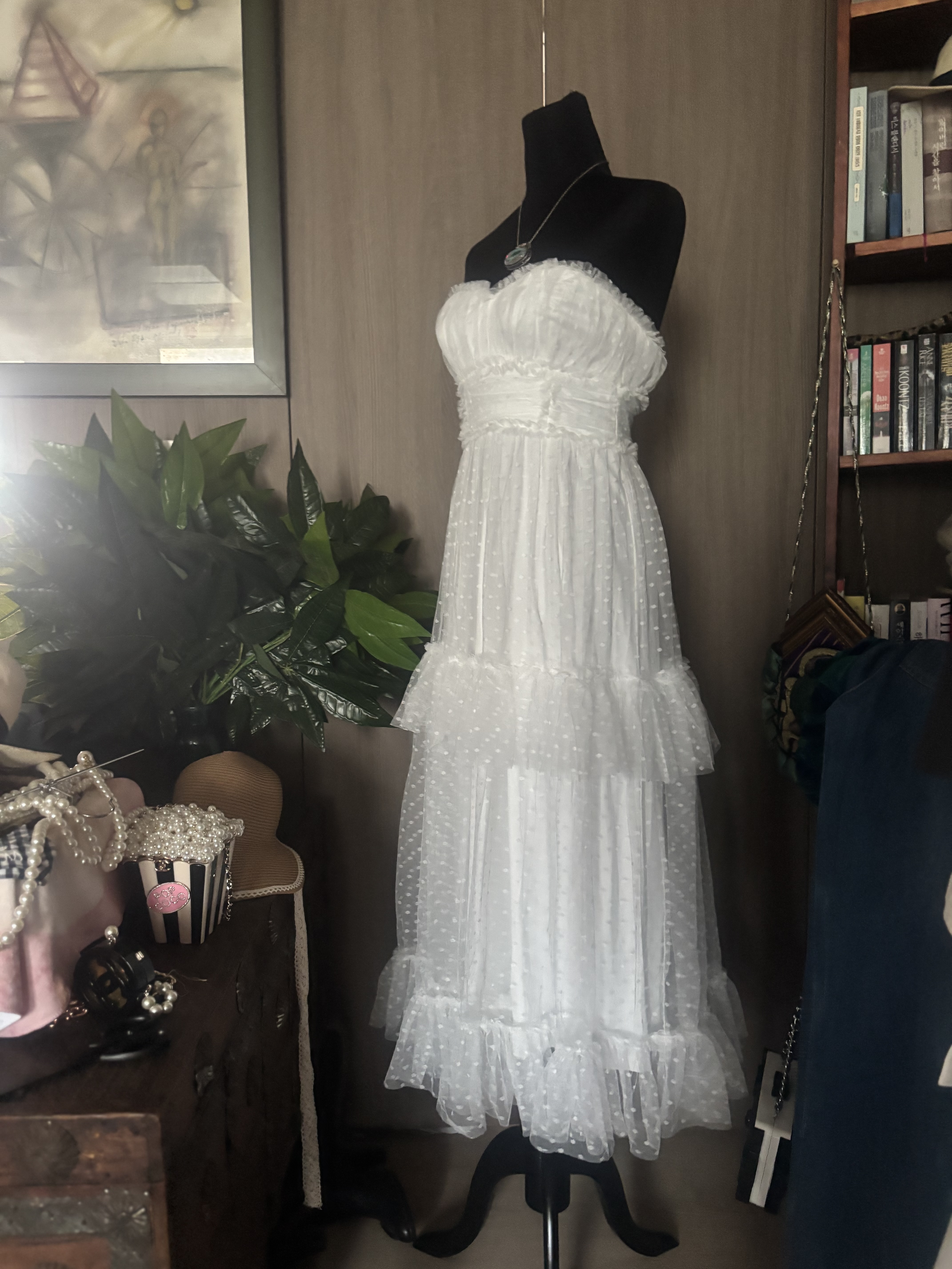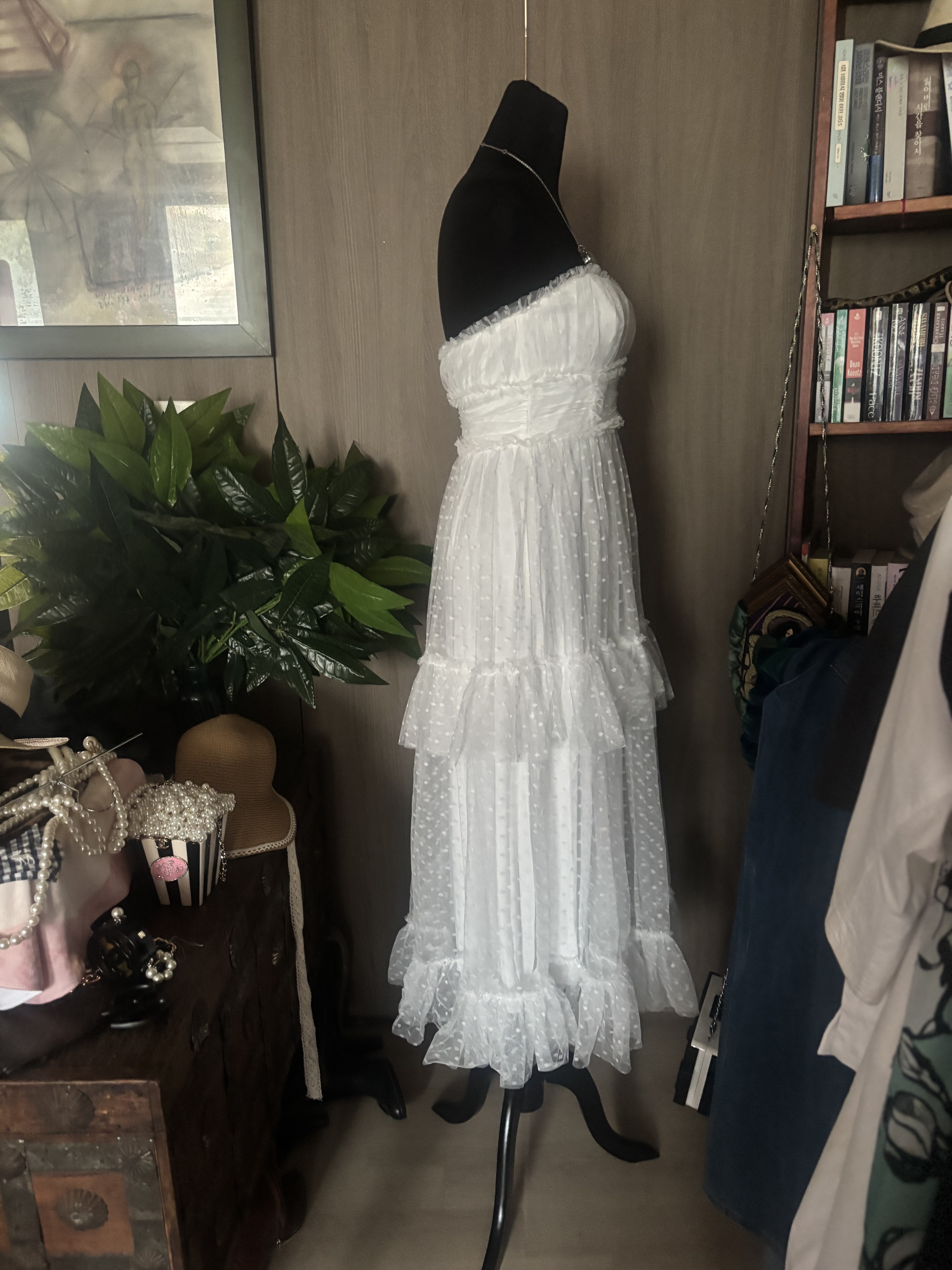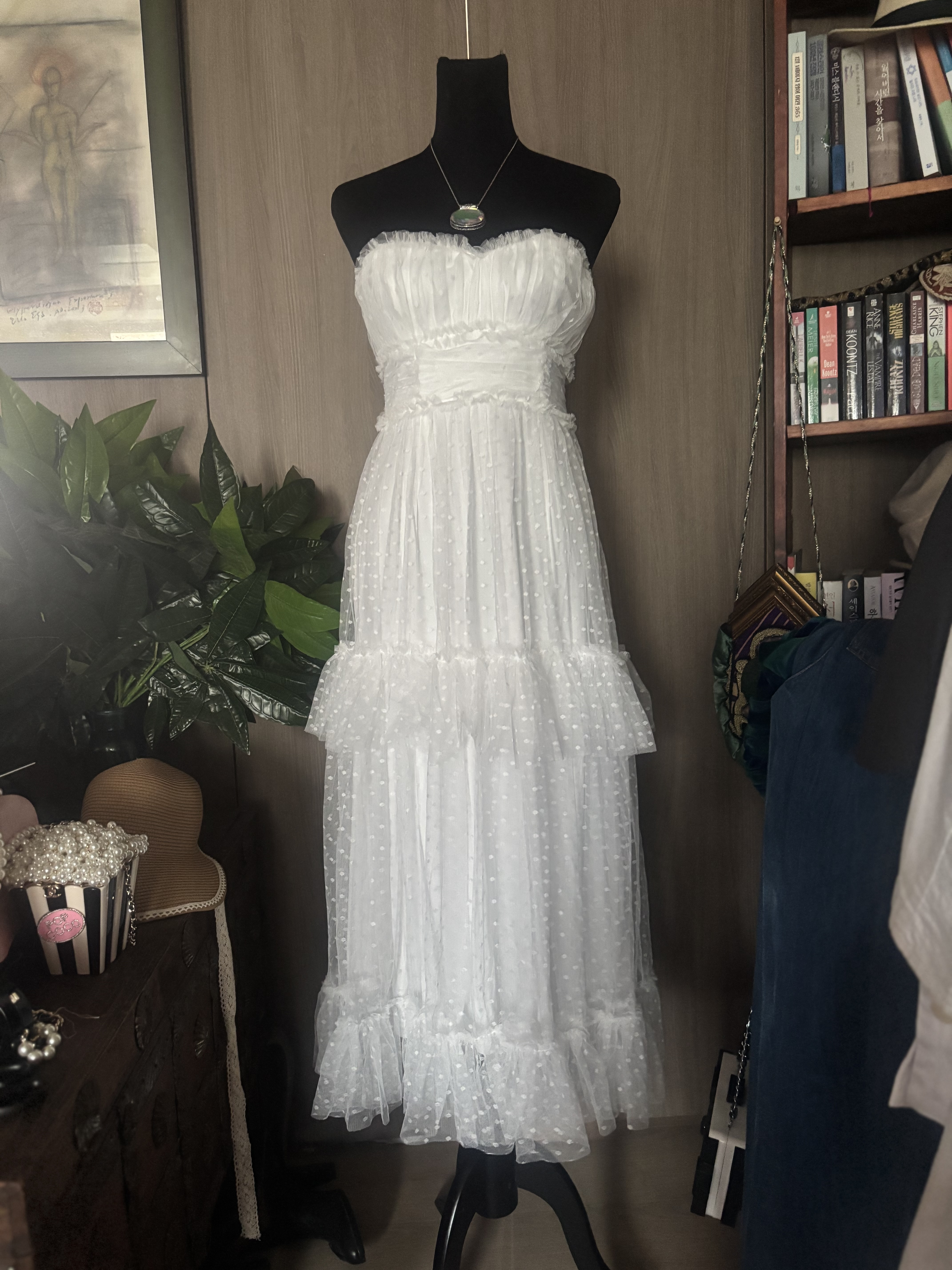 제 패션사전에 없던 단어들이 생겼어요 레이스, 핑크, 리본, 참 여성적인 용어들이죠 이뻐보이기 시작한거예요 내가 입기보다는요 관심이 전혀 없었던 패션이었죠 아니 외면했었어요 그런데 시간이 흐르고 강산이 변하더니 정말 여성다운 패션이 아름답다는걸 느끼게 된거예요 미학의 시야가 넓어졌댈까요 이 드레스는 저도 입고싶더군요 기분이 많이 좋아질것같은 느낌이 와요 행복에 빠진 기분좋은, 천진한 아이처럼요 미안한 말인것 같지만 꼭 한번은 입어보고 판매에 들어갈까 생각예요 담농질 한번 해 봤구요 희고 화사하고 발랄한 땡땡 무늬까지 아름다워질수있는 기회가온거예요 망설이지 마세요 꼭 가지고 싶다란생각이 ,자꾸 눈에 아른거린다? 그렇다면 취하세요 언제 이런 드레스를 입어보시겠어요 마네킹에 딱 맞았어요 55분들이 입으셔야 합니다 치수내일 재 드릴게요 tag 은 없고 데드스탁같습니다 새것이예요