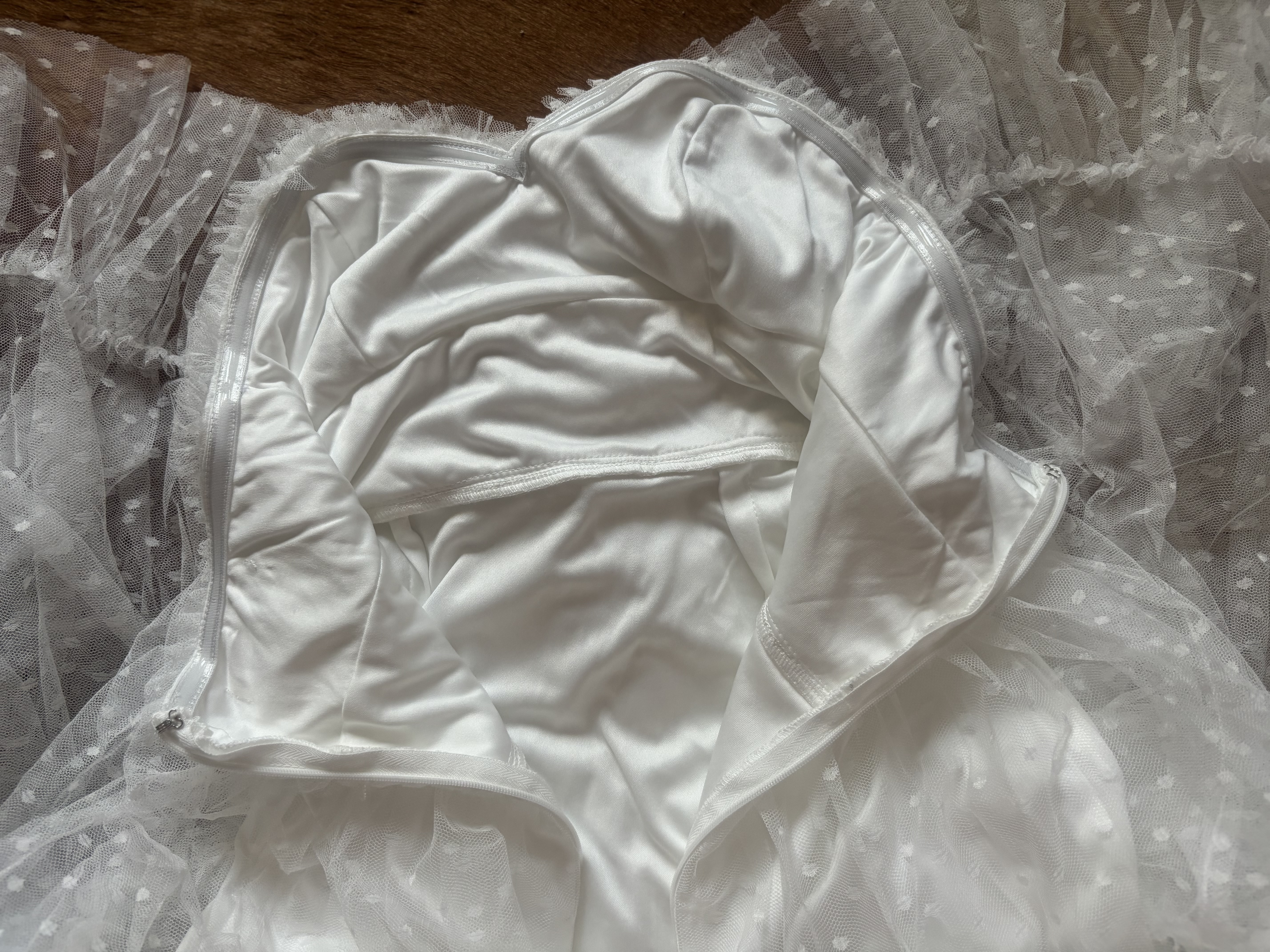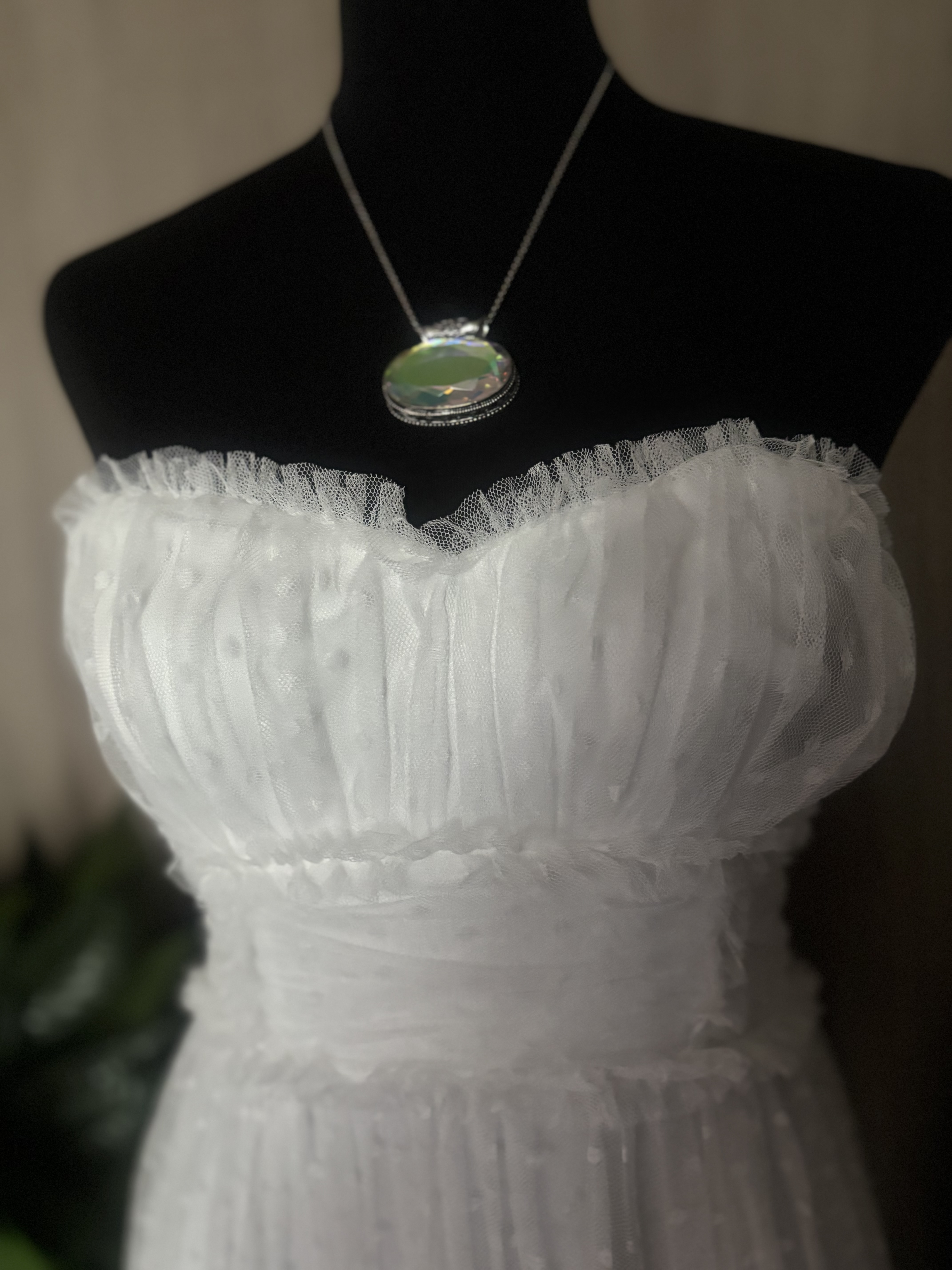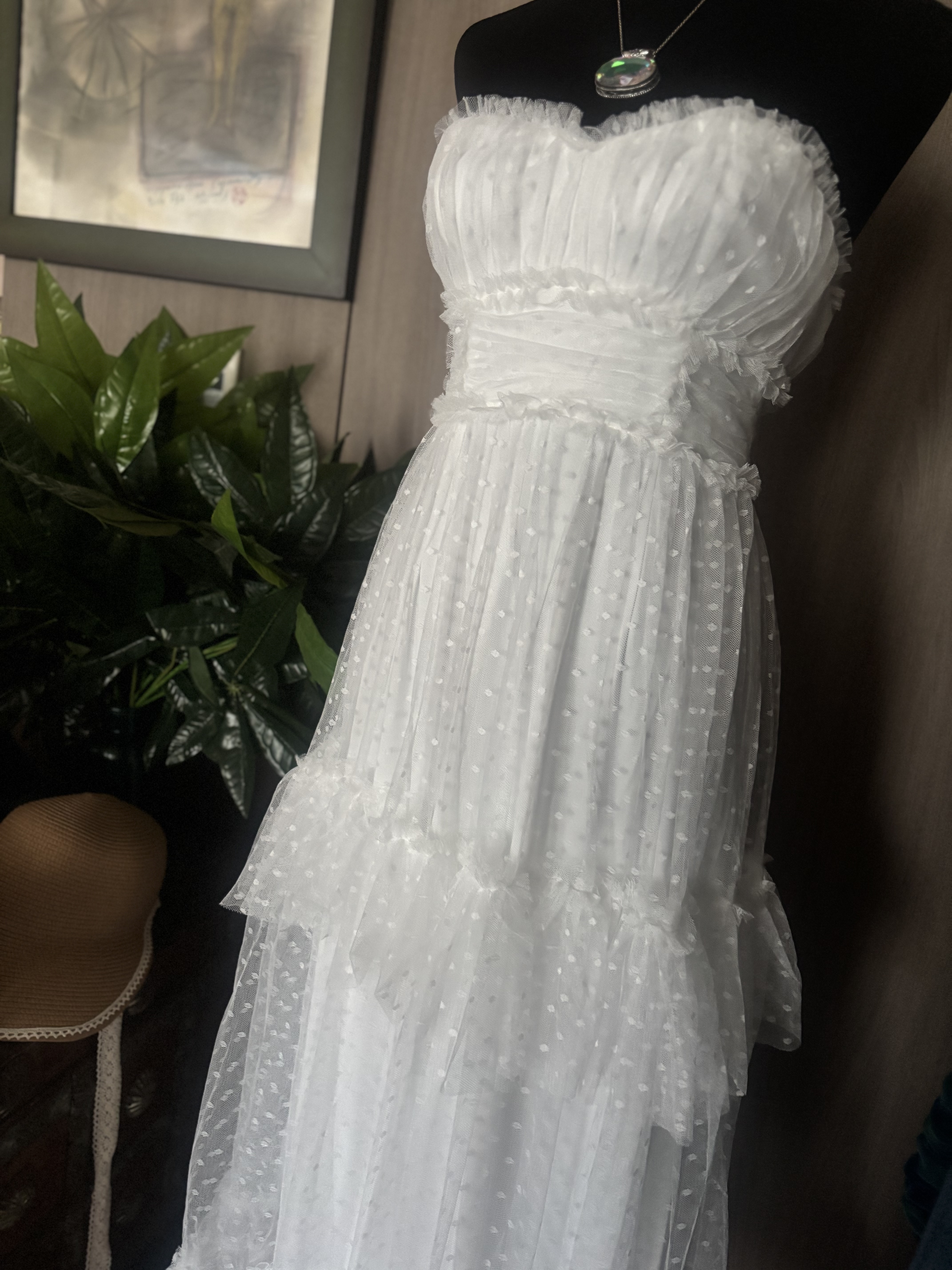 제 패션사전에 없던 단어들이 생겼어요 레이스, 핑크, 리본, 참 여성적인 용어들이죠 이뻐보이기 시작한거예요 내가 입기보다는요 관심이 전혀 없었던 패션이었죠 아니 외면했었어요 그런데 시간이 흐르고 강산이 변하더니 정말 여성다운 패션이 아름답다는걸 느끼게 된거예요 미학의 시야가 넓어졌댈까요 이 드레스는 저도 입고싶더군요 기분이 많이 좋아질것같은 느낌이 와요 행복에 빠진 기분좋은, 천진한 아이처럼요 미안한 말인것 같지만 꼭 한번은 입어보고 판매에 들어갈까 생각예요 담농질 한번 해 봤구요 희고 화사하고 발랄한 땡땡 무늬까지 아름다워질수있는 기회가온거예요 망설이지 마세요 꼭 가지고 싶다란생각이 ,자꾸 눈에 아른거린다? 그렇다면 취하세요 언제 이런 드레스를 입어보시겠어요 마네킹에 딱 맞았어요 55분들이 입으셔야 합니다 치수내일 재 드릴게요 tag 은 없고 데드스탁같습니다 새것이예요