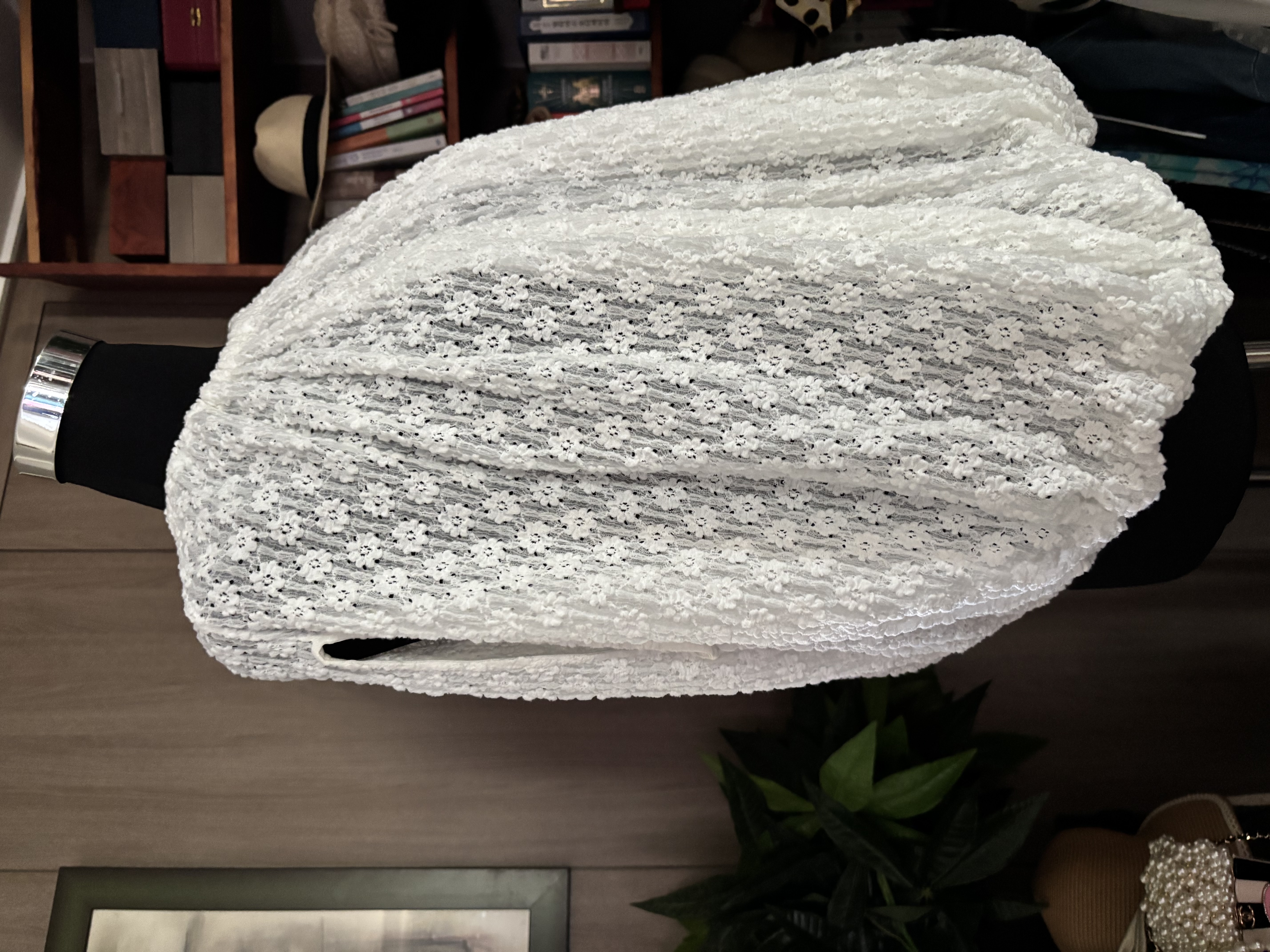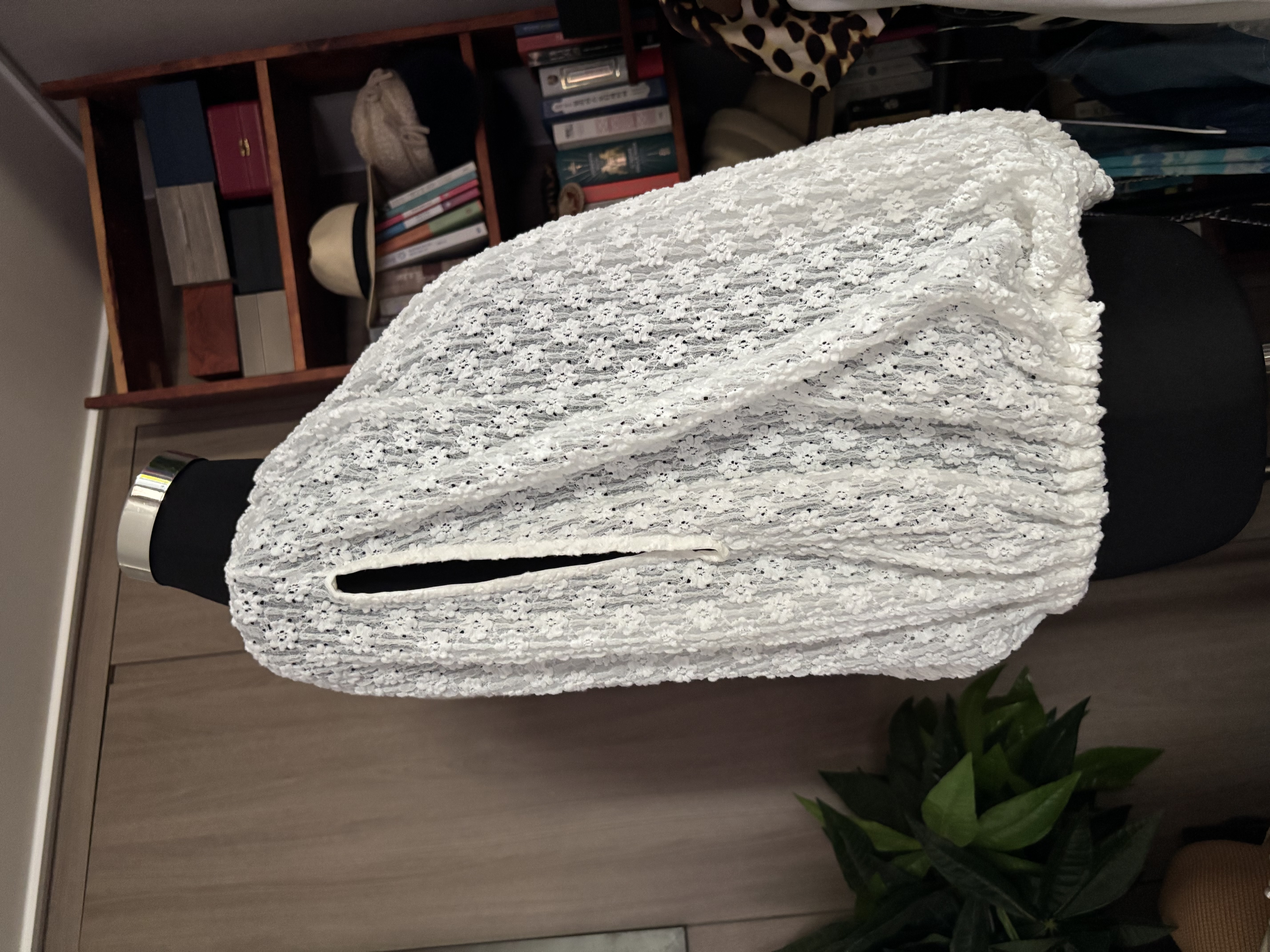 전체적으로 덮힌 자잘한 꽃문양이 너무 사랑스러워요! 판쵸스탈일로 팔만 내밀고 입으면 됩니다 매우 편안하고, 옷 전체가 마치 다 밴딩된듯한것처럼 너무나 플렉서블해서 가만히 두면 오므러지는 스탈예요 목 부분 아랫단부분이 밴딩이긴하지만요 입으면 자연스럽게 넓혀지는 거죠 제가 질 샌더 를 좋아해서 그런지 꽤 많이 소장하고 있는 편입니다 심플하면서 세련된 옷들이 많거든요 컨디션은 말도마세요 새것같으니까요 61 % 폴리미아드 36% 코튼, 3% 엘라스틴이 함유되어 있어요 이태리 표기로는 40 늘리지 않고 잰 가반은 50cm, 총장 57cm 더 늘어난다고는 하지만 55 분들이 입어야 예쁜 실루엣이 나올거예요