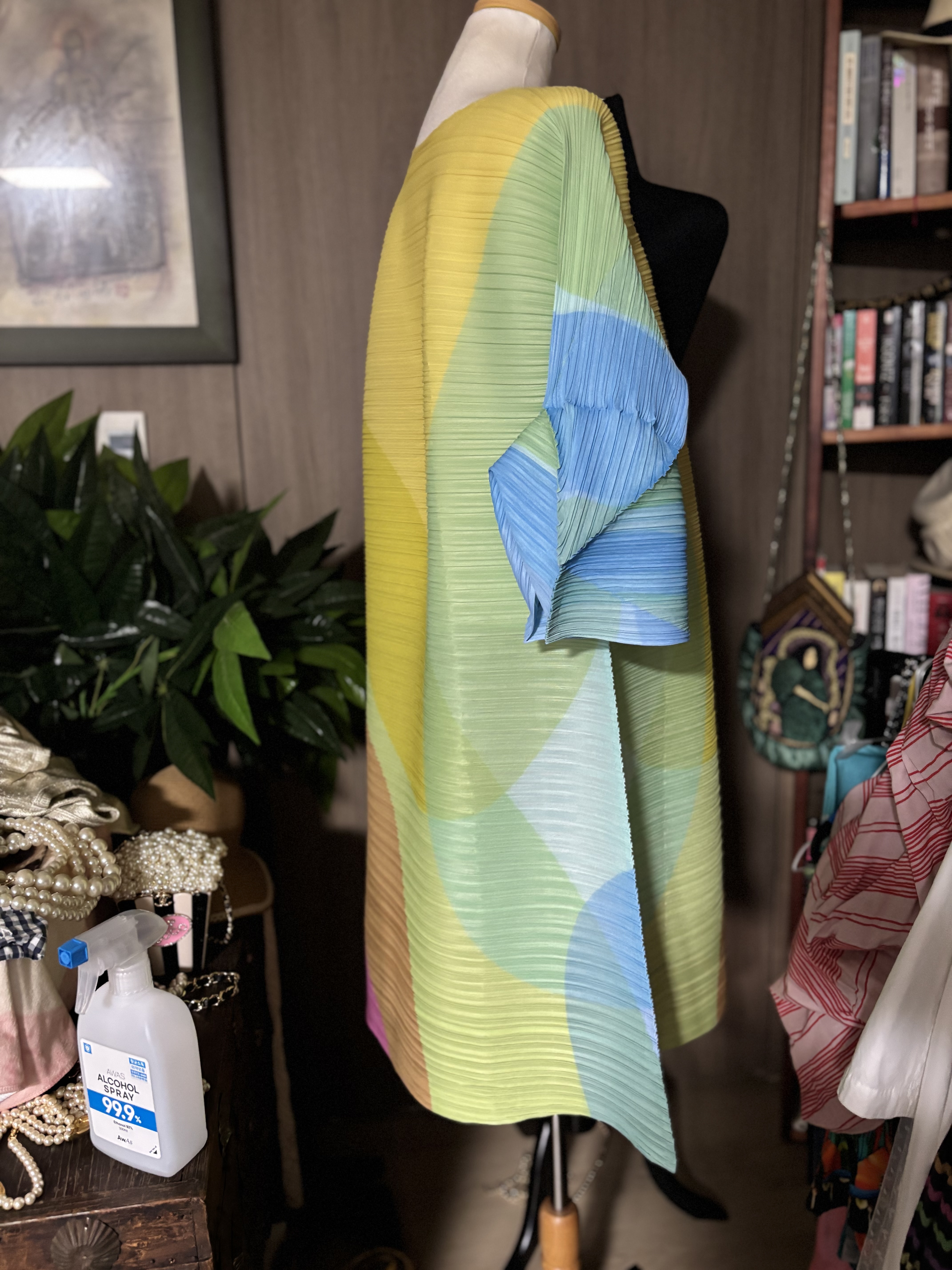 앗 이뻐 ! 의 한마디가 첫눈에 나온 표현이예요 더 이상의 미사여구는 생각도 나지않고 , 아니 없다는 말이 맞을겁니다 뭐가 이리 이쁠까요? 컬러풀한 색의 향연이 절 설레게 했답니다 여러분은 안그러셨어요? 이세이 미야케와는 전혀 상관없는? 브랜드 없는 플리츠 드레스인데 입으면 너무 편한하다는것 몸에 들러붙지 않는다는것 한눈에 확 띄게 이쁘다는것 너무 튀어서 부담스러운 분들 여행시 가져가세요 아무래도 외국에서의 시선은 훨씬 자유로우니까요 남들은 이세이 미야케로 착각할만큼 재봉, 디자인 훌륭합니다 개지 않고 둥글둥글 말아서 짐에 넣어도 구김은 전혀없는 옷인지 잘 아시죠? 소매부분의 디테일도 한몫합니다 하나 장만해 놓으시면 트렌드와는 무관하게 입으실수있는 아이템이죠 ! 잘 늘어났다 제자리로 탁 돌아오는 신축성 굿입니다 이런 플리츠제품은 사이즈에도 구애를 받지 않는다는거 그래도 55~ 66 분들이 입으시면 좋겠어요 살점이 많으시분들도 맞기는해요 하지만 몸매가 자칫 똥똥해 보일수 있어요 상관없다 그냥 입겠다 하시는 어르신께도 강추! 이쁜 컬러블럭 드레스 즐겨보심이 어떨지요