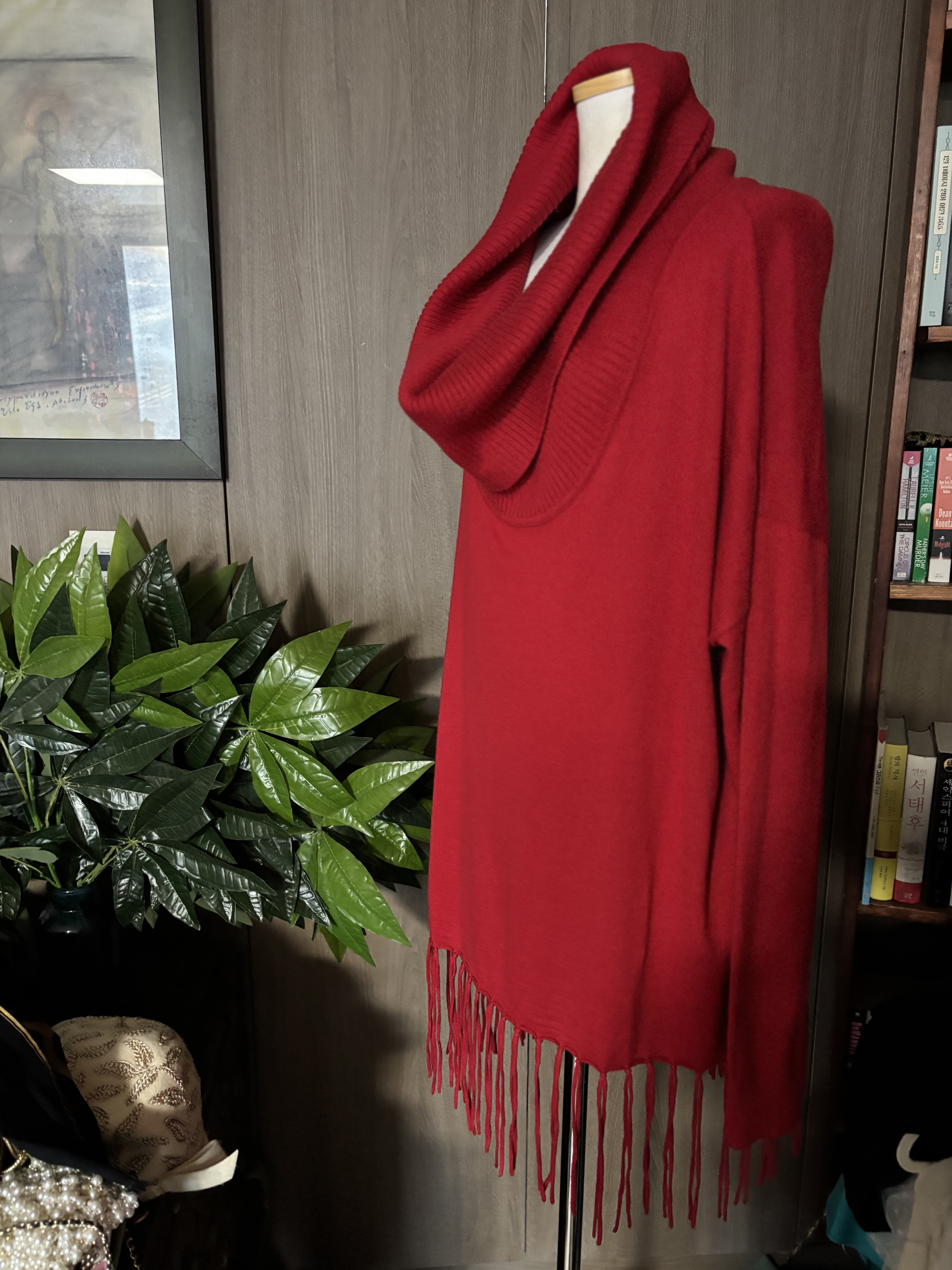 얘는 보기보다 입었을때 이쁜아이 입니다 요새 커울 넥 니트를 보기가 힘들던데 -제가 돌아다니질 않아서 잘 모름 - 이렇게 크게 너울지는 니트는 90 년대엔 많았던것 같아요 종종 입었던것 같고 아스라히 지나가는 옛 추억 떠오르네요 그냥 짧은 터틀도 좋아하지만 전 크게 너울이 지거나 목 길이가 긴 터틀을 좋아해요 왜? 훨씬 멋져보이는 옷들이거든요 밑단은 프린지 로 마무리 니 하이 부츠와 잘 매치가 될겁니다 가단 66cm 총장 66cm, 터틀길이 32cm 태슬길이 17 cm