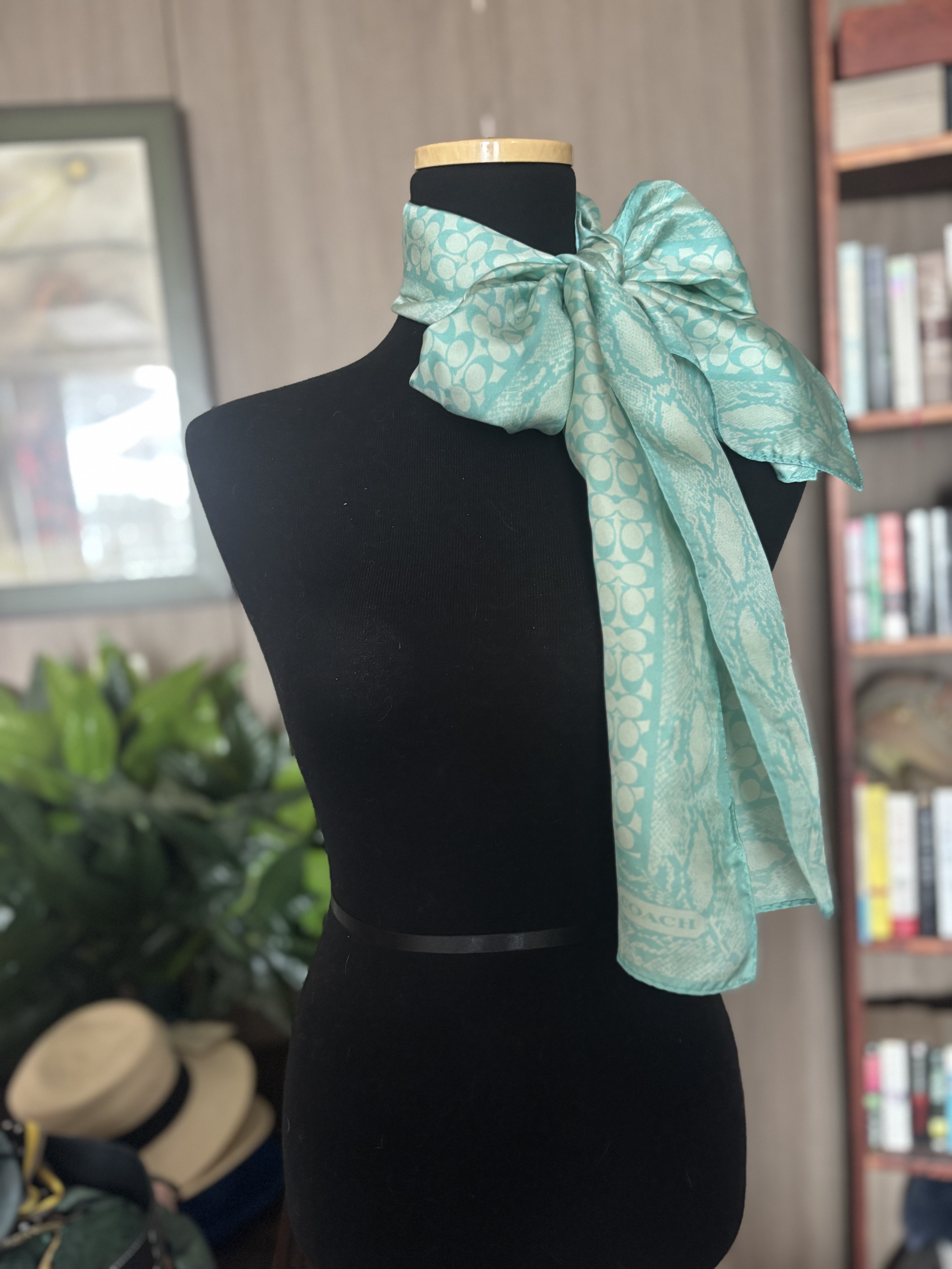 150cm, 25 cm. 차분한 옥빛 컬러 스카프 가장자리는 뱀피문양을 양사이드에 새겨져 있어요 가운데 부분에 본격적으로 코피 코치 코치 코치의 로고를 때려넣었습니다 이뻐요 고급스럽고요 그리고 100%silk 군요 ! 컨디션 좋아 퍼펙이네요!