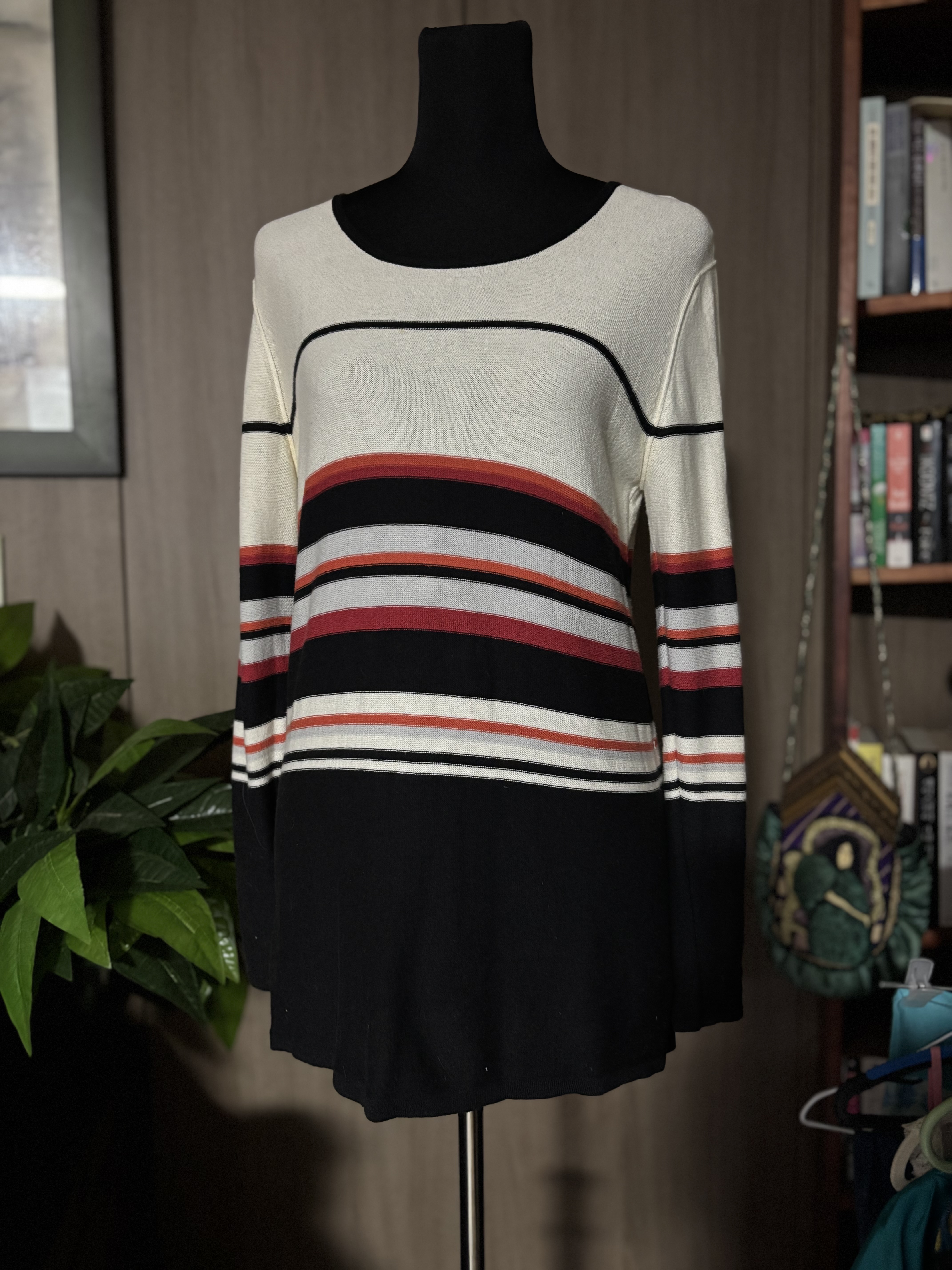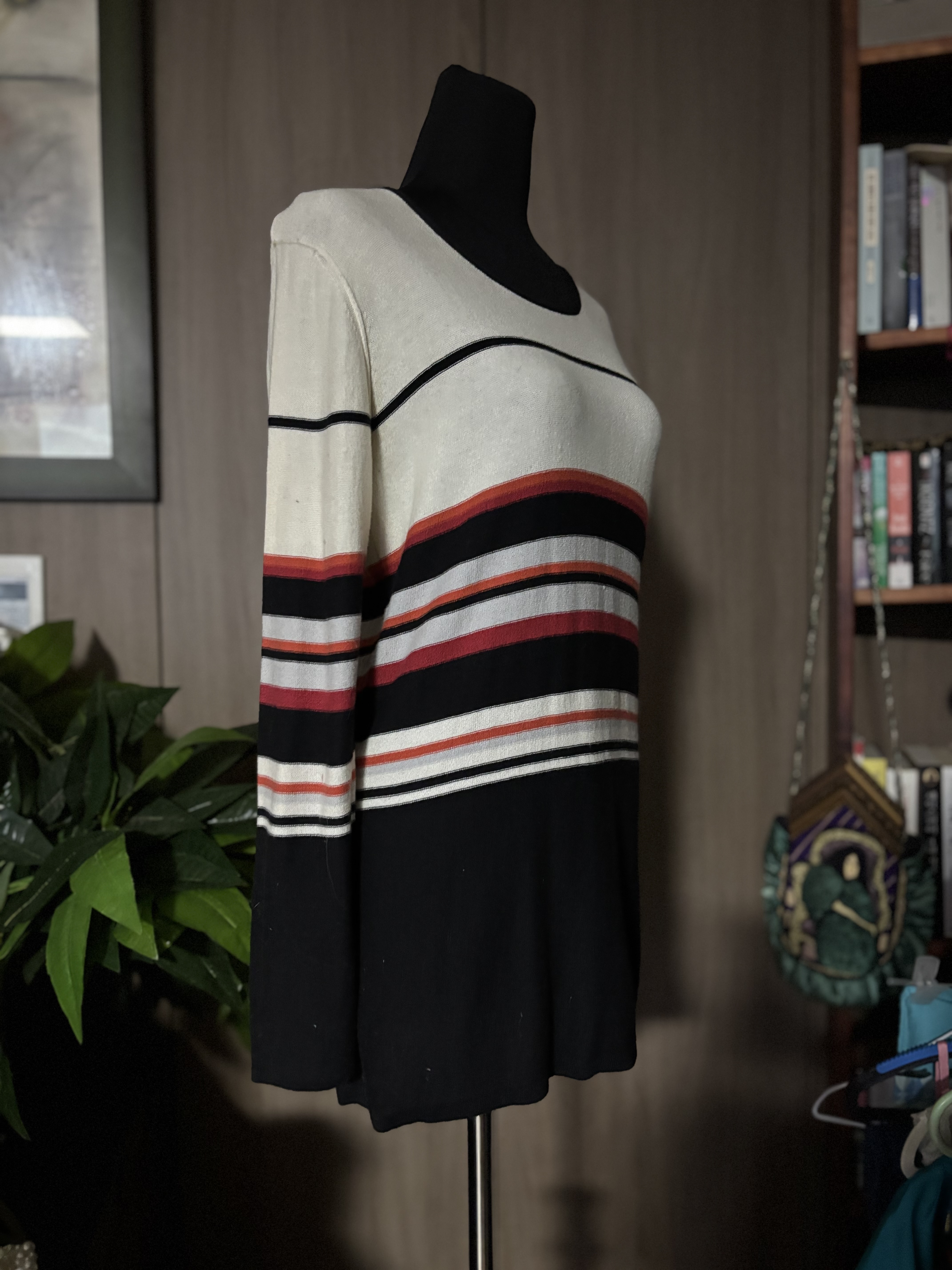 면과 레이온의 혼방 소니아 리켈 할머니 사랑합니다 ^^ 제가 좋아하는 디자이너중 한명이세요 20년이 넘었는데도 멀쩡하니 혼자서 때 란 애 한테 당한 죄밖에 없는애예요 여러컬러가 혼색되어 있는데요 이 옷은 오렌지 컬러가 살려줍니다 사진상 레드에 뭍혀서 표가 안나는데요 실물은 오렌지가 주도 하고 있어서 더 이쁜것 같아요 제가 오렌지 컬러를 좋아하는 것도 있지만 오렌지 컬러가 포인트로 배색하신것 같기도 하구요 암튼 홈 드라이같은 제품으로 때 한번만 벗겨주시면 새 아이로 태어나 잘 입게 되실겁니다 옷의 표면은 아주 쬐금 가슬 한 느낌 이예요 프랑스 디자인이지만 그옛날에도 중국에서 생산해 낸 아이예요 많이 가격 낮춰 드렸습니다 가단 45cm, 총장 70cm 그리 길어보이지 않은데 !