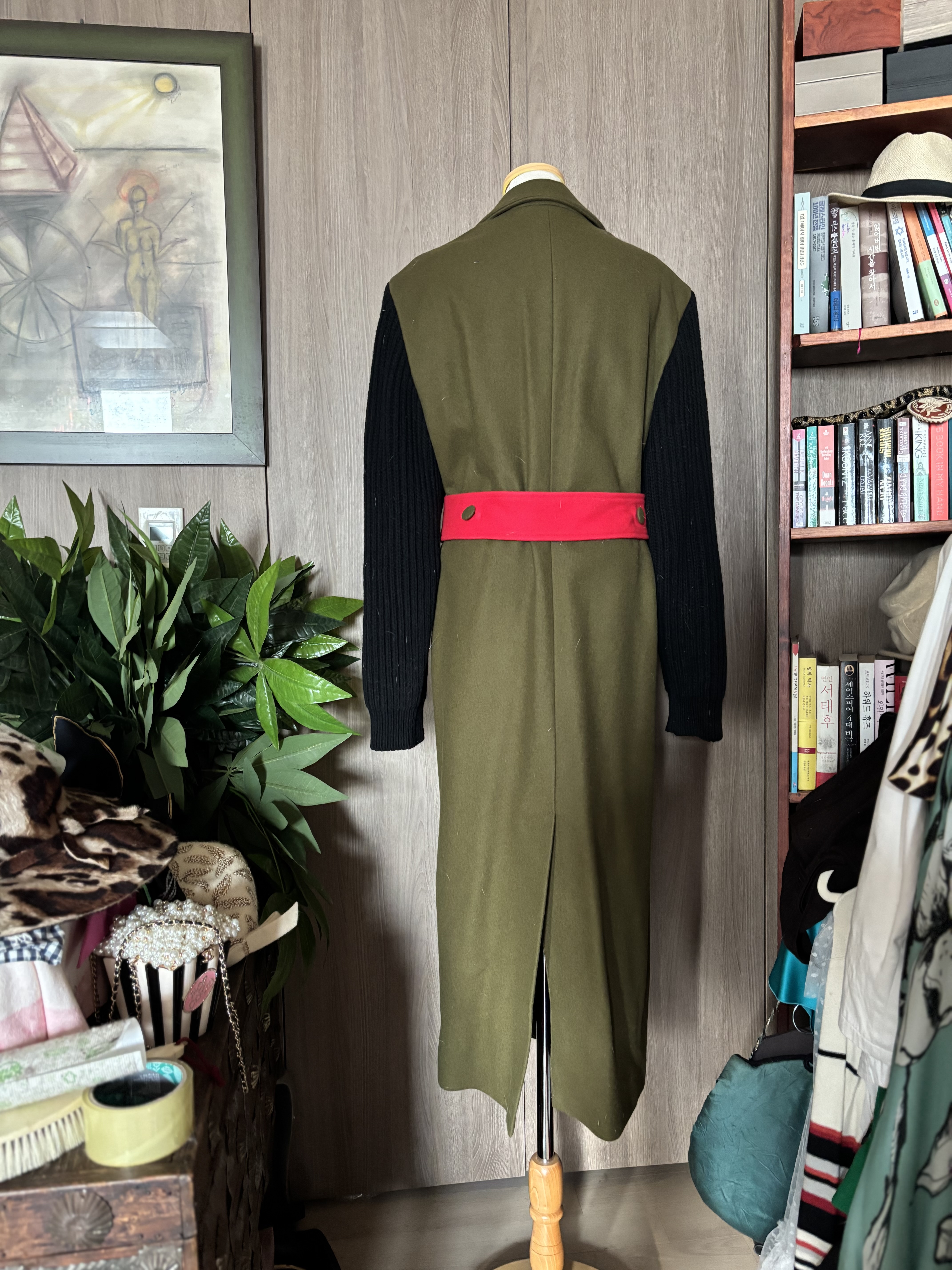 전 군복이 참 멋지다고 생각해서 유일하게 몸에 핏되는 옷을입는건 군복같은 코트예요 트렌치코트도 군인들이 입었던 옷으로 지금은 너도나도 즐겨입는 옷이 되었죠 카키색으로 된 몸통부분의 느낌은 빳빳? 하고 단단하고 두툼합니다 -군대담요 생각이나네 ㅎㅎ-  그래서 팔 부분은 여성스러움을 살리기위해 니트로 만들었고요 와 빨간 허리끈이 당연 멋스럽고세련된  포인트가 되고 있어요 전 전생이 장군의 딸이었나봐요 군대얘기도 재밌고 tv에서 군에간 연예인들이 나오는 프로그램을 재밌게 봤어요 또한 군복같은 옷을 좋아하니 말예요 전 정말 루즈하고 오버사이즈의 의상을 입거든요? 몸에 핏 되고 유니폼같은 옷을 입는건 오직 군복같이 각이 선 코트를 좋아해요 셀린 제품으로도 이러한 코트가 있는데 잘 입었어요 나중에 선뵈일께요 가단 53cm, 어깨 45cm, 총장 126cm - 길다고 우려하지않으셔도 되요 허리끈으로 묶으면 길이가 좀 짧아질것이고 힐 부츠를 신으셔야죠 굽없는 플랫슈즈를 신으려 하는건 아니시죠?  Wool 80%, poliammide 20%  이딸랴 사이즈 표기 42  입니다