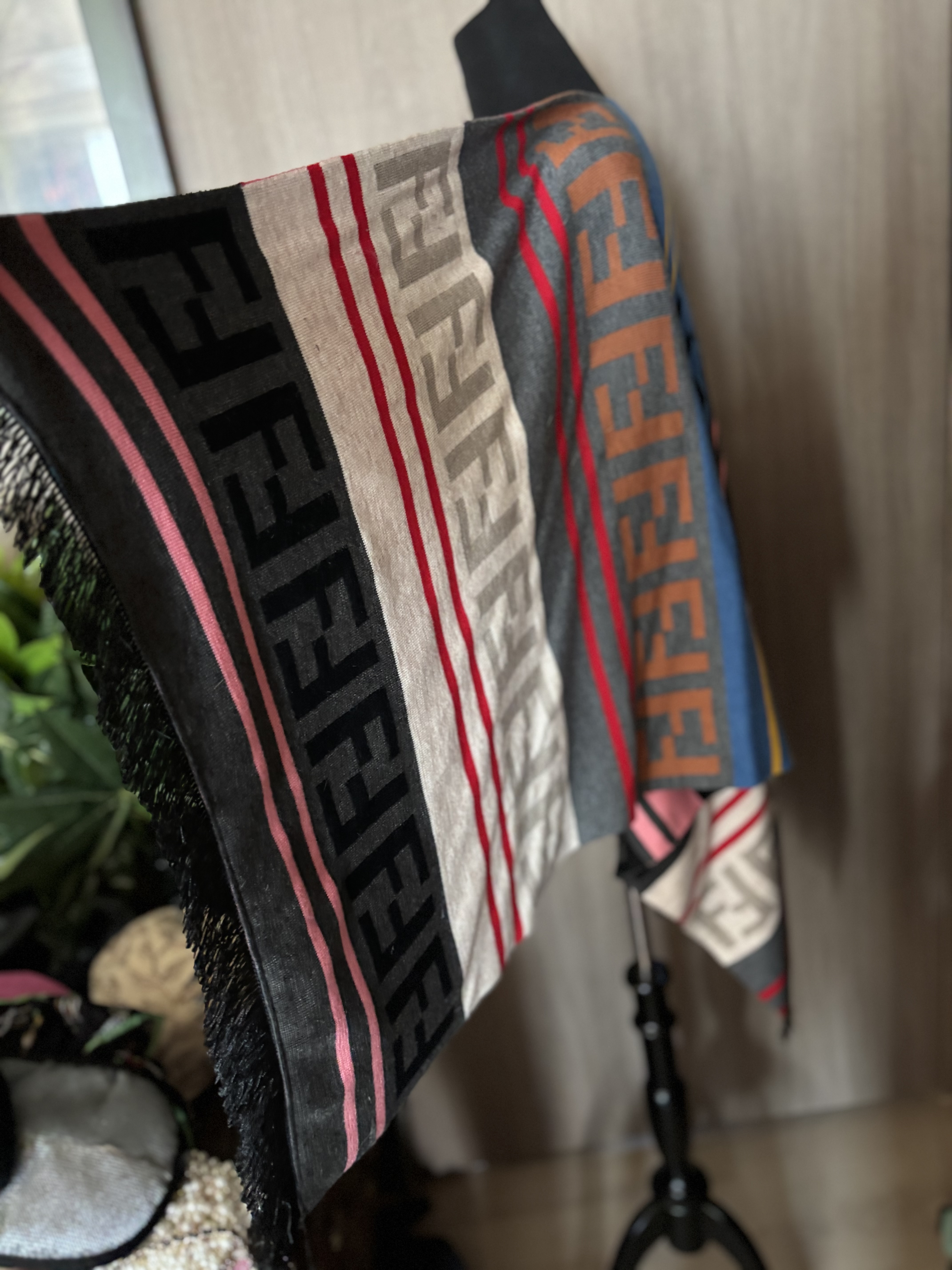 컬러풀한 펜디 본 적 있으세요? 예쁘죠 거의 머플러나 쇼올은 마룬컬러와 베이지 이런 컬러들만 봐왔을 것입니다 컬러풀하게 만들어도 이렇게 이쁜데 고유의 컬러들만 고수하고 있죠 지금도 바뀌지 않는것 같은데 혹 요즈음엔 다른 컬러도 있나요? 그럴수도 있겠지만 얘는 이쁜색들로 구성된 멀티컬러라 nice 하군요 저도 그 점때문에 보자마자 픽 한 제품이예요 블랙코트에 포인트로 둘러주시면 참 고울것 같군요 72cm, 뒷면길이 77cm, 66까지 가능합니다