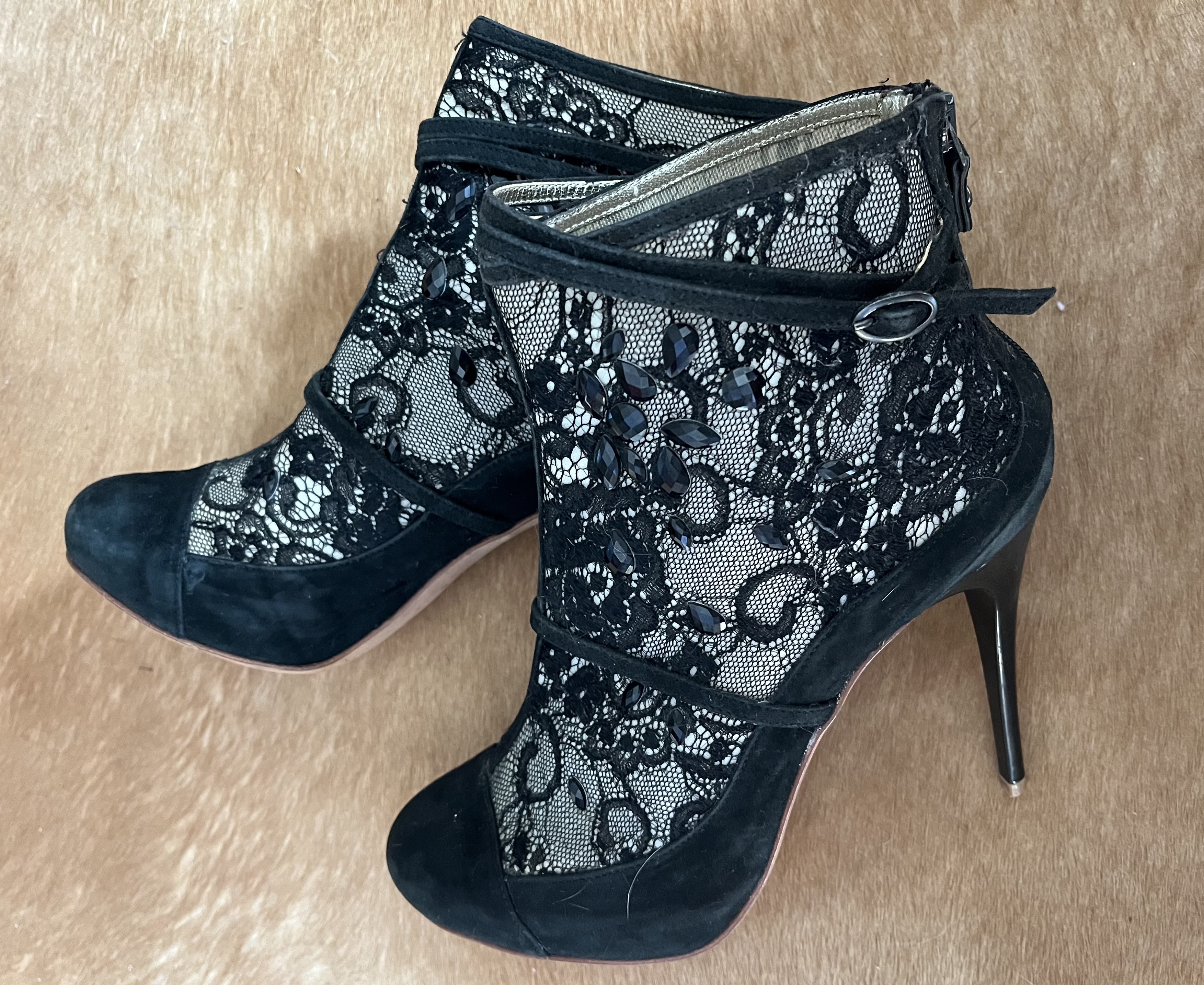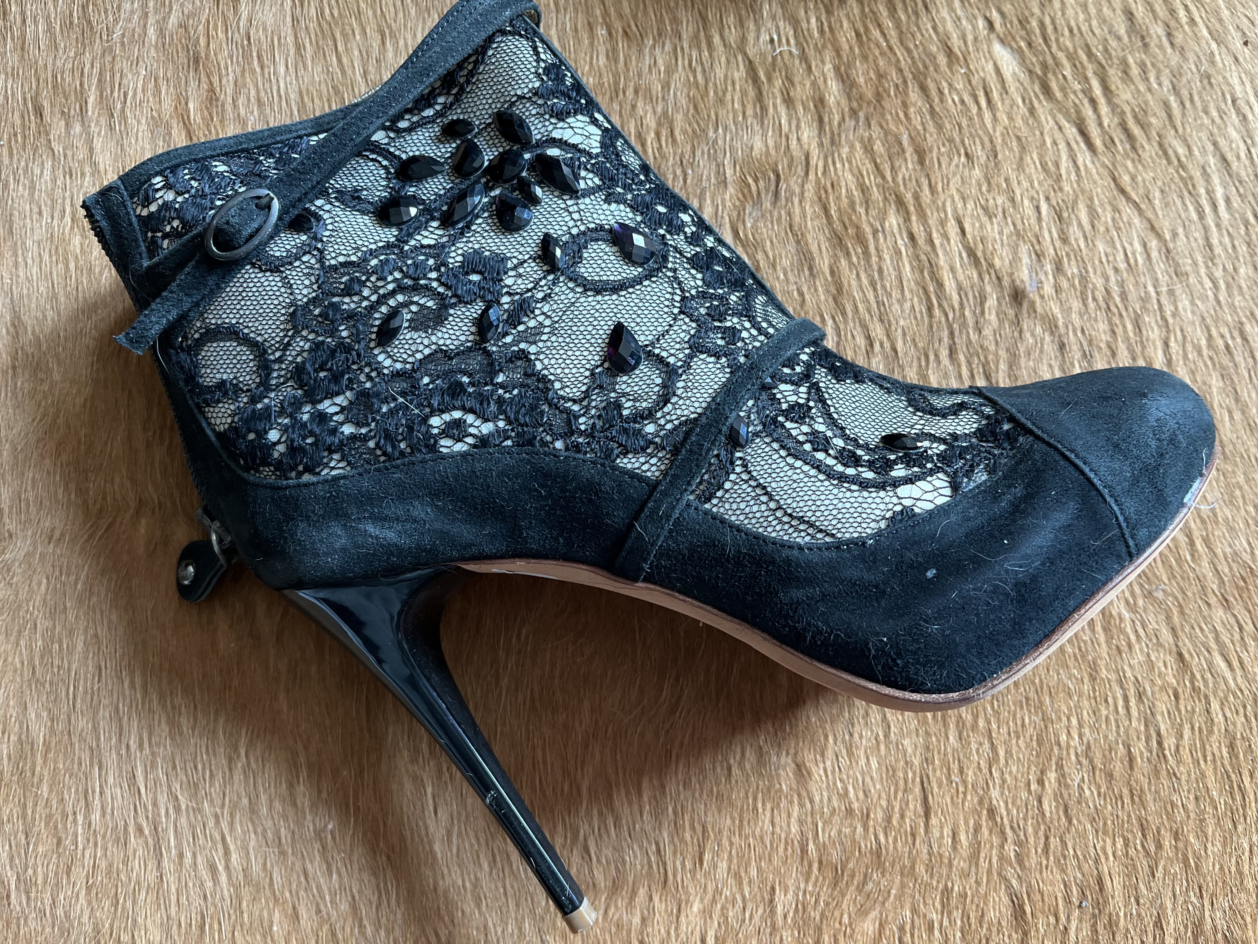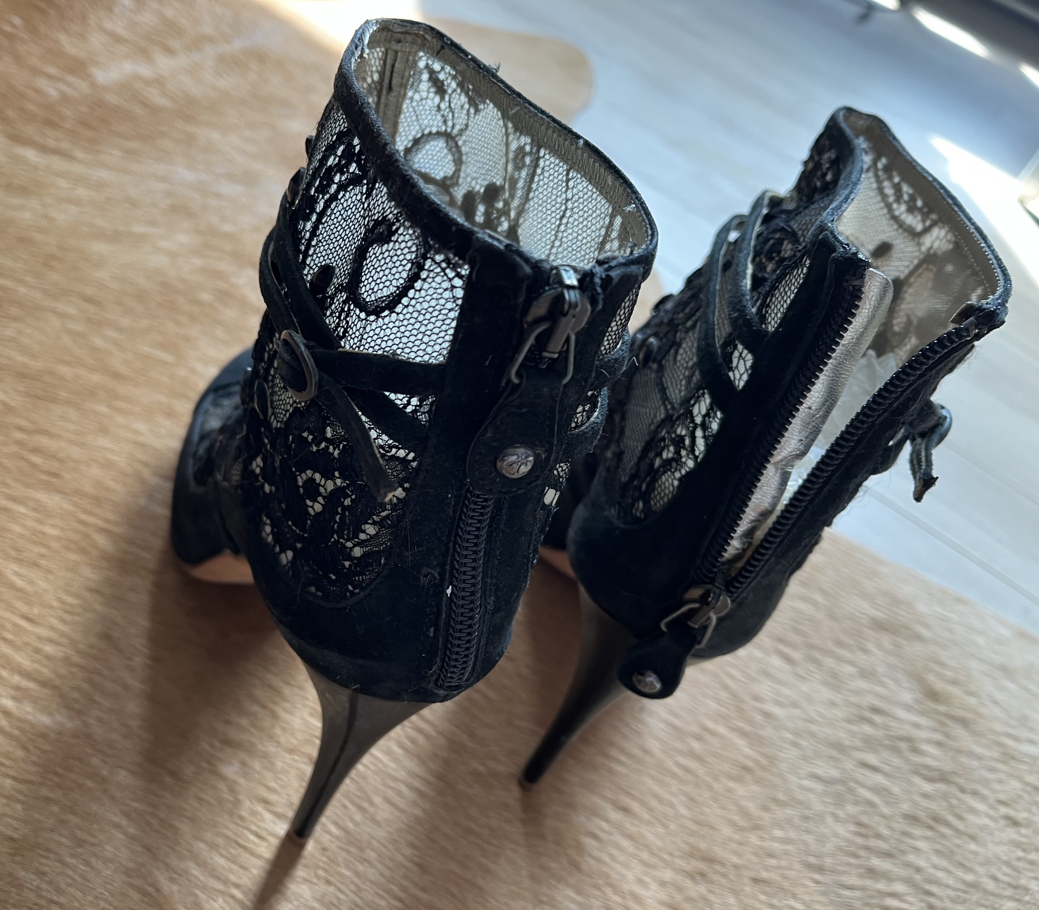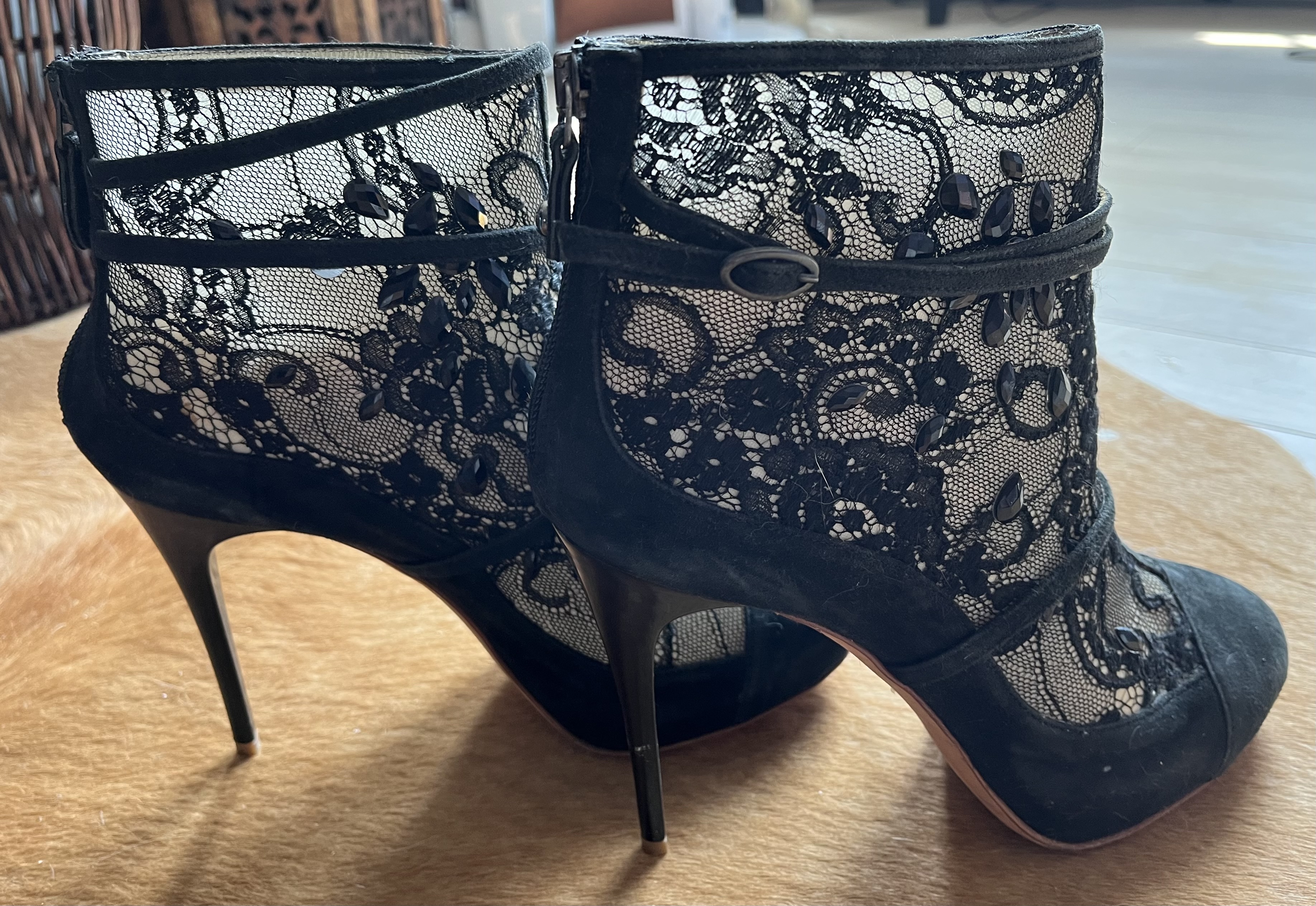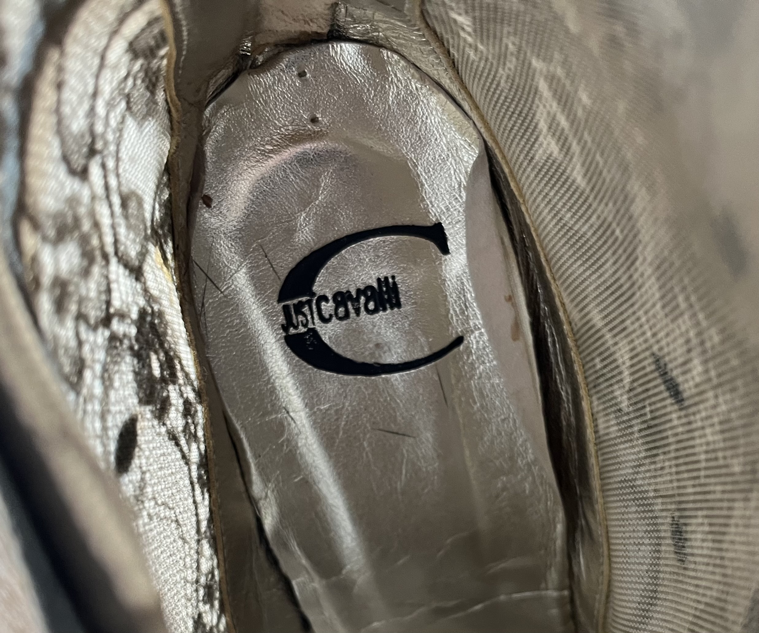 로베르토 카발리의 second brand인 just cavalli 라이트하고 캐주얼한 형태인 디자인이라 무겁지 않은 제품들이 많아요 Roberto Cavalli 보다는요 레이스와 비즈의만남 하나의 작품이라 감히 칭해 봅니다 아무래도 손이많이가는 정교한 디테일이라서요 착용시 발이 비치진 않아요 마치 살이 보일듯 시 스루 같아보이지만 아니에요 봄이나 여름에 신으면 날렵하면서 나이스할듯 10cm의 힐 39size. 구매후 한번도 신지않음