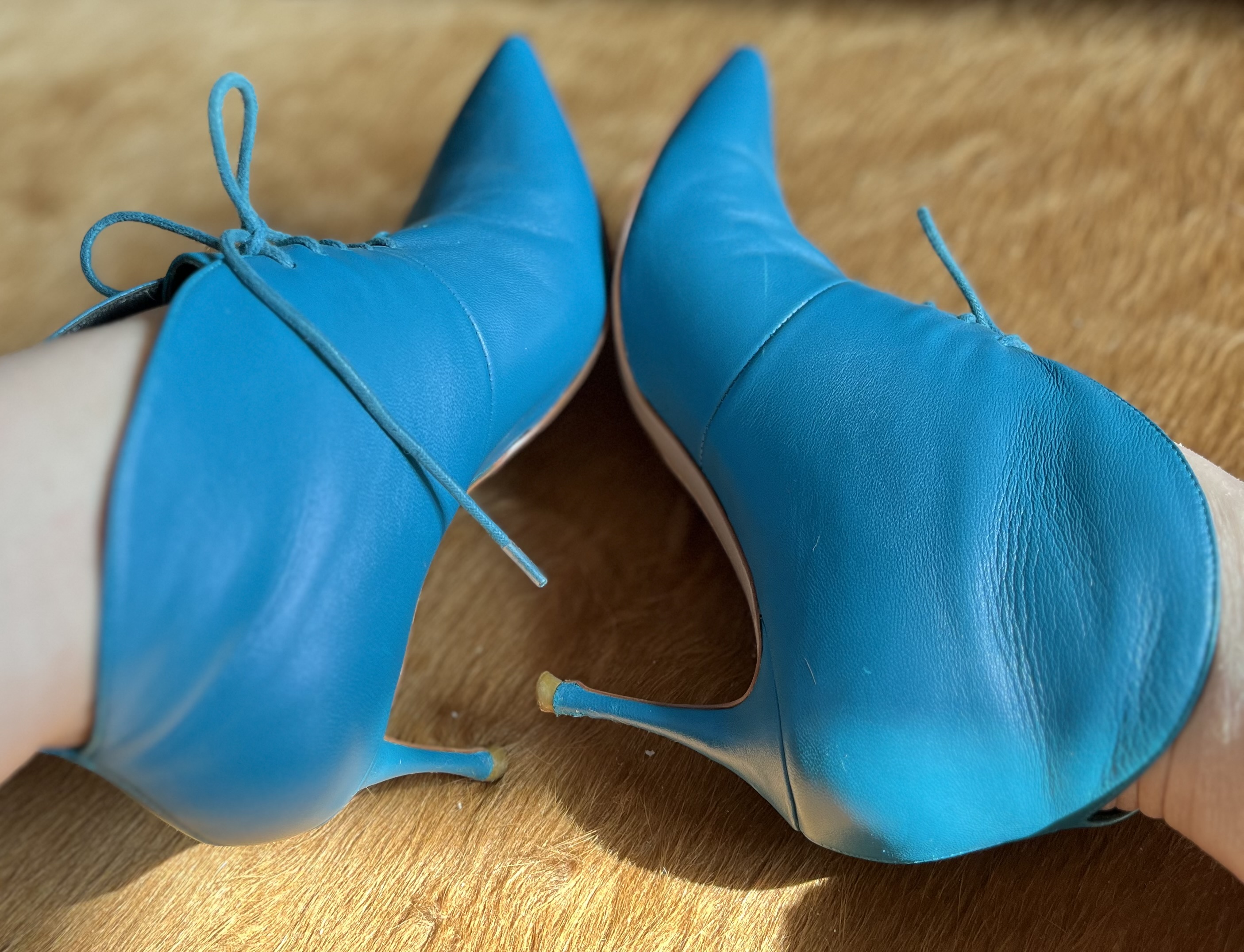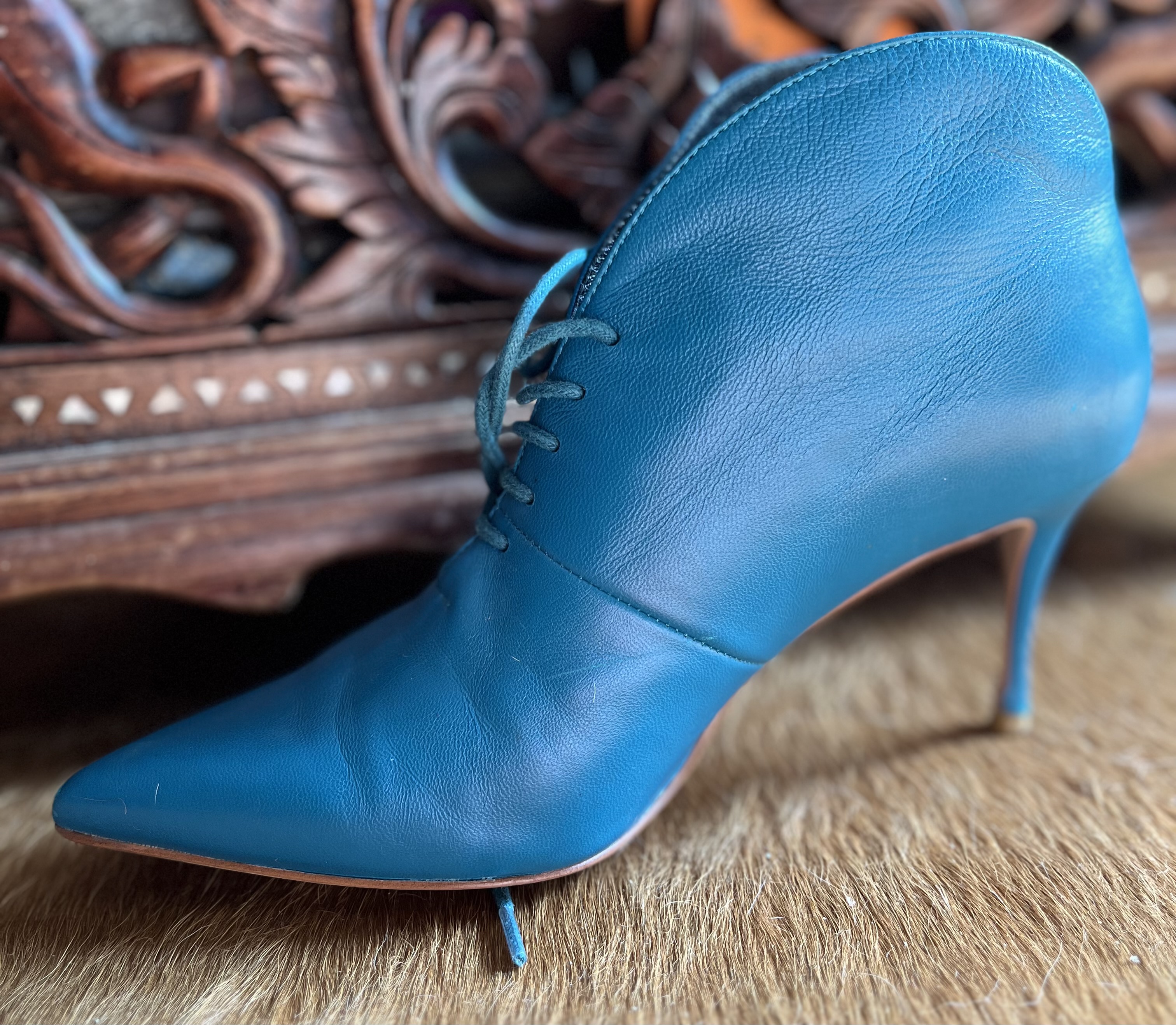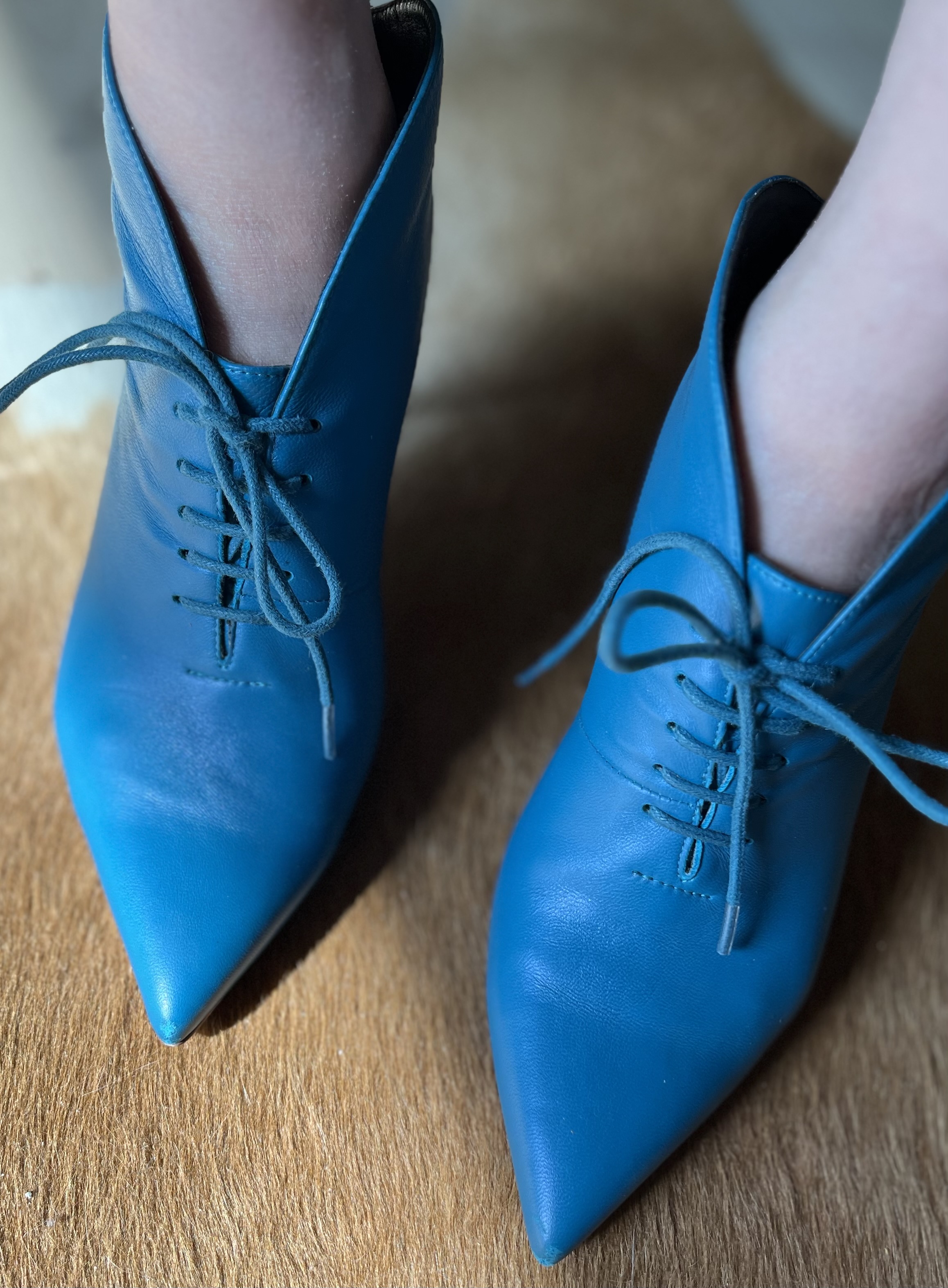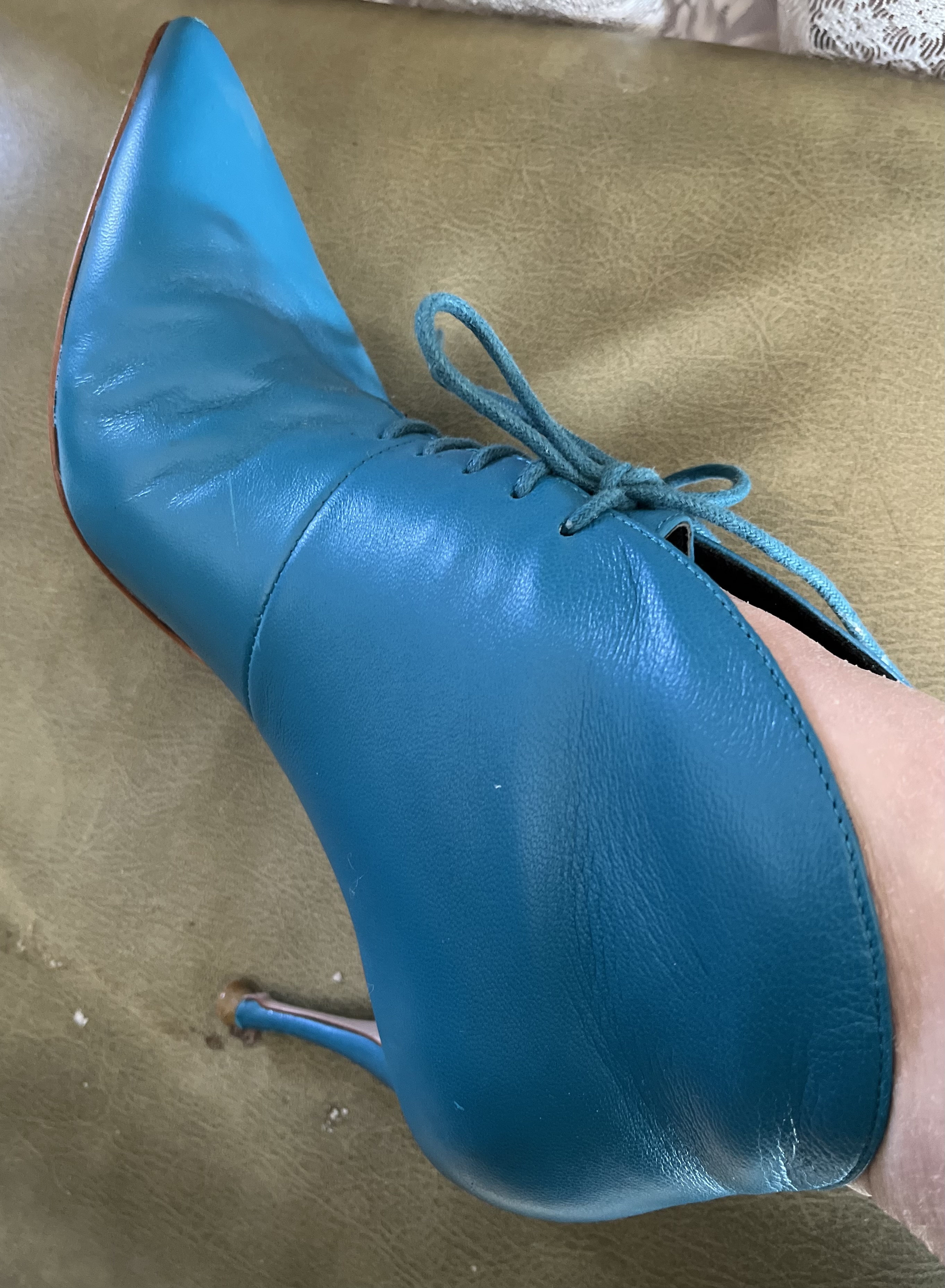 사진엔 컬러가 조금 환해 보이는 블루같은데요 실물은 다운된 teal blue 입니다 더 멋쟁이 컬러죠 한국에선 이런 컬러를 잘 쓰지 않을꺼예요 조합하여 섞이기 힘든 컬러라 그럴테죠 하지만 유럽이나 미국, 이 컬러를 참 여기저기 많이씁니다 보태가 베네타의 꼬임백에도 틸 블루가 있고 커튼, 슈즈, 백, 심지어 의류에도 사용하지요 옆모습의 잘빠진 곡선이 얄상하니 잘 빠졌습니다 세련됨까지 갖췄구요 부들부들양가죽임에 틀림없어보입니다 샤샤 파비아니라는 브랜드인데 제 생각엔 Spain 산 같군요 한가지 쬐금 안타까운부분은 부츠 앞 코에 미세한 까짐이 있는데 실물로 보면 아무것도 아닌 아니 찾아보지않으면 뵈지도 않을 흠이라 걱정은 붙잡아 주셔도 좋습니다 부츠바닥의 몇번 신은 흔적 - 상관없는 부분이죠- 이외에는 굉장히 좋은 컨디션입니다 37 size 볼 좁은 240. 포인트 제품