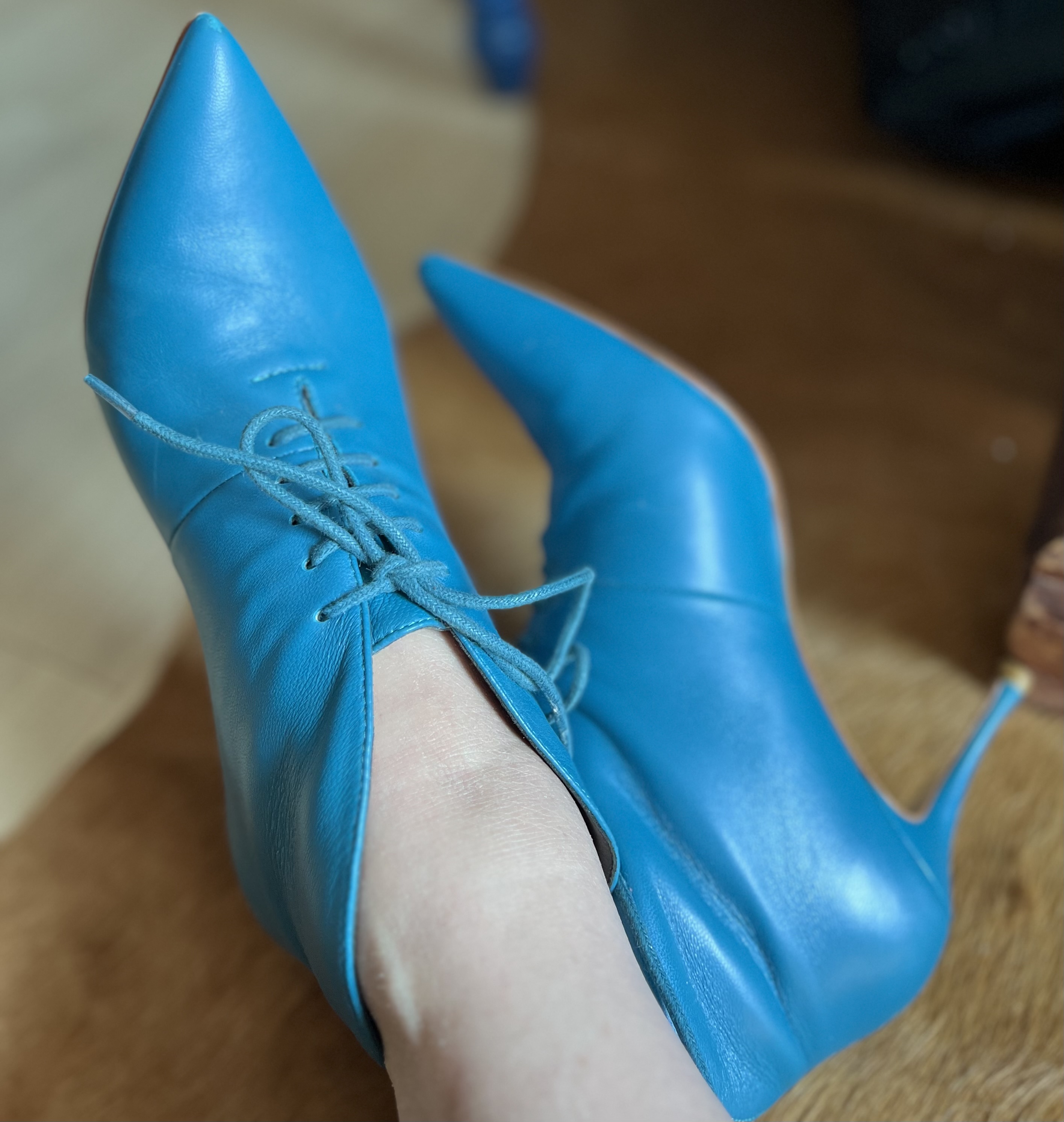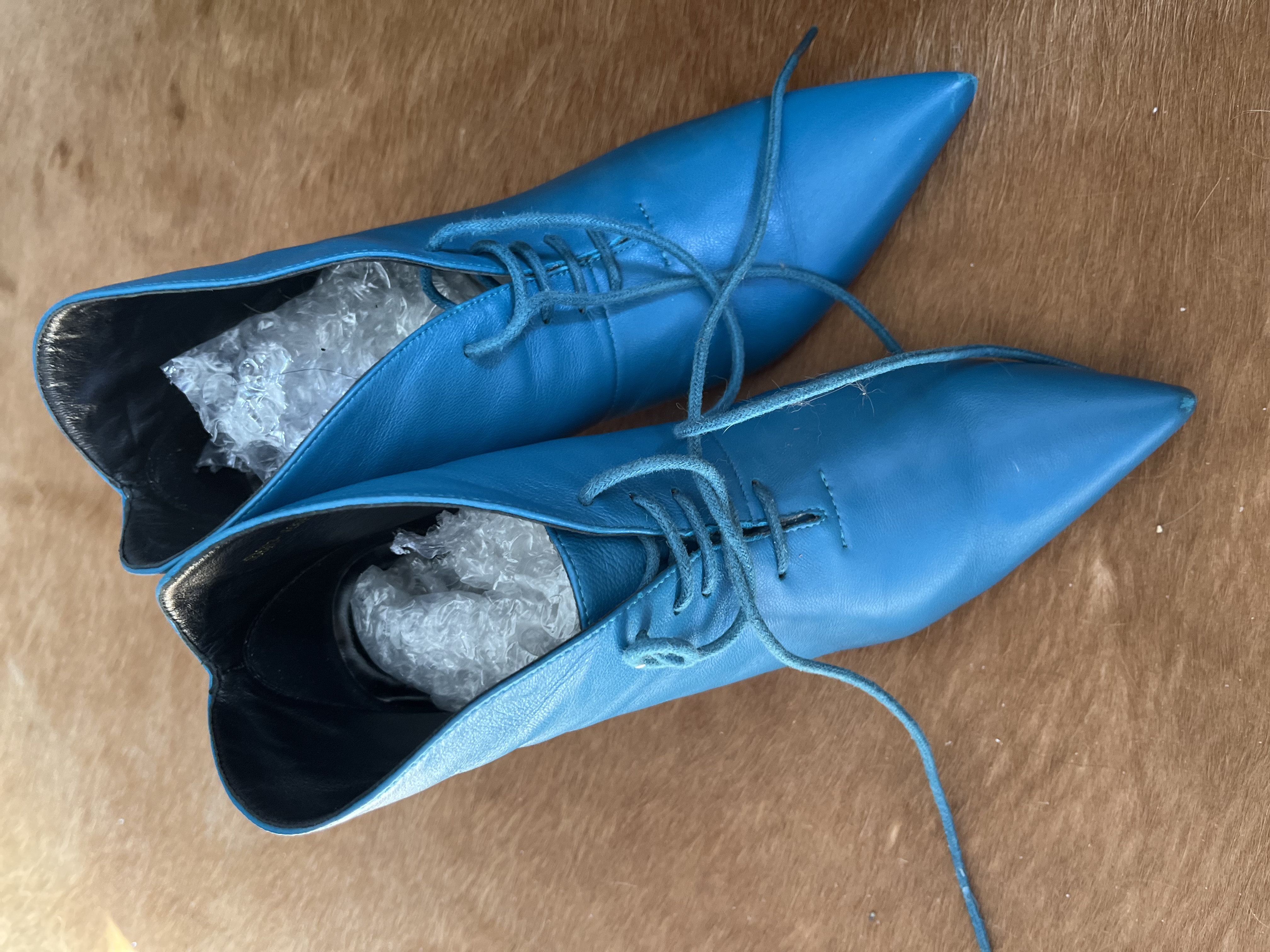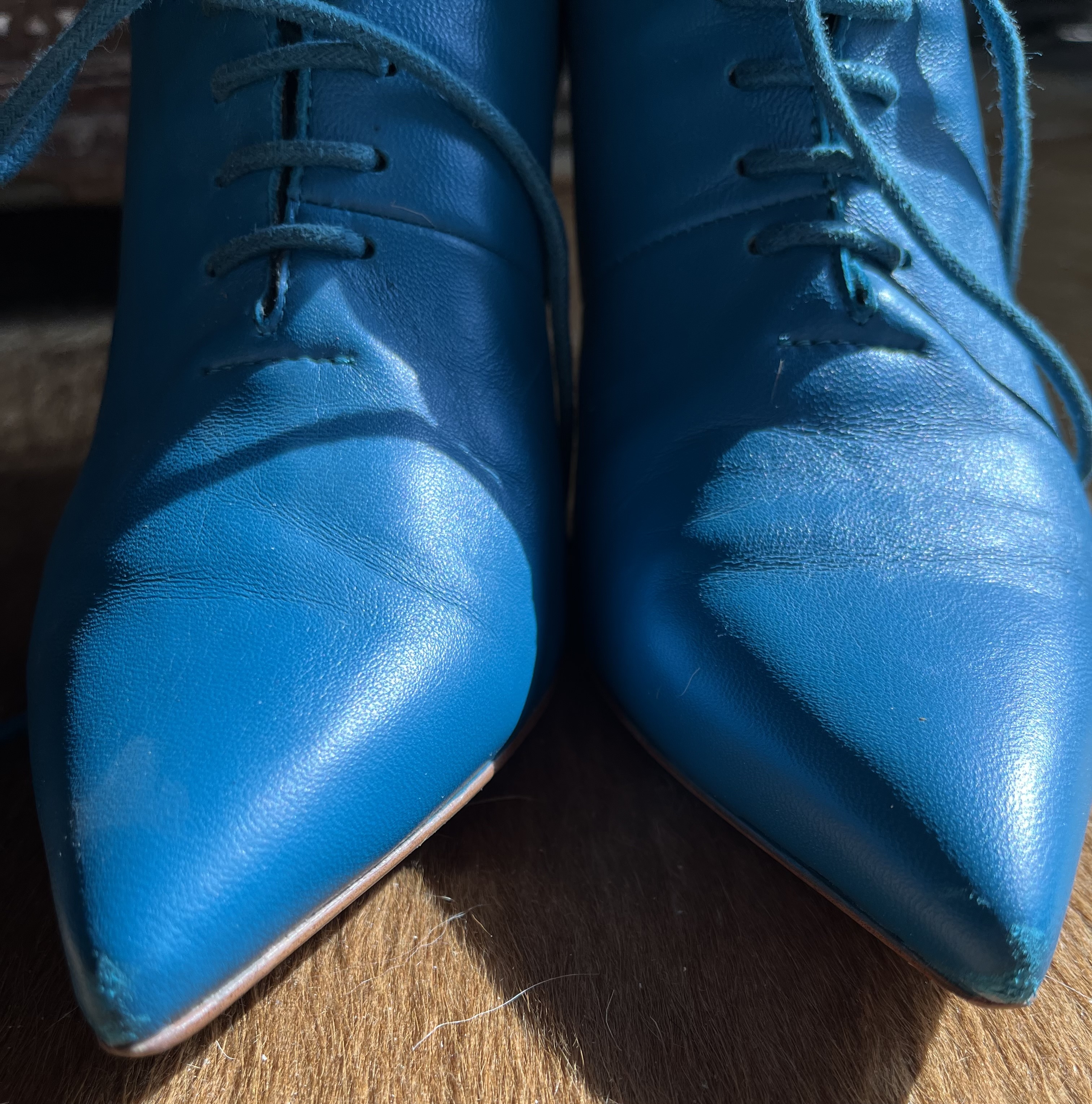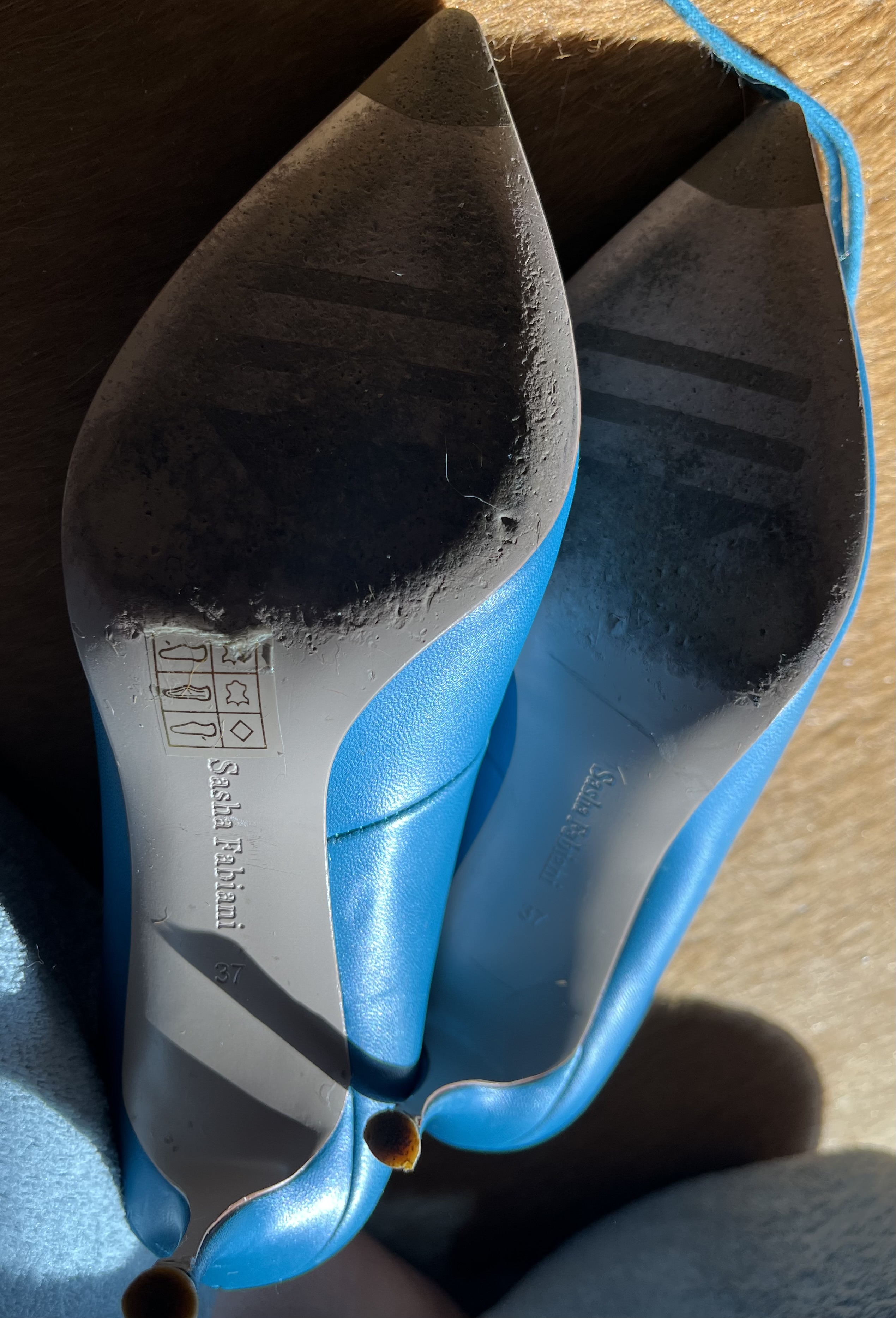 사진엔 컬러가 조금 환해 보이는 블루같은데요 실물은 다운된 teal blue 입니다 더 멋쟁이 컬러죠 한국에선 이런 컬러를 잘 쓰지 않을꺼예요 조합하여 섞이기 힘든 컬러라 그럴테죠 하지만 유럽이나 미국, 이 컬러를 참 여기저기 많이씁니다 보태가 베네타의 꼬임백에도 틸 블루가 있고 커튼, 슈즈, 백, 심지어 의류에도 사용하지요 옆모습의 잘빠진 곡선이 얄상하니 잘 빠졌습니다 세련됨까지 갖췄구요 부들부들양가죽임에 틀림없어보입니다 샤샤 파비아니라는 브랜드인데 제 생각엔 Spain 산 같군요 한가지 쬐금 안타까운부분은 부츠 앞 코에 미세한 까짐이 있는데 실물로 보면 아무것도 아닌 아니 찾아보지않으면 뵈지도 않을 흠이라 걱정은 붙잡아 주셔도 좋습니다 부츠바닥의 몇번 신은 흔적 - 상관없는 부분이죠- 이외에는 굉장히 좋은 컨디션입니다 37 size 볼 좁은 240. 포인트 제품